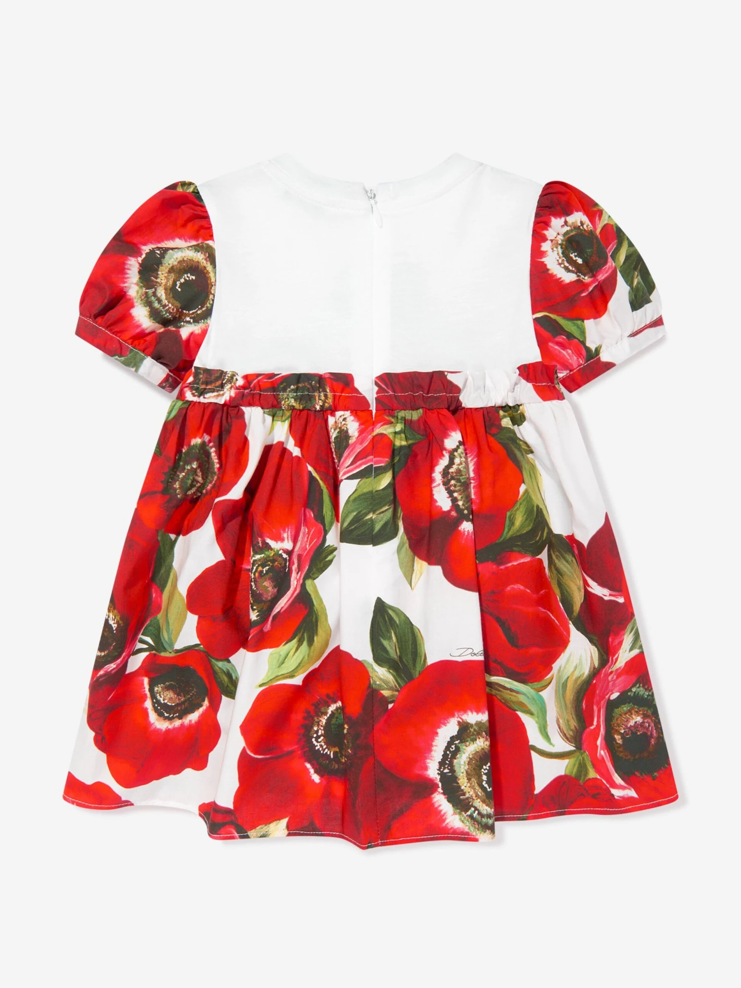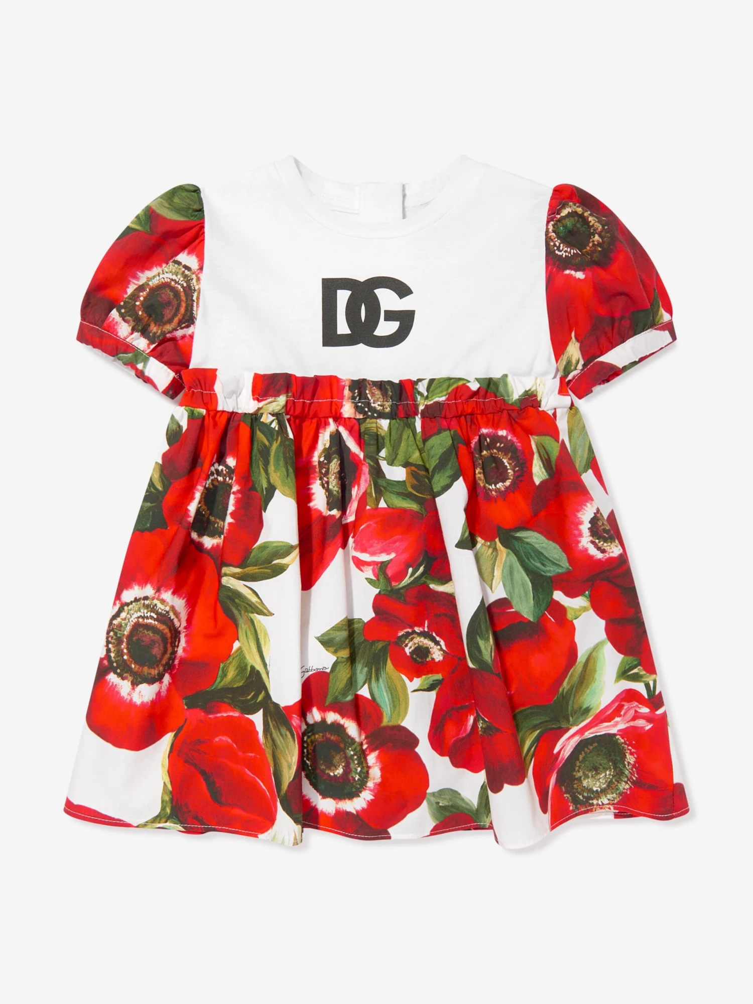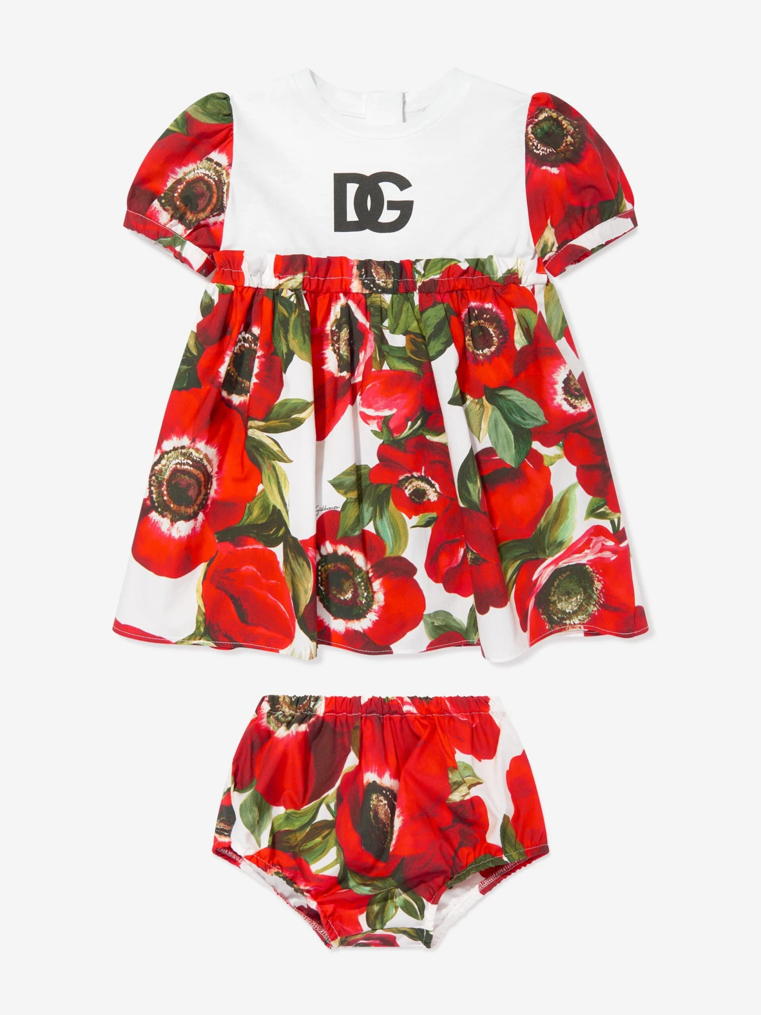 Dolce & Gabbana incorporate innovative materials with vintage abstracts into coexisting spaces. This baby girls dress set embodies sleek and enigmatic sophistication. As part of the Flower Power collection which takes inspiration from the 1960s and the quintessential feel of the Mediterranean. It is crafted in beautiful cotton poplin with Anemone and DG logo print.