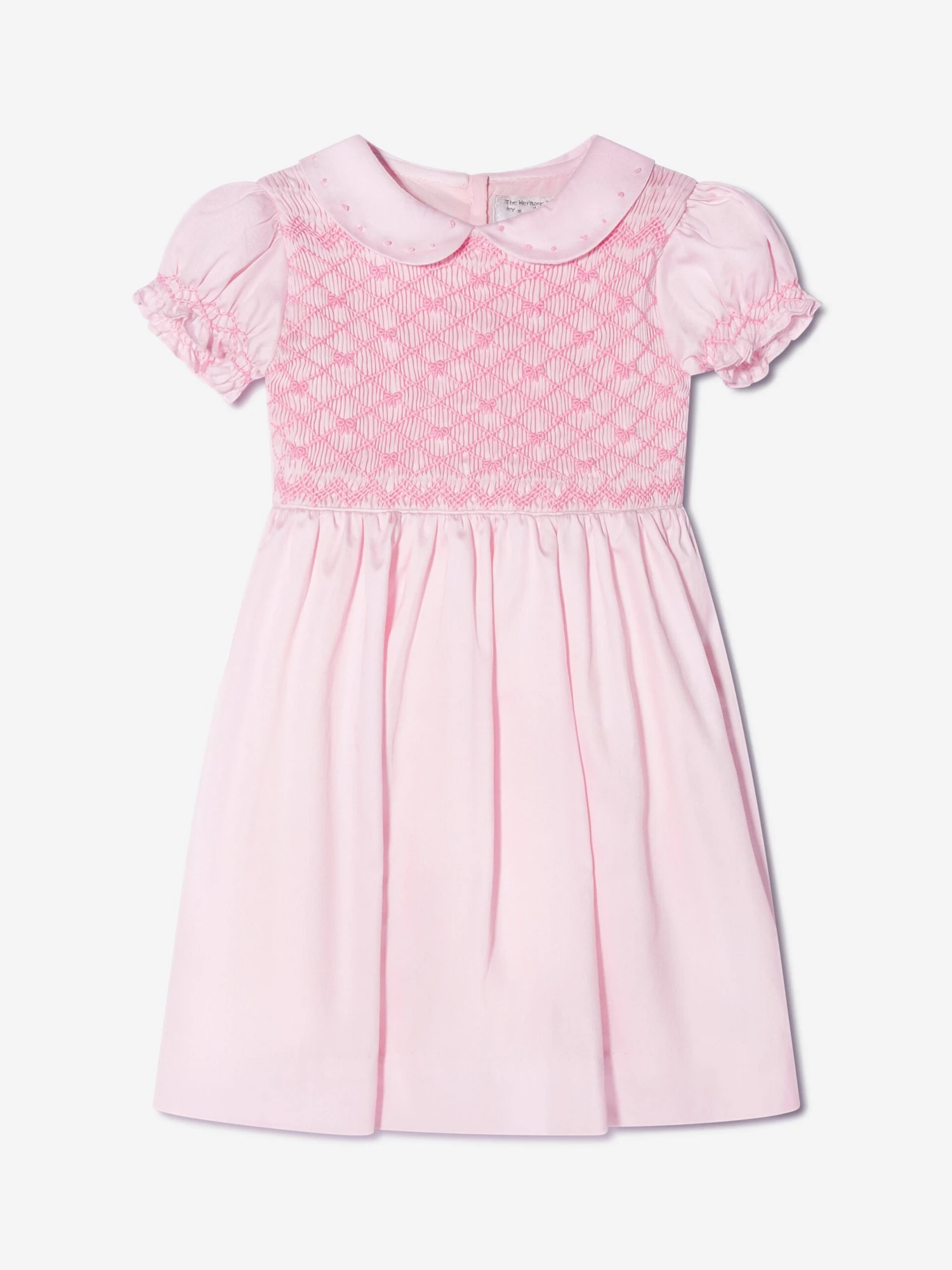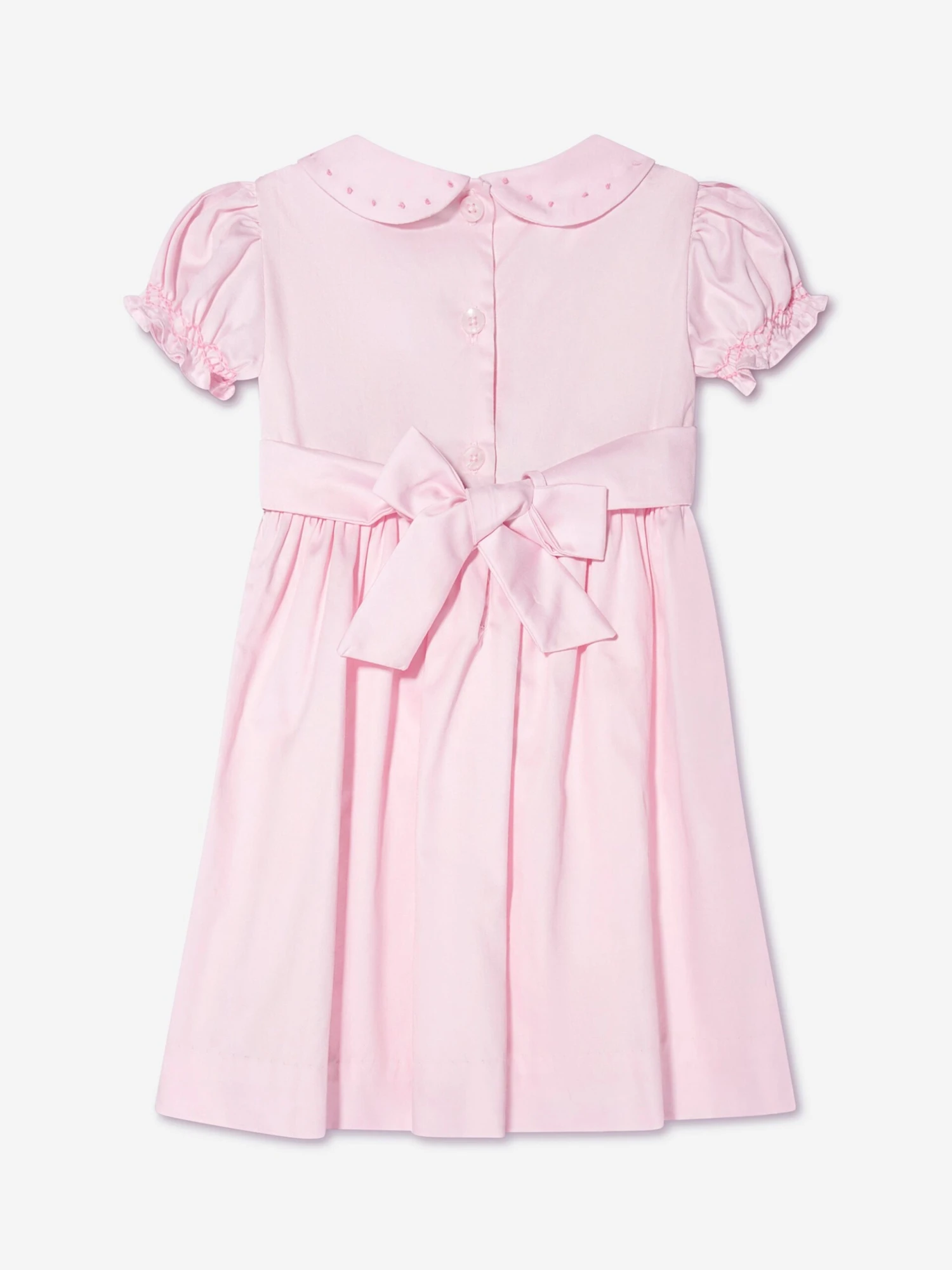 Rachel Riley’s traditional craftsmanship is embodied in this baby girls rose smocked dress in pink. As part of the heritage collection and nod to King Charles’ III coronation, it has been made with the finest construction and imperial care. Depicted in a rosy pink, it features an intricate bow stitching on a gathered bodice with a dotted Peter Pan collar, back tie-up ribbon and button fastening. The exquisite craftsmanship is complete with elasticated puffy sleeves, layered lining and matching bloomers.