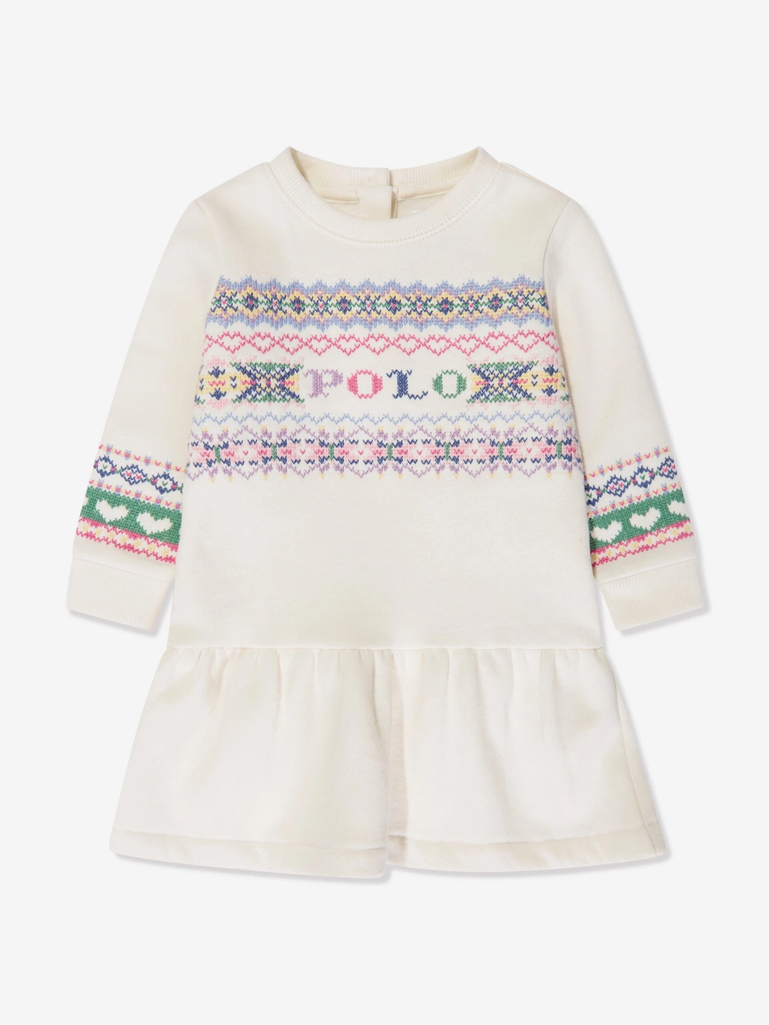 Introducing Ralph Lauren’s Baby Girls Fairisle Dress in Ivory, an adorable and luxurious addition to your little one’s SS2024 wardrobe.