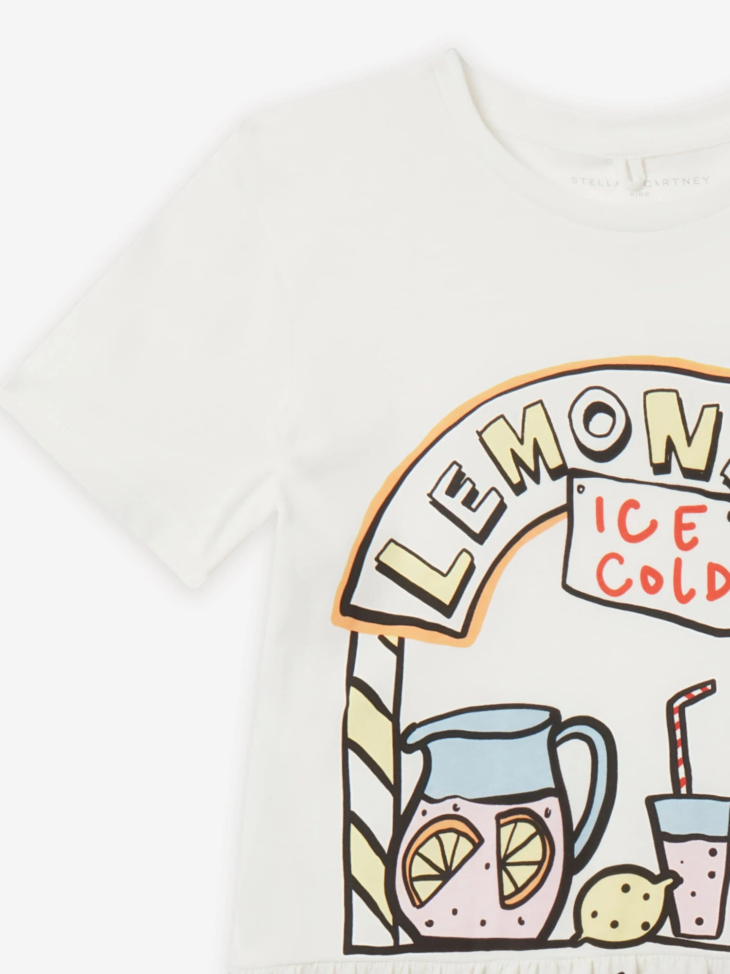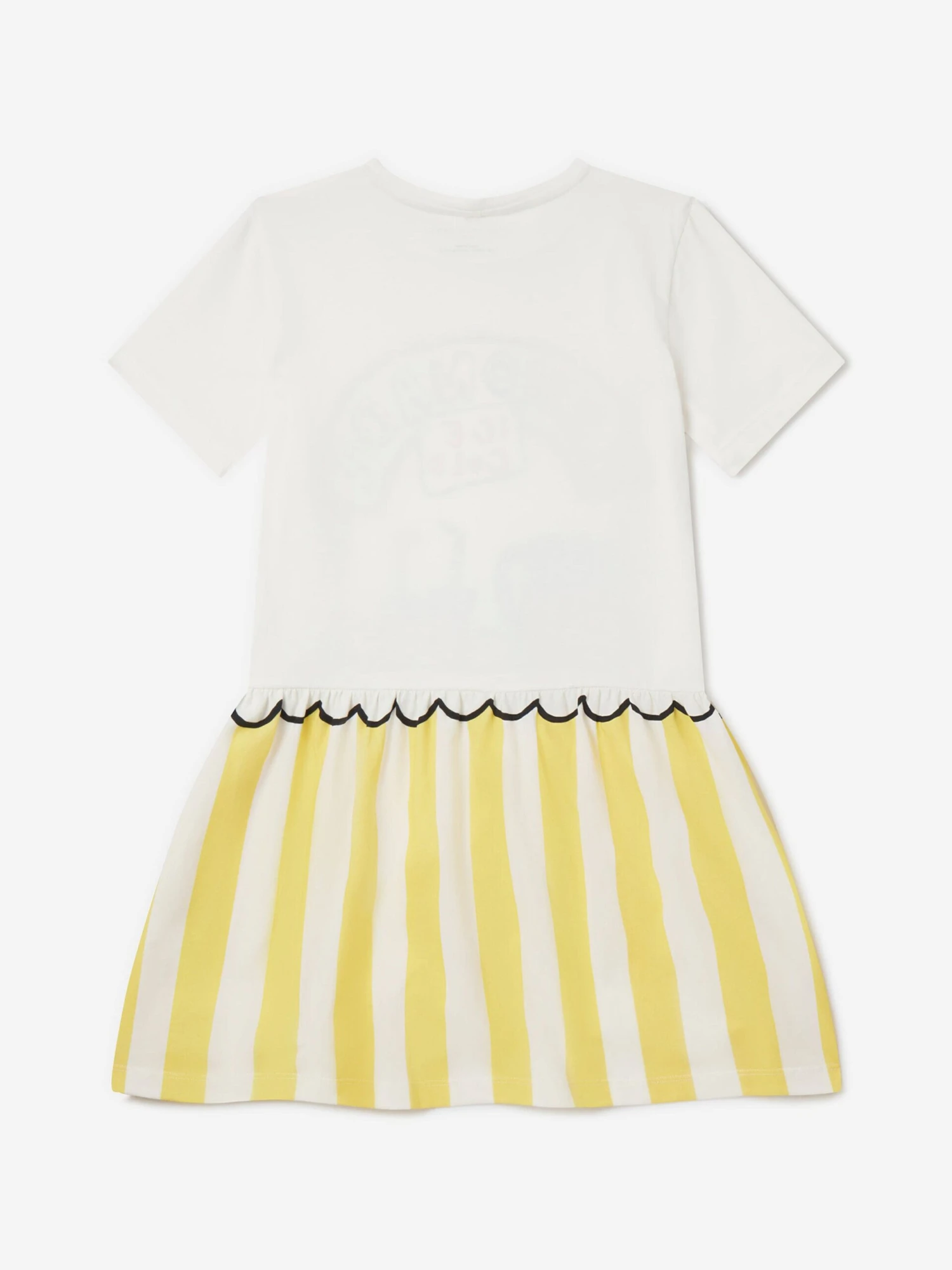 Stella McCartney contemplate eco-friendly fabrics into joyful loud graphics with an optimistic edge. This baby girls ivory t-shirt dress captures the British label’s passion for innovation. Crafted in beautiful cotton jersey with a large print in yellow, pink and light blue with a stall selling lemonade. The skirt has wide, vertical stripes in white and yellow. She will look and feel divine.