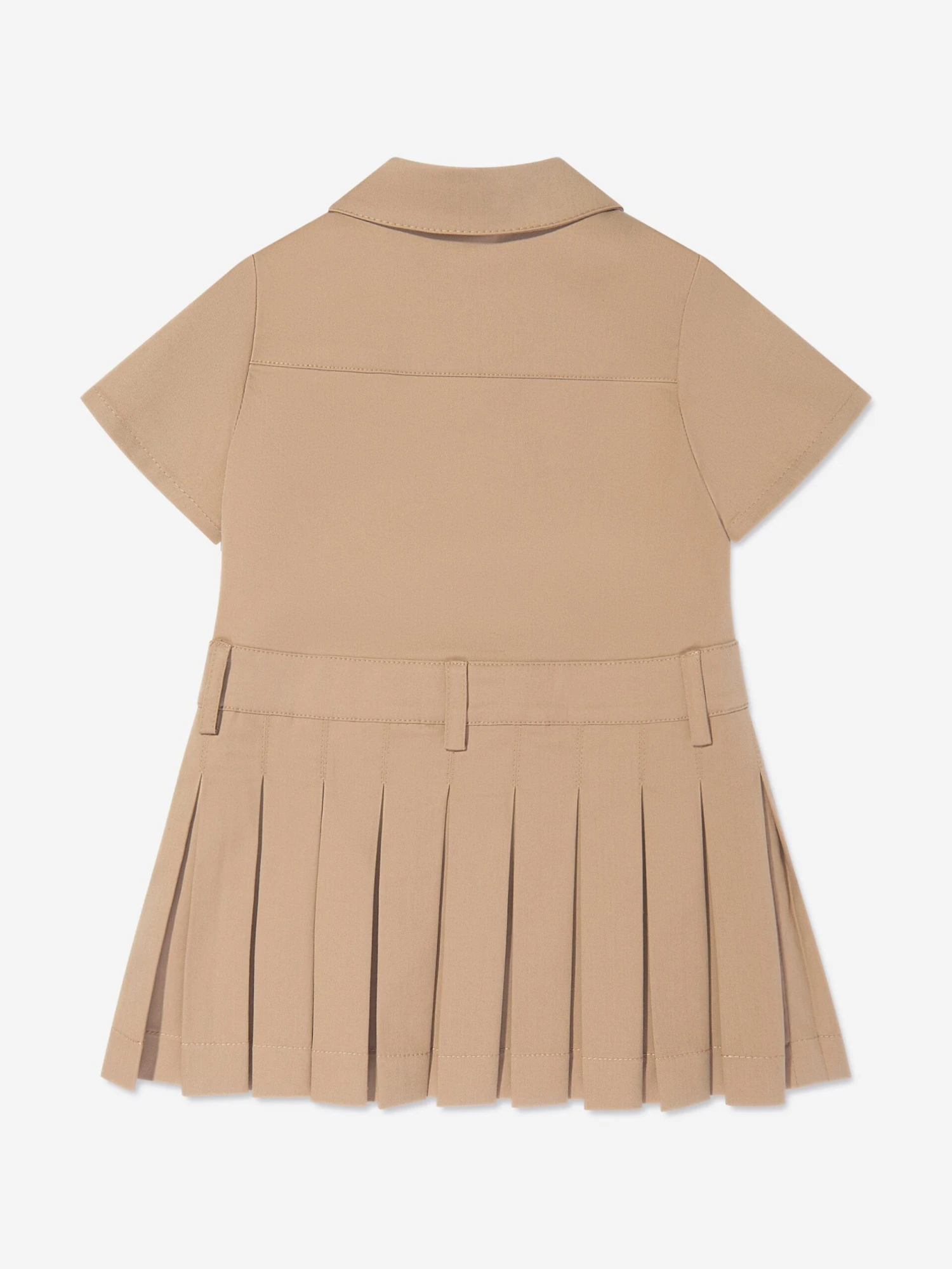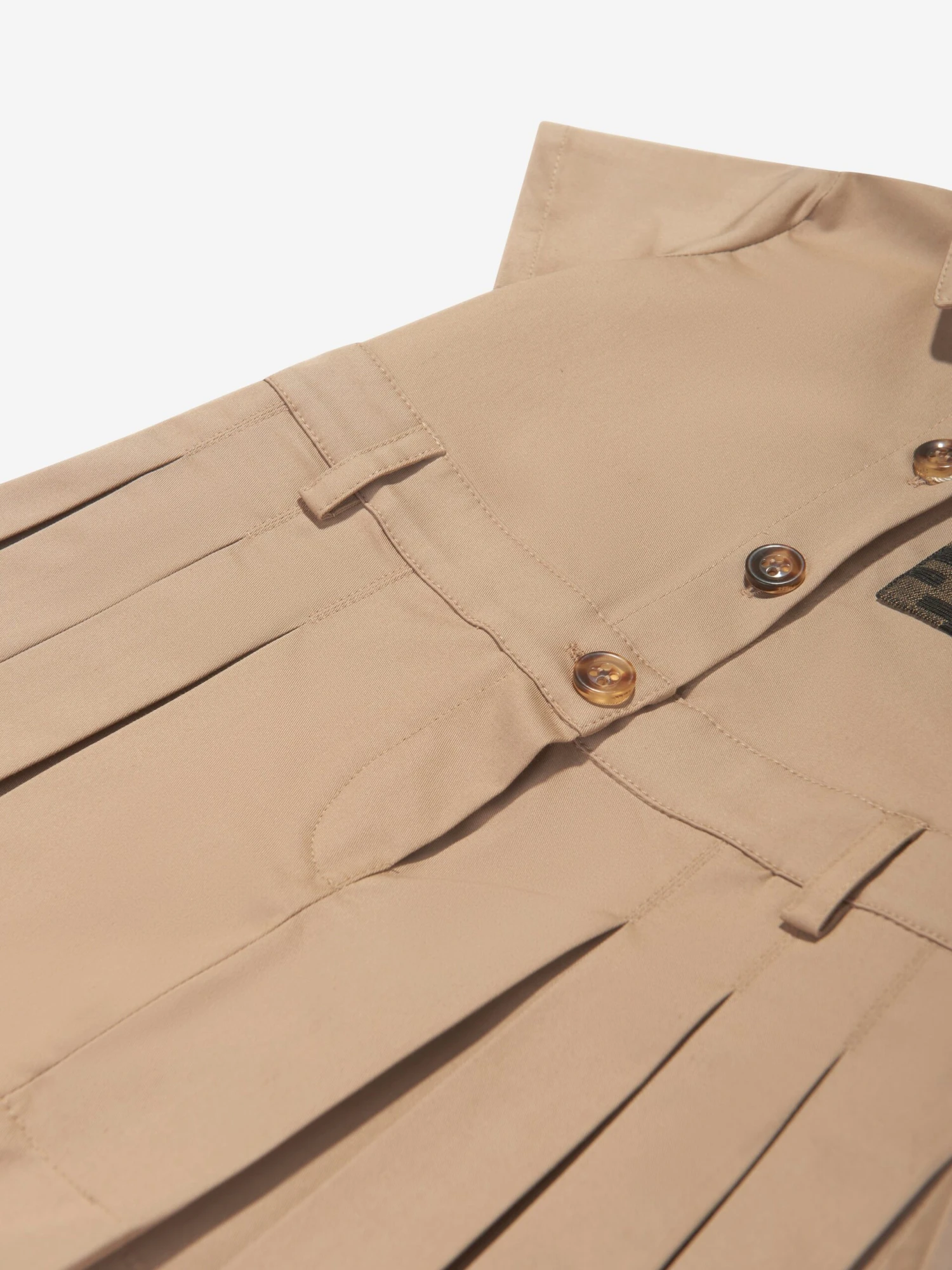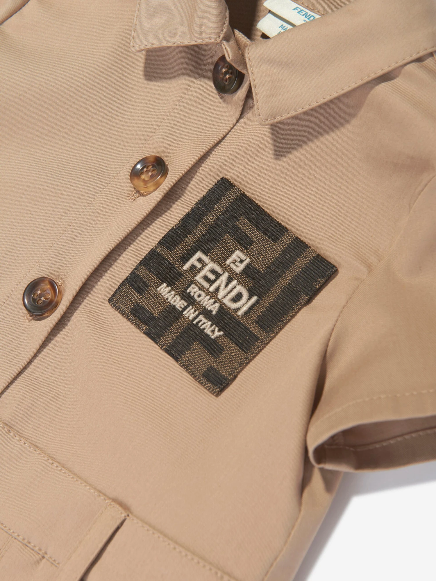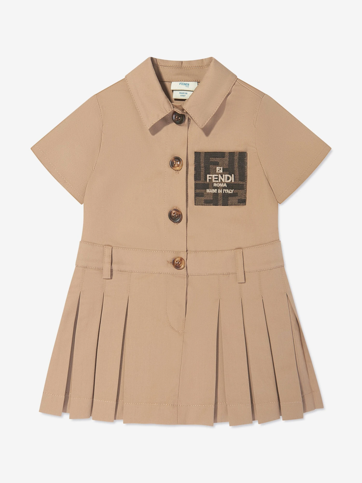 Luxury Italian label Fendi envision new aesthetic properties into traditional abstracts. This baby girls shirt dress is reflective of the label’s preference for sleek, utilitarian fashion. Crafted in beige gabardine with a pleated skirt, collar, dainty tortoise shell buttons on the front and a jacquard patch with a tobacco FF logo.