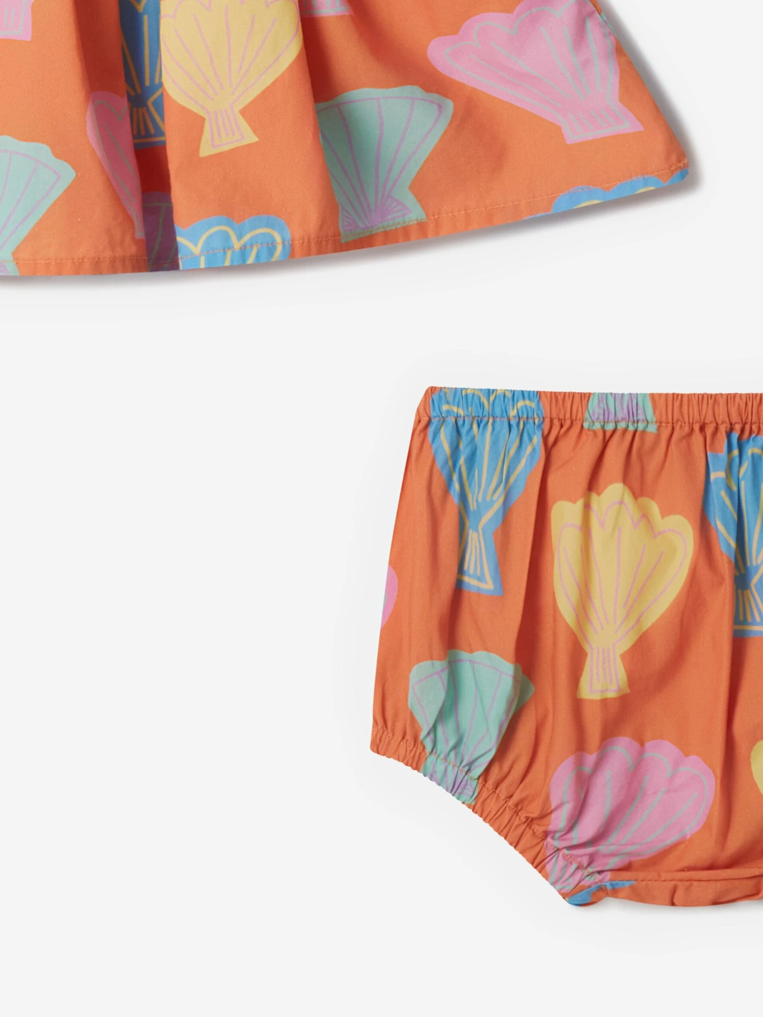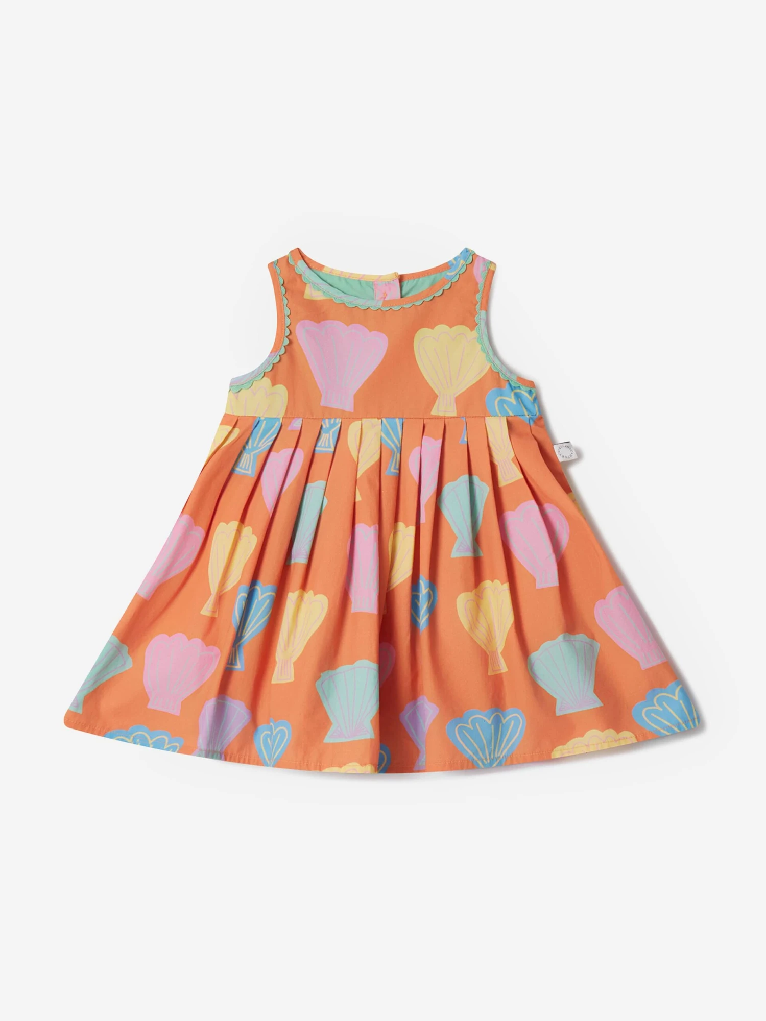 Stella McCartney incorporate excellent construction and vivid imagery into their beautiful aesthetics. This shell print multicoloured print dress is a charming choice. It showcases a sleeveless design via matching, elasticated bloomers. Perfect for summertime.