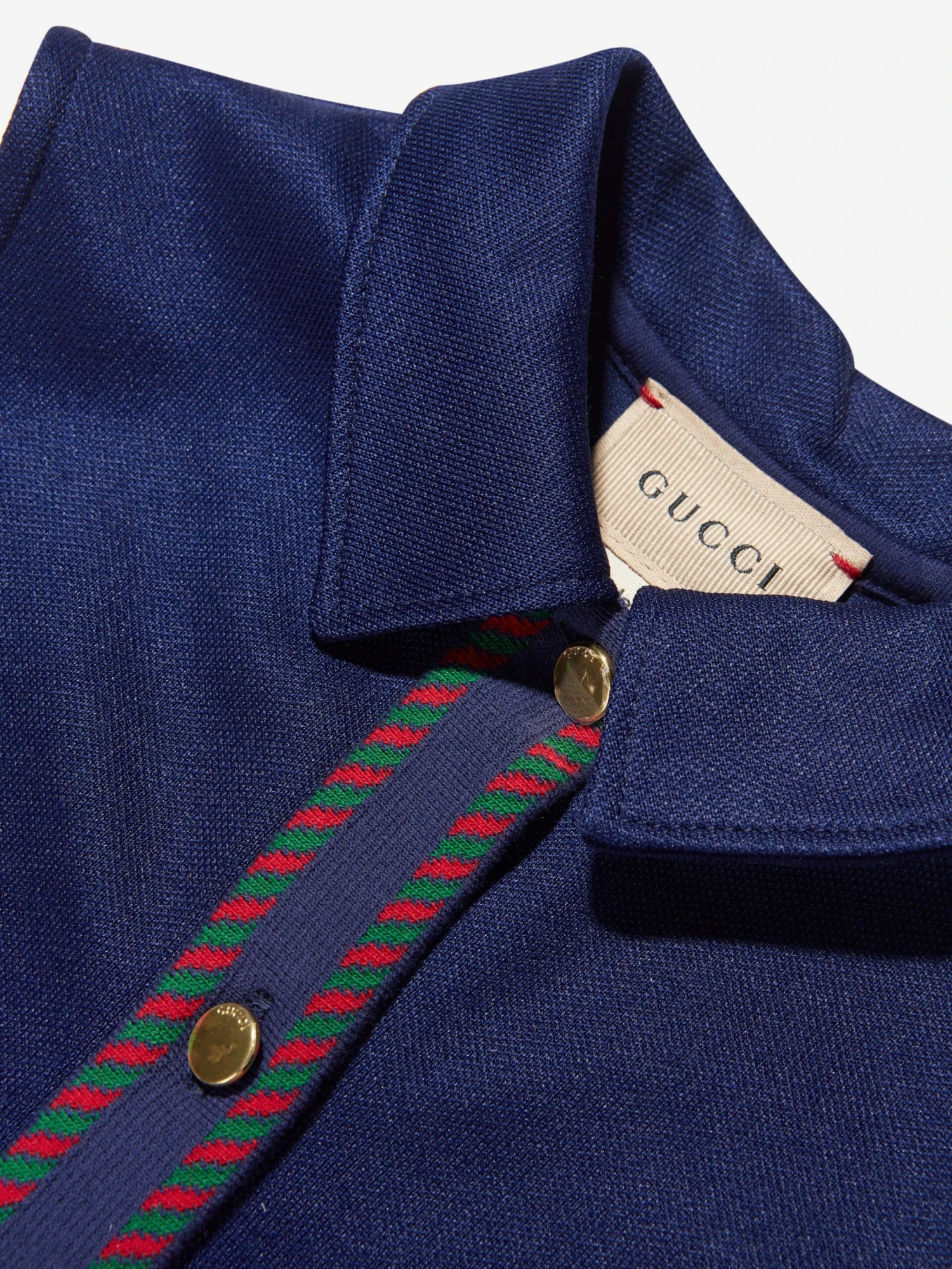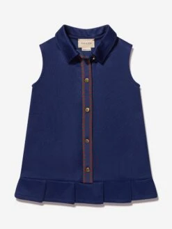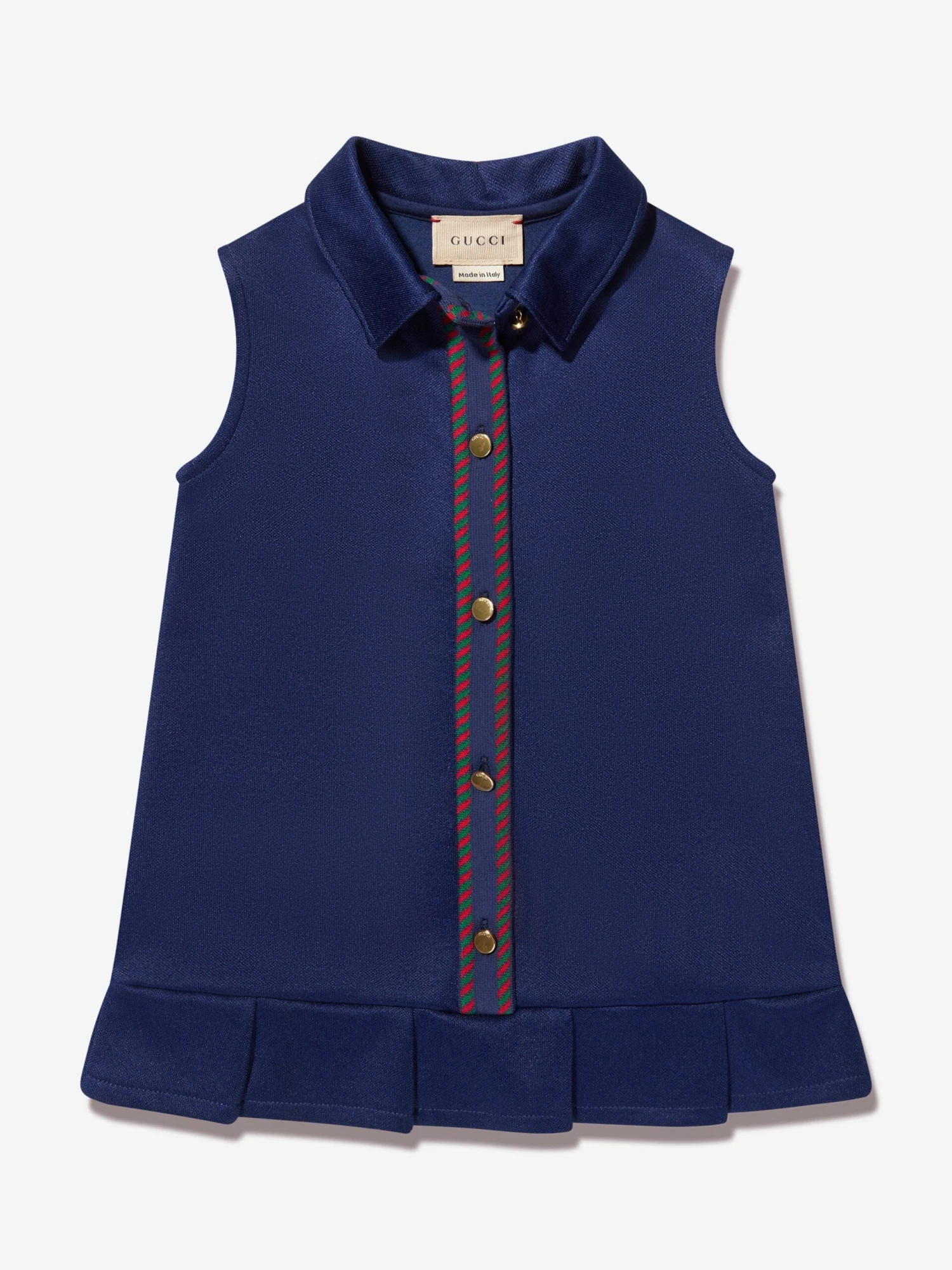 • Wardrobe Essential: Boost your baby girl’s wardrobe with this stylish Baby Girls Sleeveless Dress in Navy from the House of Gucci in sublime blue. Order today and let her stand out in sheer elegance!