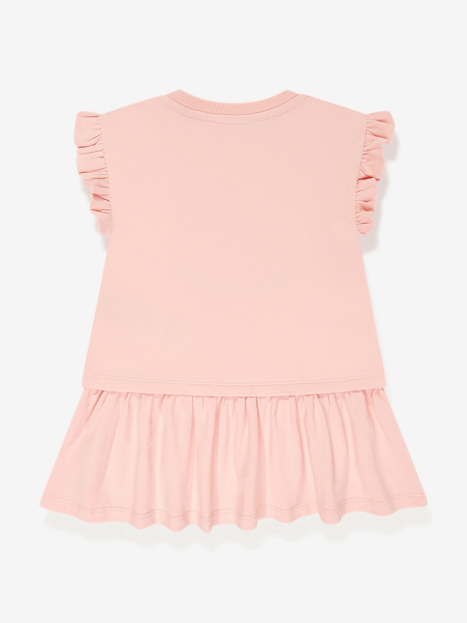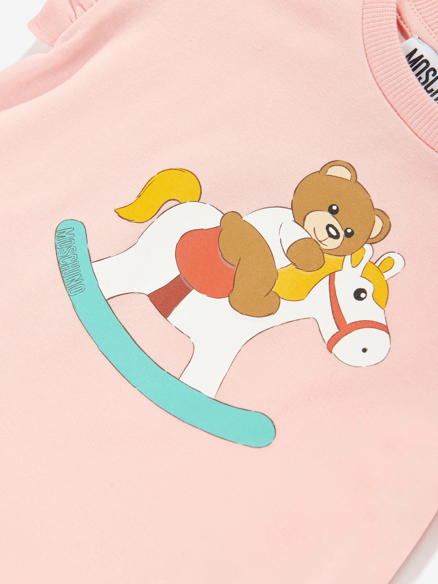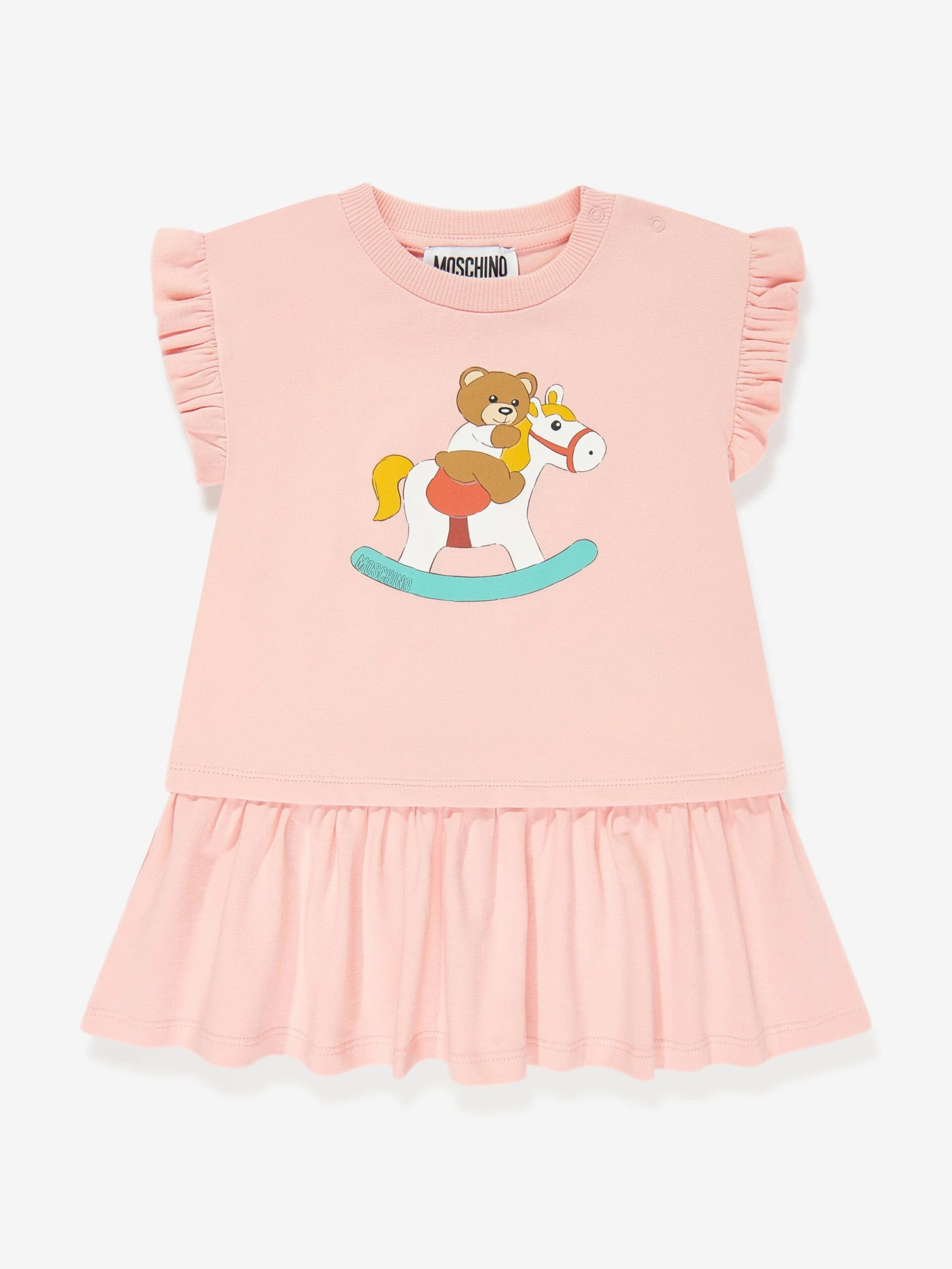 Moschino incorporate energy and a wistful elegance into their Italian designs. This baby girls t-shirt dress is reflective of the House’s passion for the teddy bear motif and it’s reconceptualised forms. It features a teddy bear on a rocking toy horse graphic with statement Moschino print and a classic peplum hem. She will look effortlessly stylish and adorable.