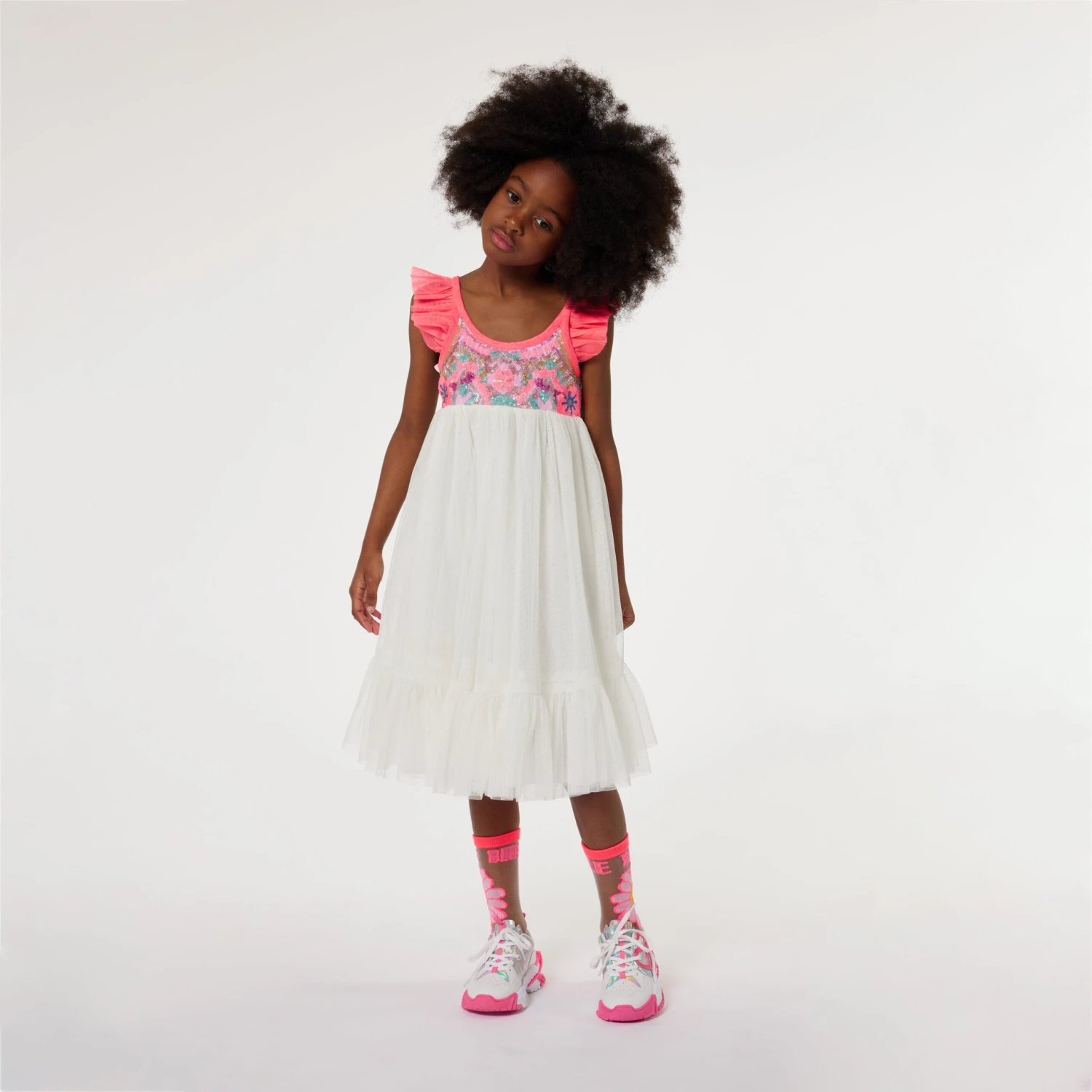 Adorn your girl’s wardrobe with this elegant Sequinned Tulle Dress in White from Billieblush. Watch her shine brighter!