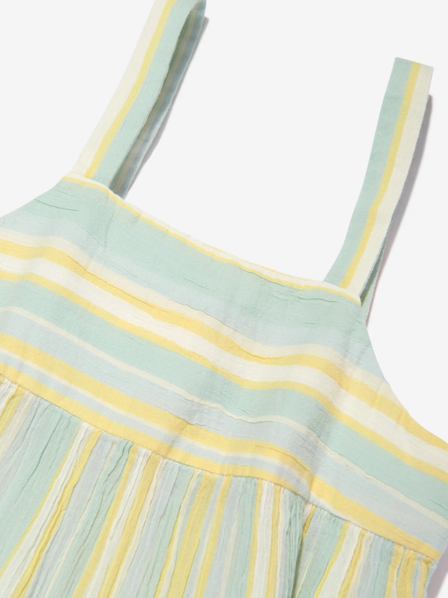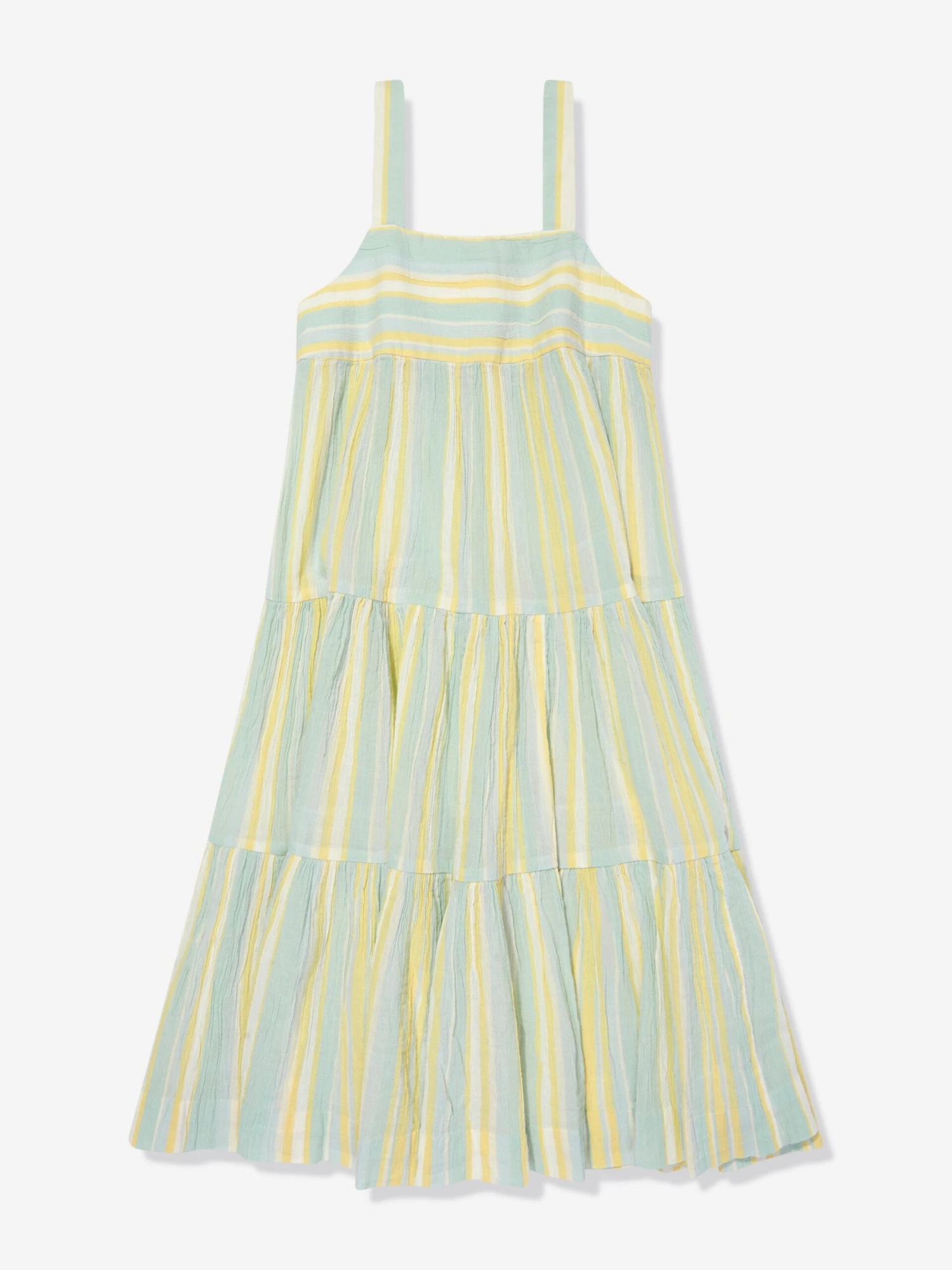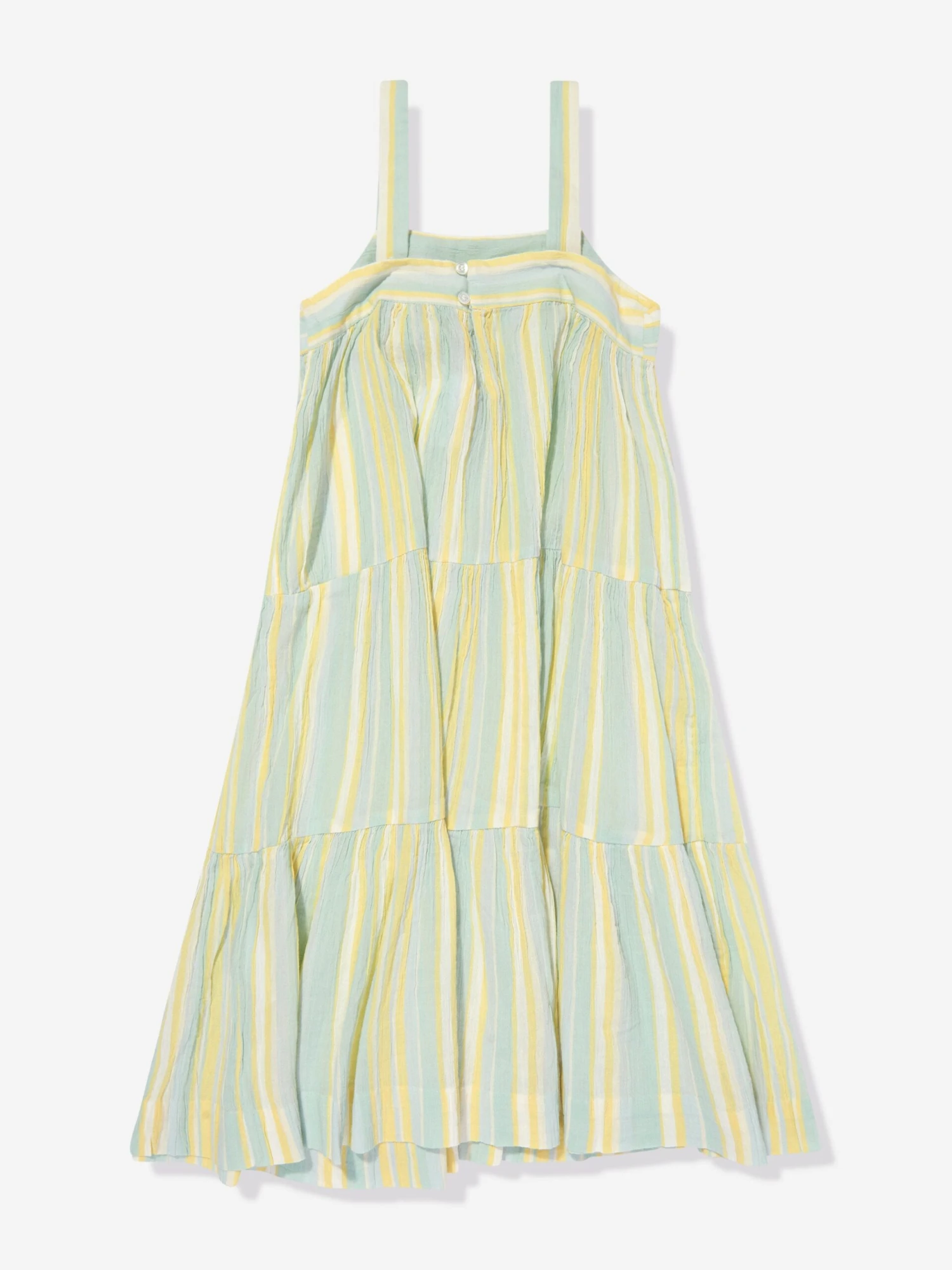 Bonpoint embody mesmeric concepts in their sophisticated aesthetics. This girls Lagon dress captures the French label’s passion for high quality and reconceptualisation of traditional abstracts. Envisioned in lagoon-blue striped cotton crepe via crossed straps, tiered sections and two button loops. The flared skirt features three layers of overlapping ruffles.