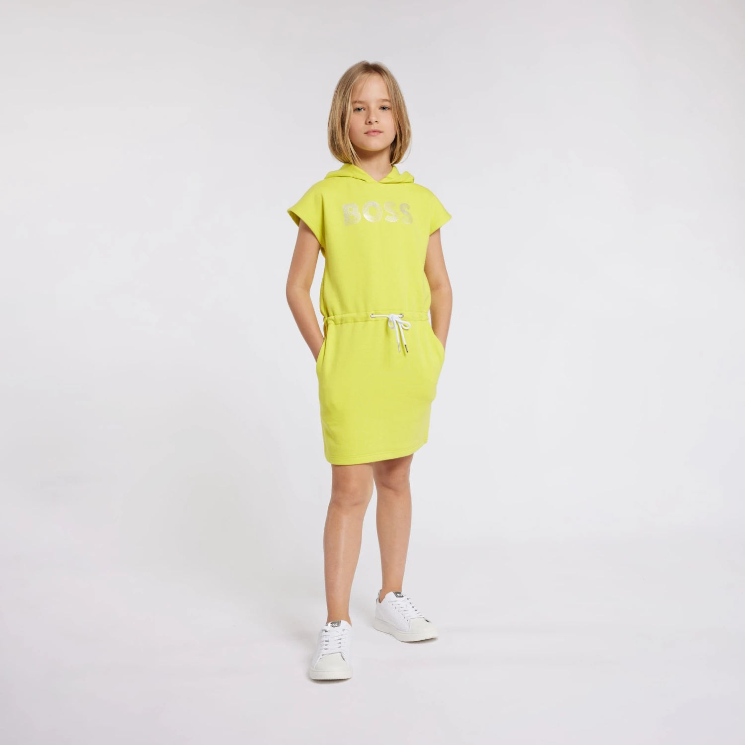 Elevate your girl’s fashion game with our Hooded Sweater Dress in Yellow, courtesy of Boss. Order now and set the stage for her to dazzle!