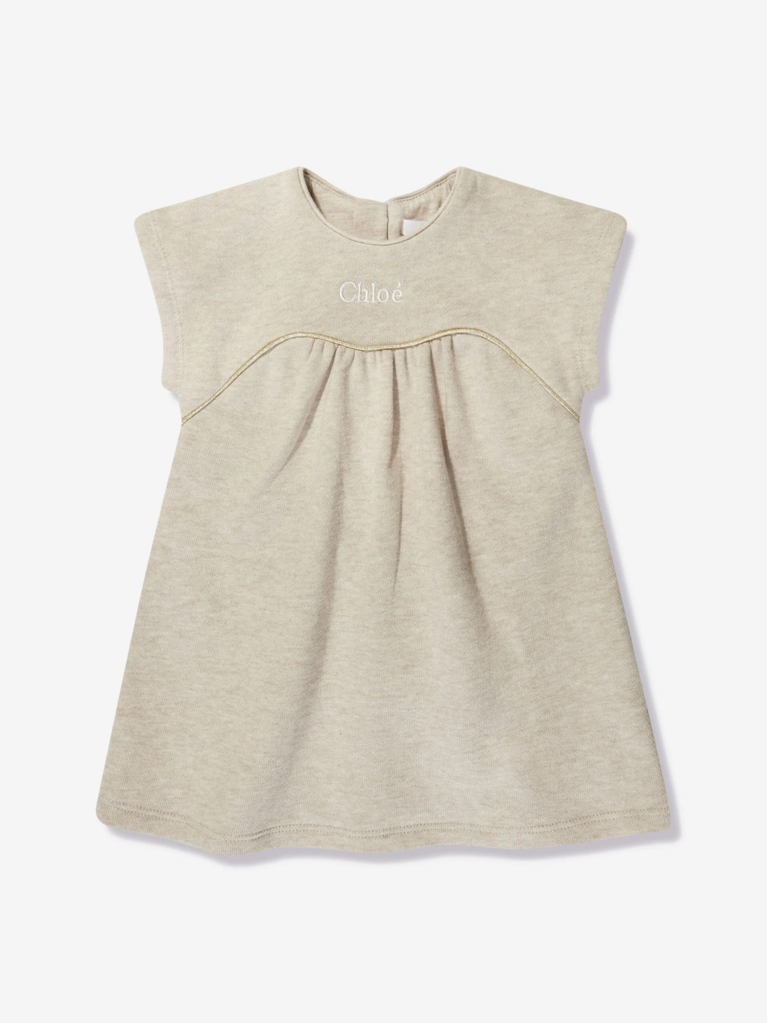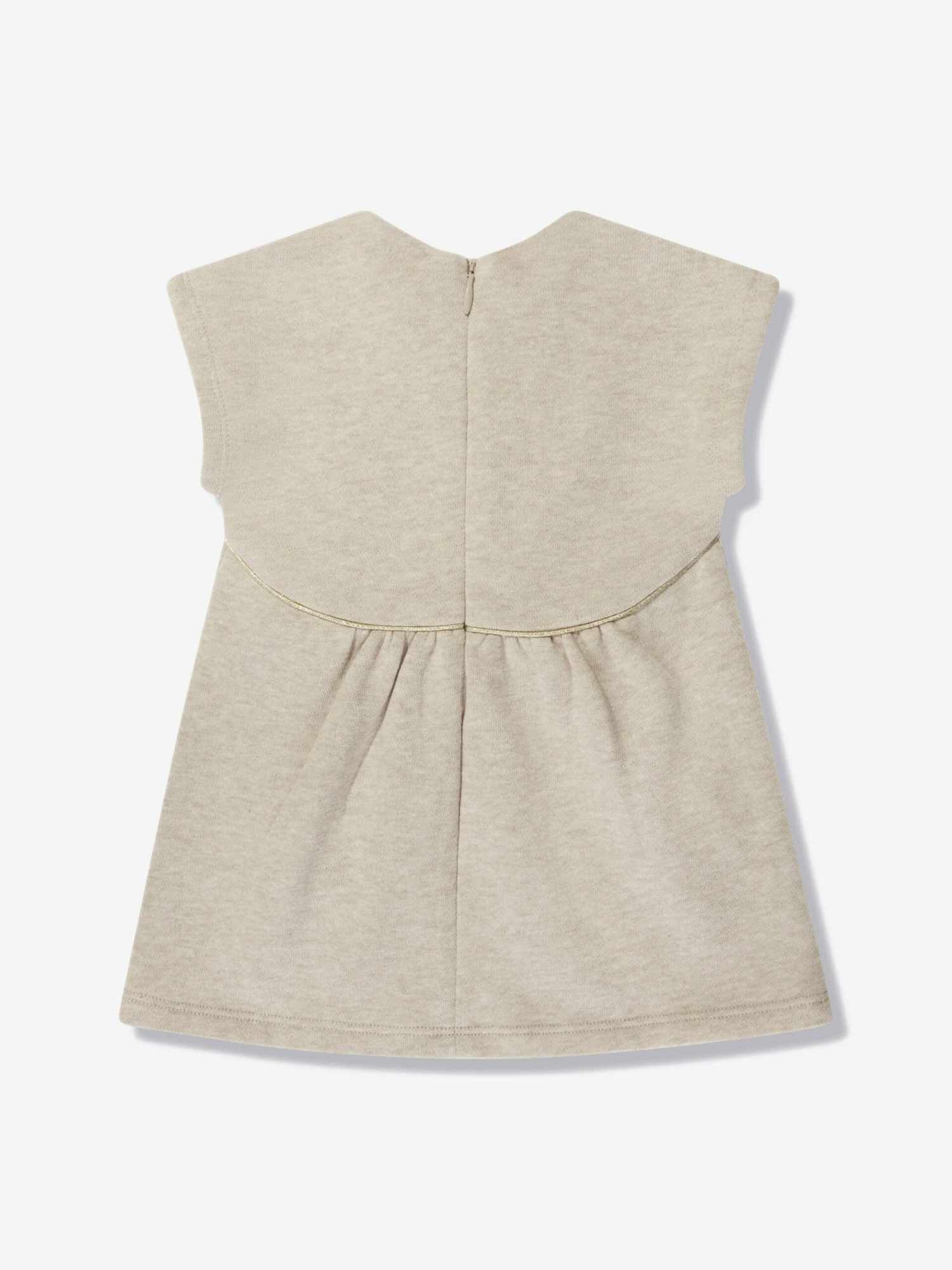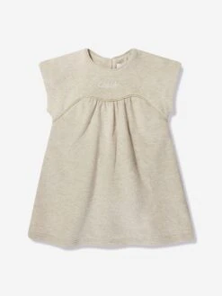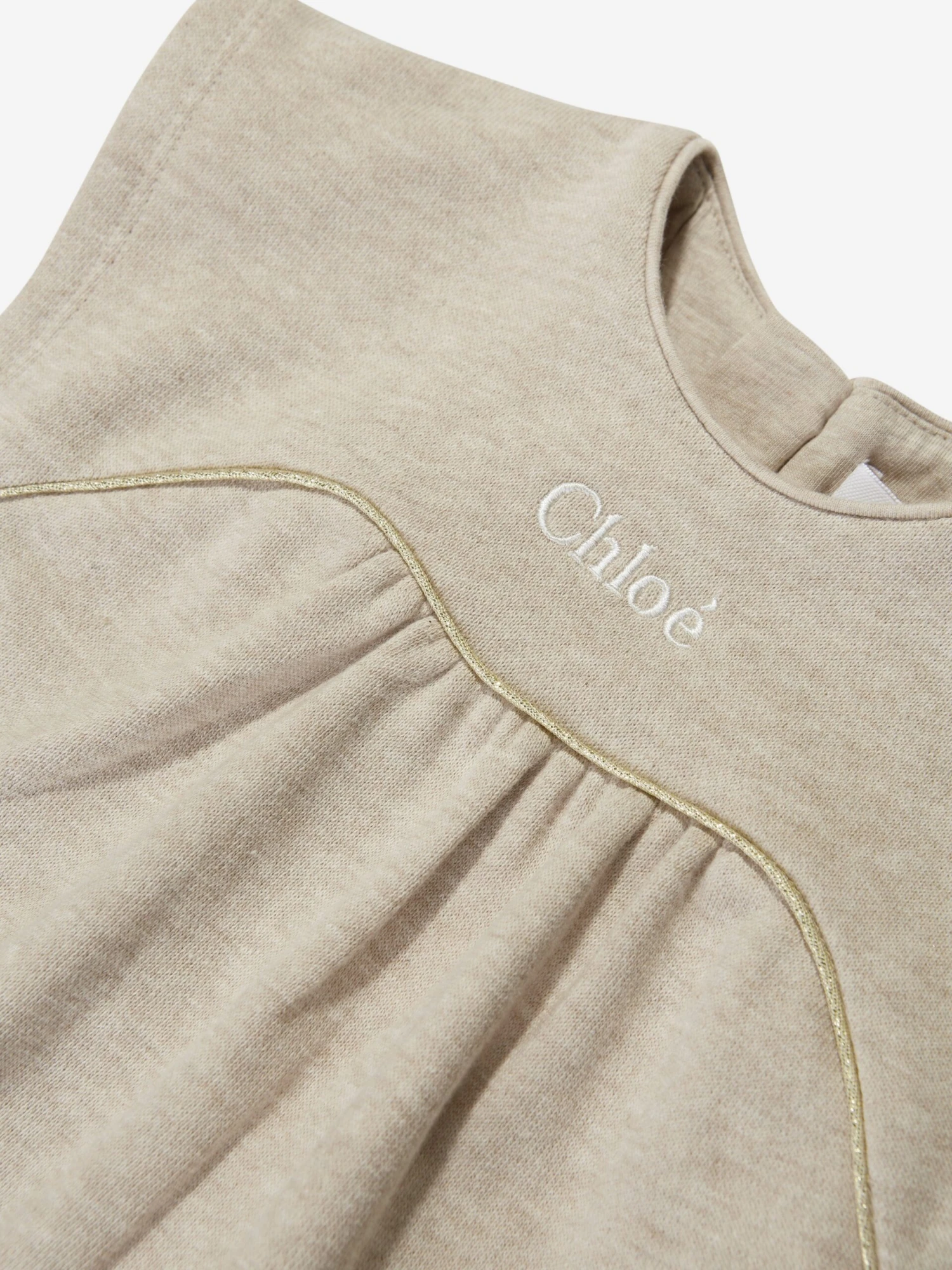 Parisian label Chloé incorporate exquisite materials into their beautifully crafted designs. This baby girls beige marl short sleeved t-shirt dress is reflective of the French brand’s meticulous construction and preference for whimsical themes. Crafted with ruffles and golden piping details, signified by classic Chloé embroidery on the chest.