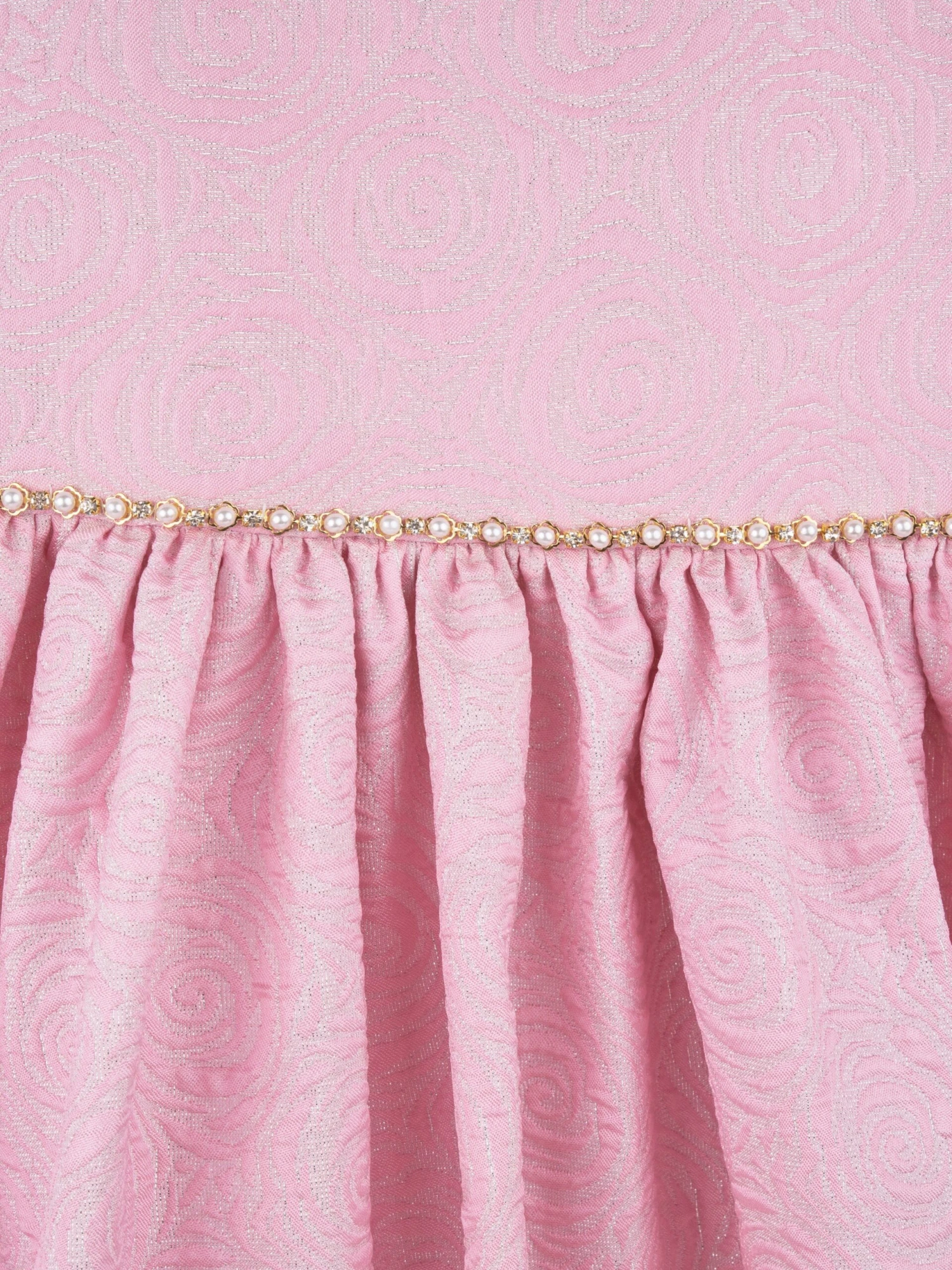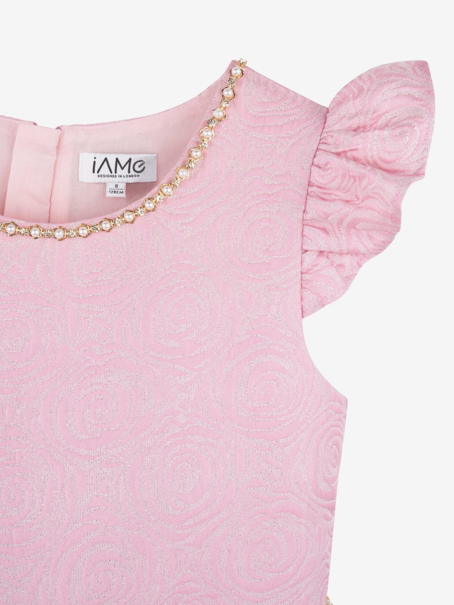 British designer label iAMe amplify Victorian styles into mesmerising innovative pieces. This girls pink allover print dress utilises a captivating aesthetic both charming and sweet. Showcasing a micro pearl and diamanté trim with frill sleeves and rose laser crafted patterning via a silver shimmering effect.