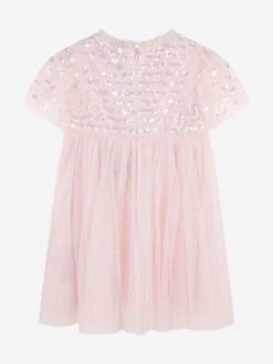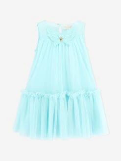 Angel’s Face depict beautiful properties into their flawless abstracts. This girls aqua Caria butterfly dress captures the label’s distinctive craftsmanship and passion for traditional abstracts. Envisioned in beautiful tulle smock via an exquisite voluminous tiered hemline, lace butterfly detail on the front and a signature bow and gold heart charm.