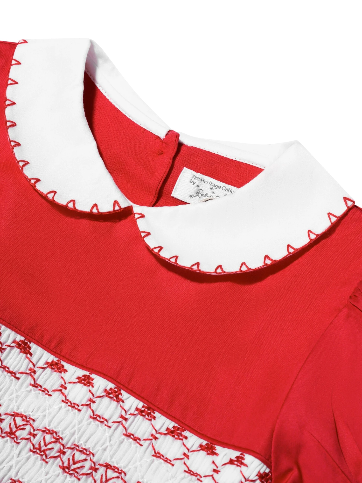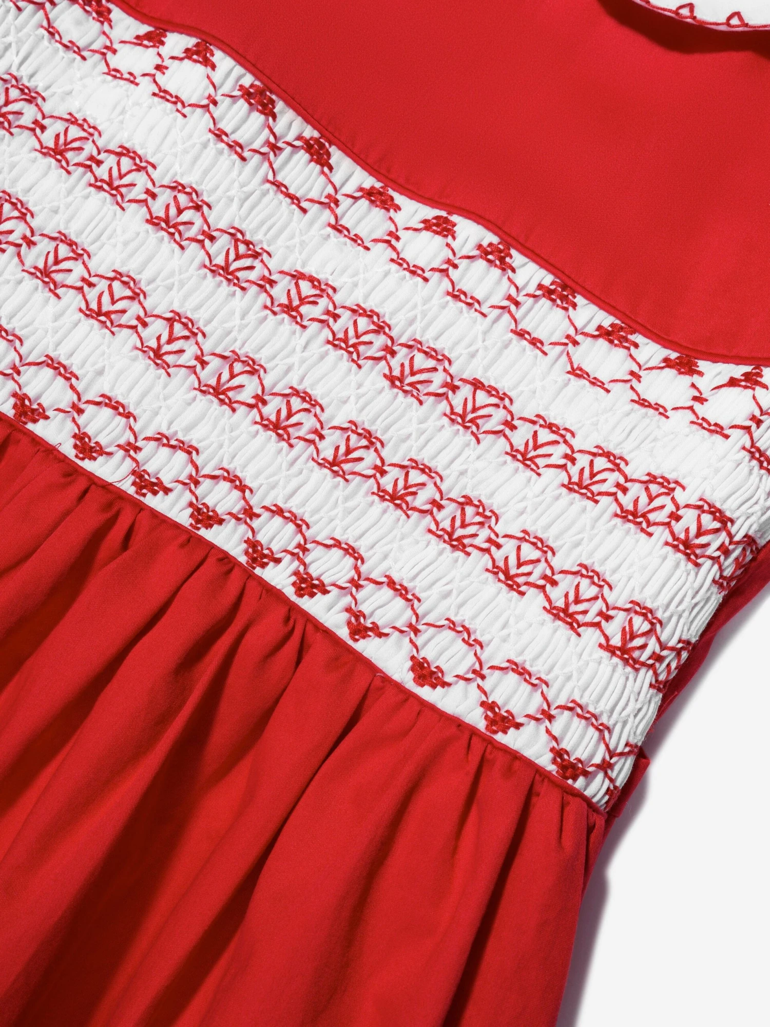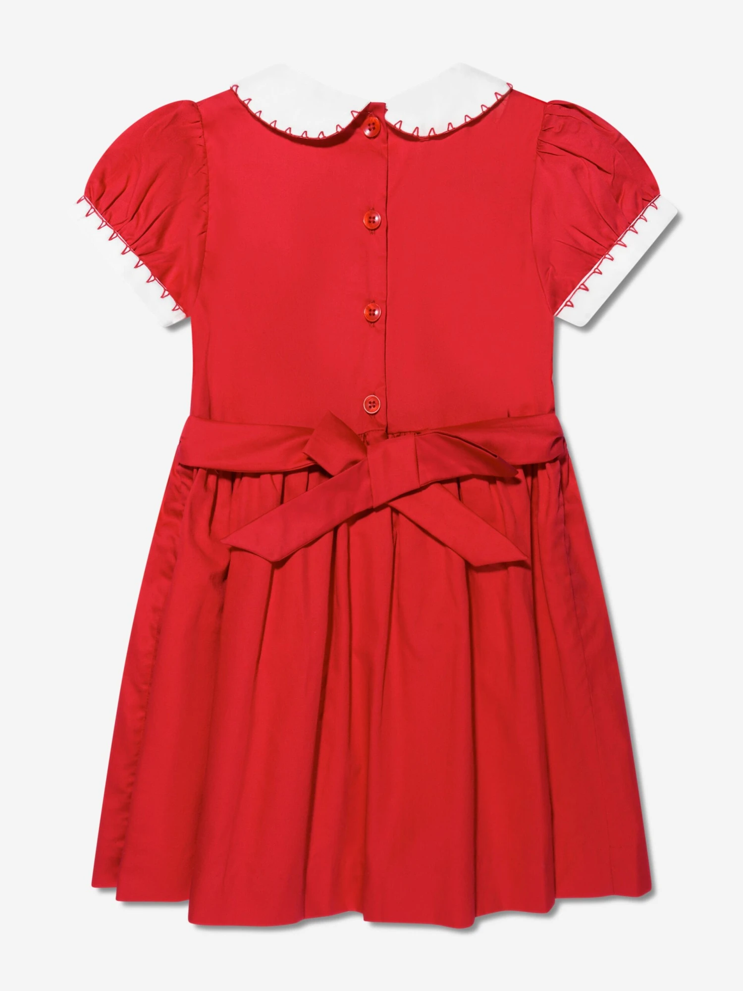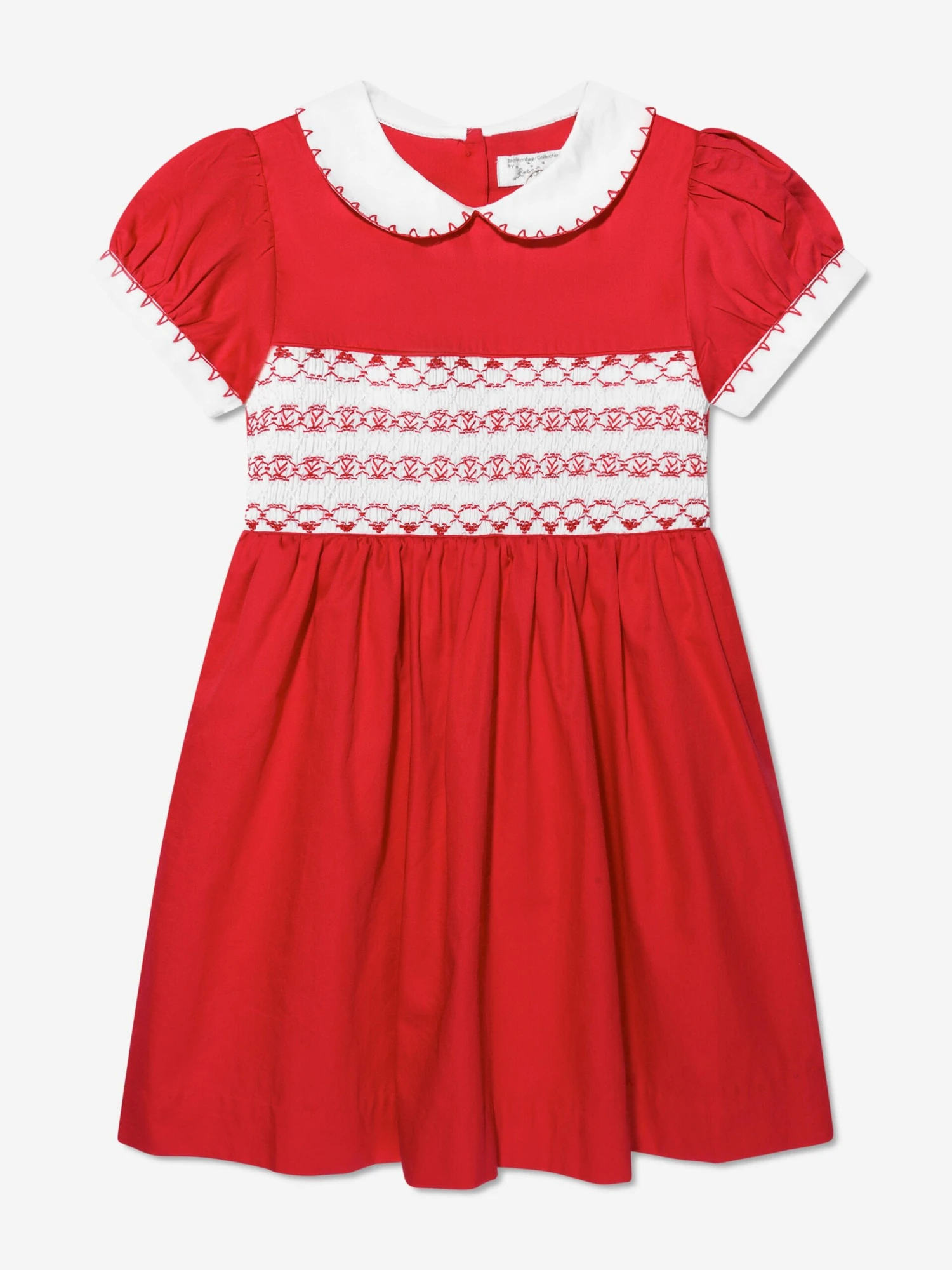 Rachel Riley project mesmeric detailing into their sophisticated hand-embroidered designs. Made with imperial construction, this girls classic smocked dress is reflective of the label’s excellent craftsmanship. Made with a stitched ruched bodice, white Peter Pan Collar and short puffy sleeves. It is complete with a back tie-up bow and button fastening for a cute statement feel.
