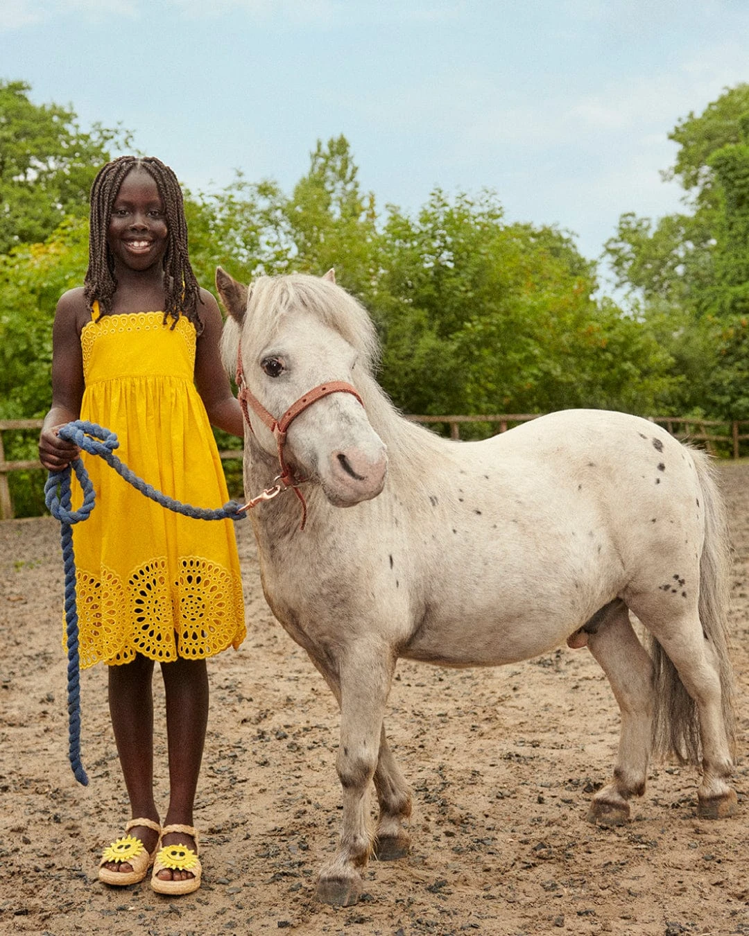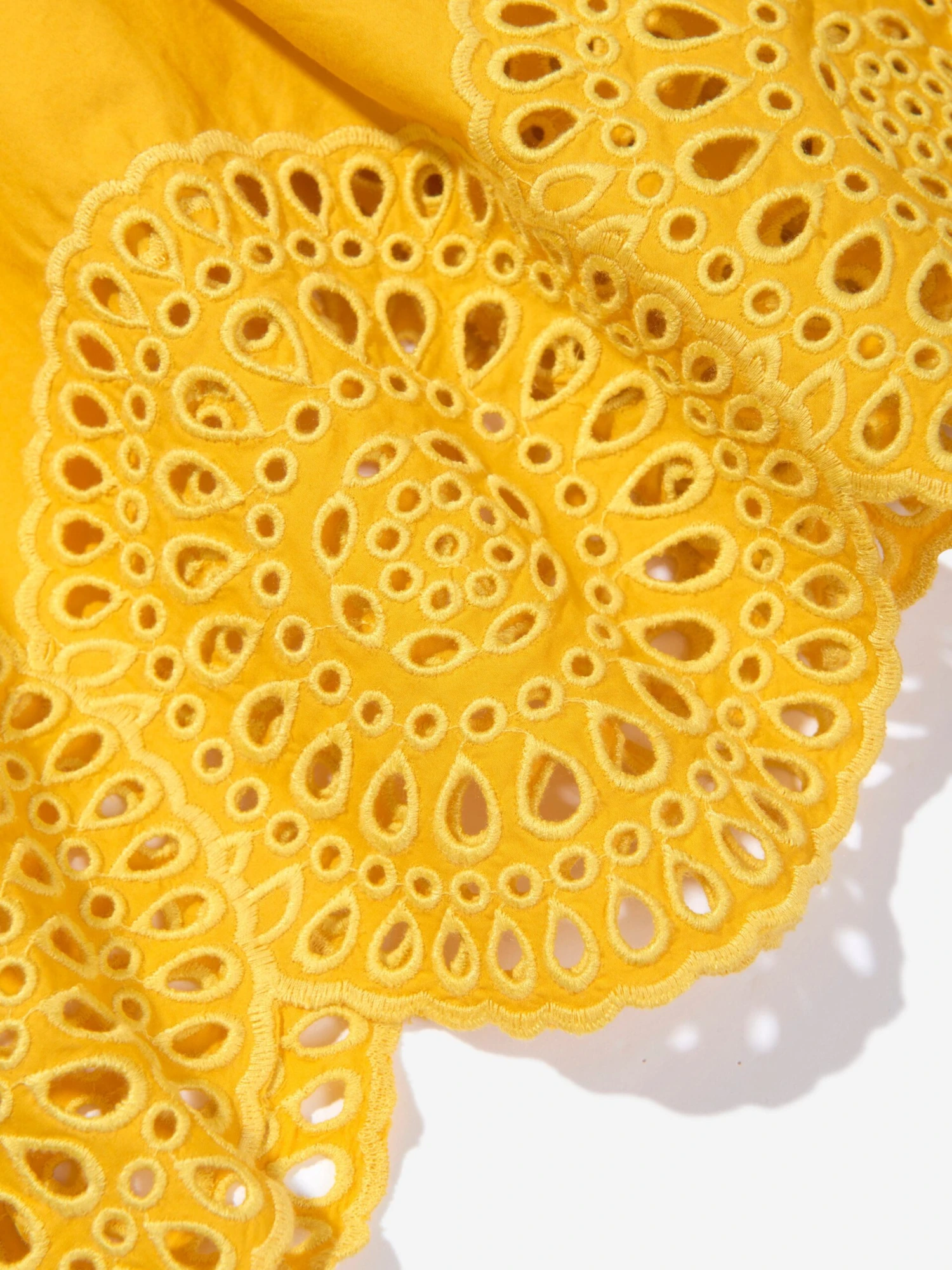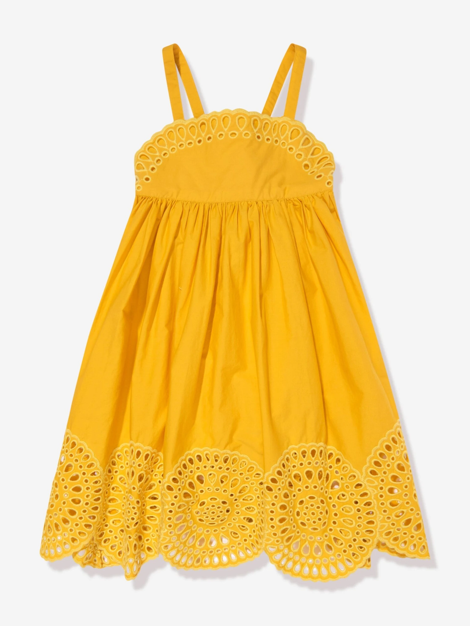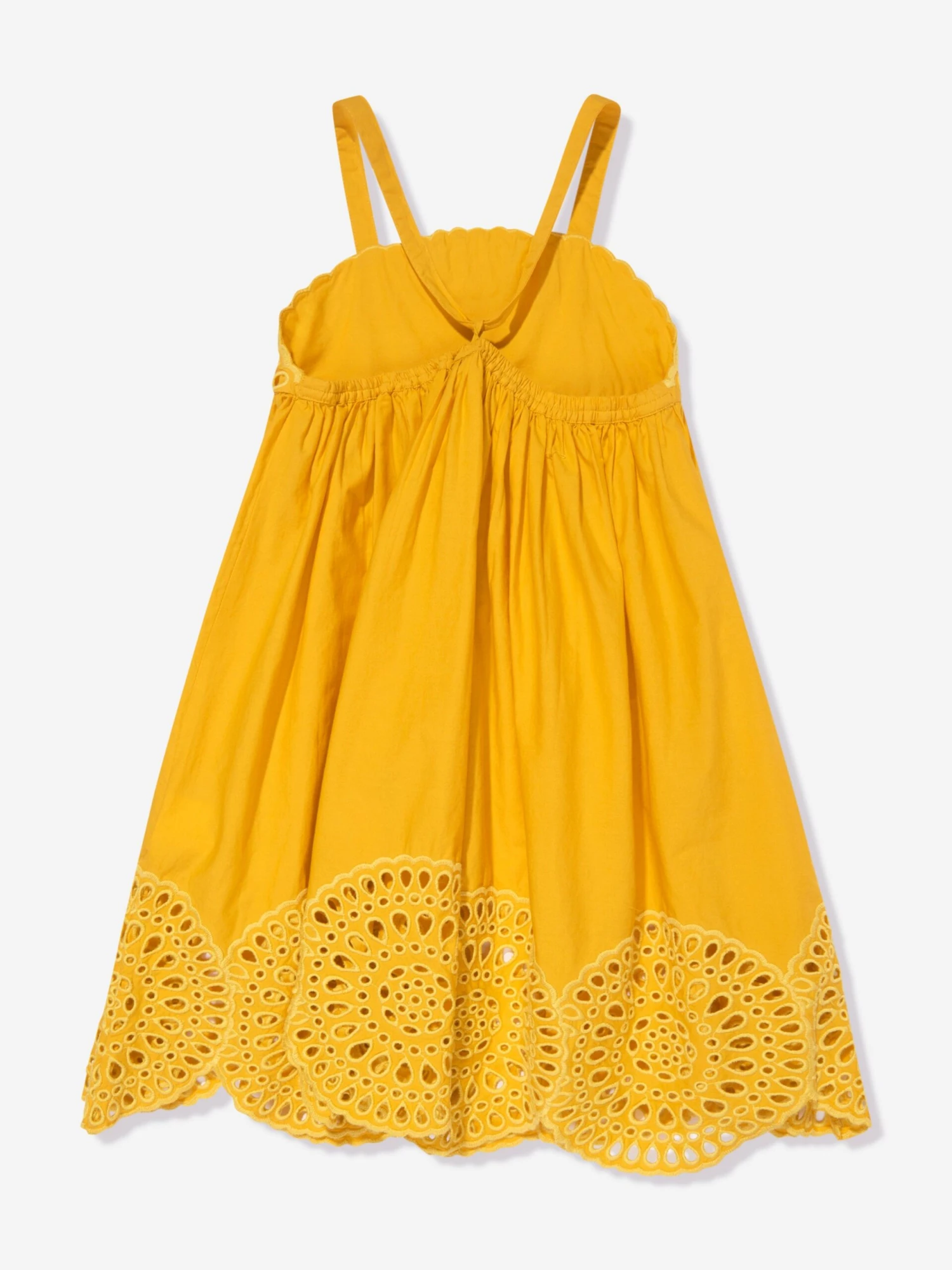 Stella McCartney incorporate bewitching eco-friendly properties into their carefully woven abstracts. This girls yellow dress captures the British label’s passion for innovation. Crafted in broderie anglaise via a tightly woven quality. Along the edges at the bottom and at the top there is a pointelle detailing and narrow shoulder straps that go through a loop on the back.