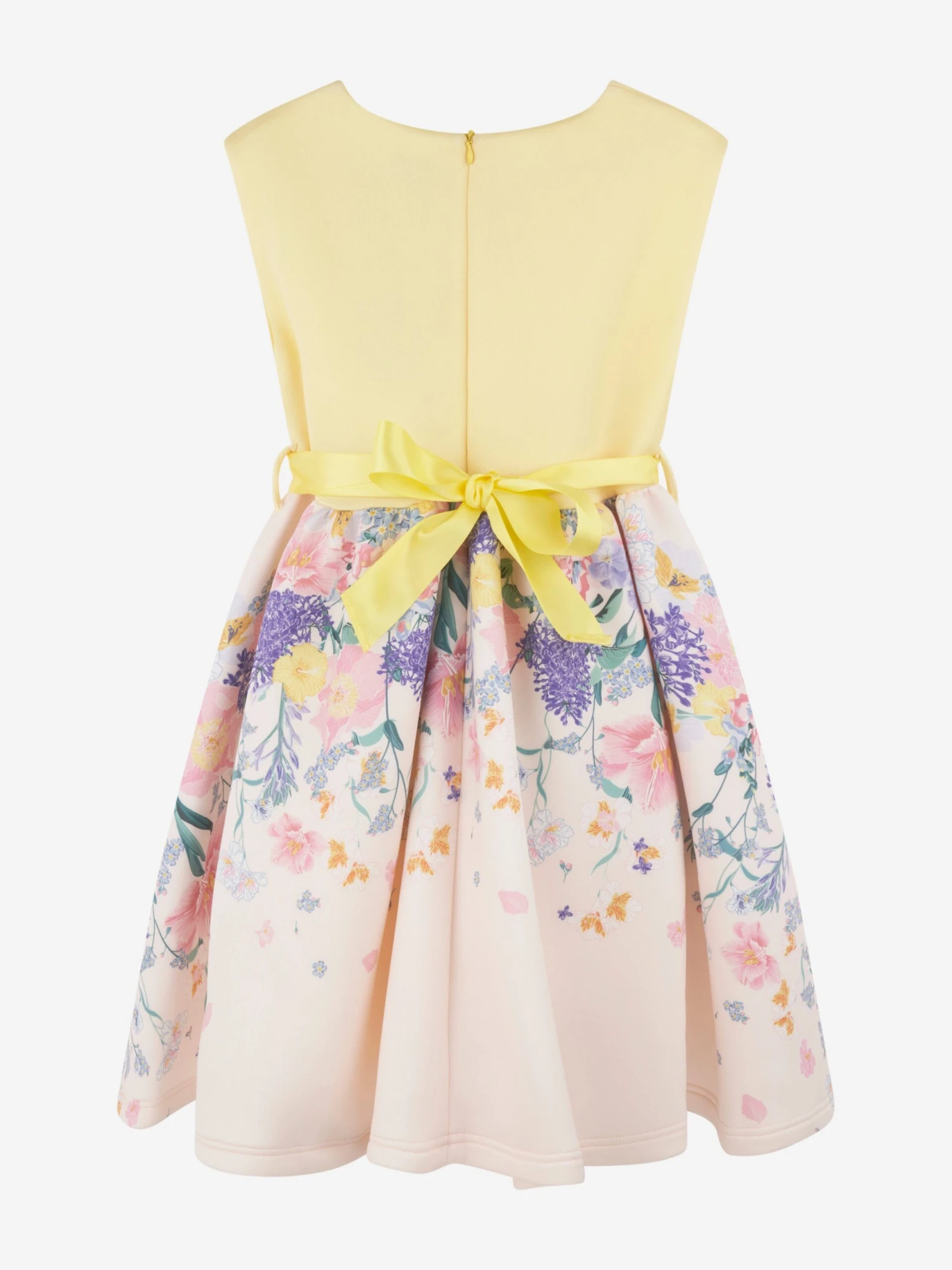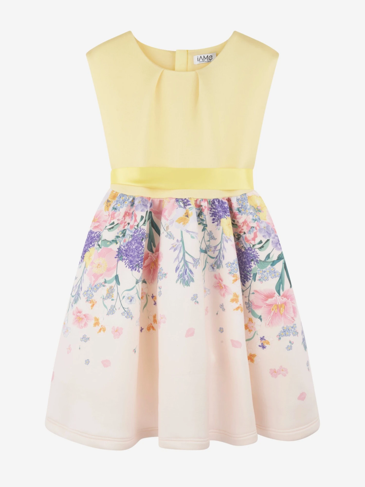 iAMe envision beautiful properties in their occasion wear. This girls lemonade floral print dress is reflective of the British label’s exquisite manufacturing and intricate outlook. Crafted in beautiful summer floral patterning with a satin yellow tie-up bow on a blended cotton base.