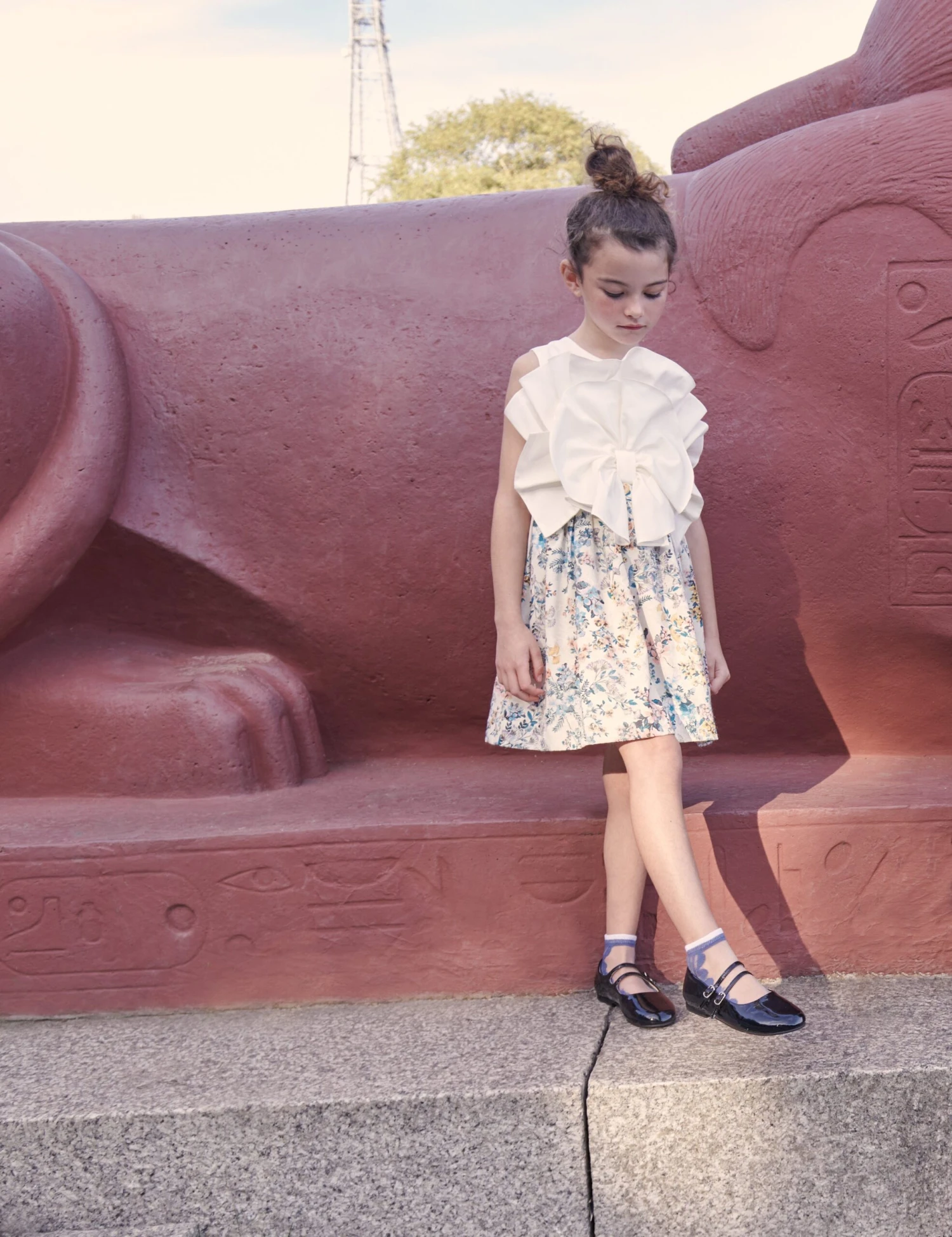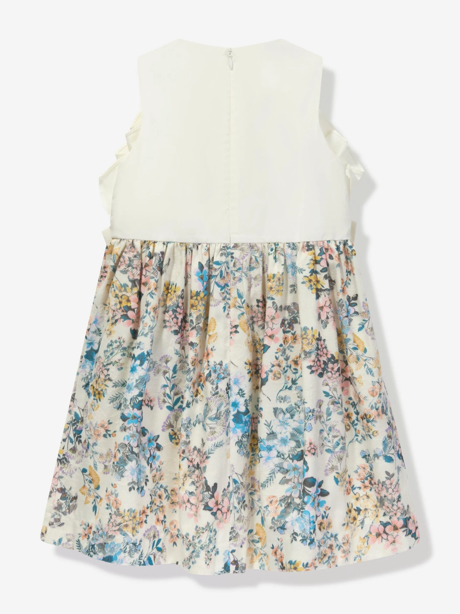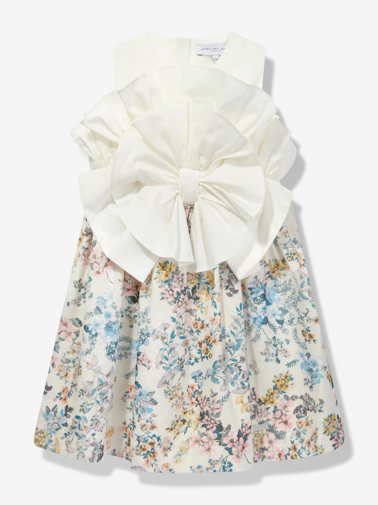 Jessie and James embody timeless elegance and modern charm. This girls spring floral jacquard dress is reflective of the label’s distinctive care and craftsmanship. Depicted with a large exaggerated white bow in the centre via pleated multicoloured floral patterning on the skirt. She will embody a newfound confidence.