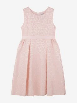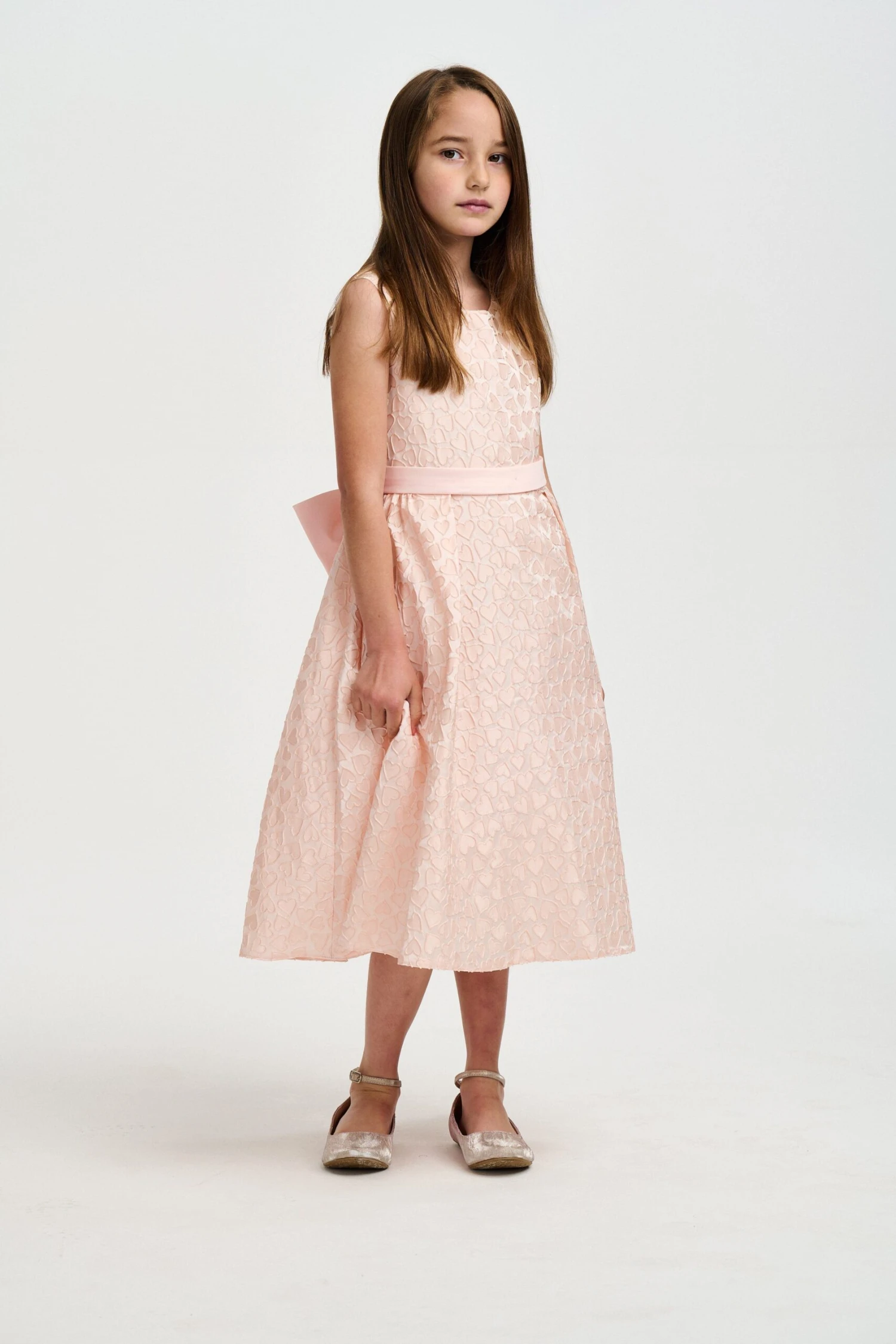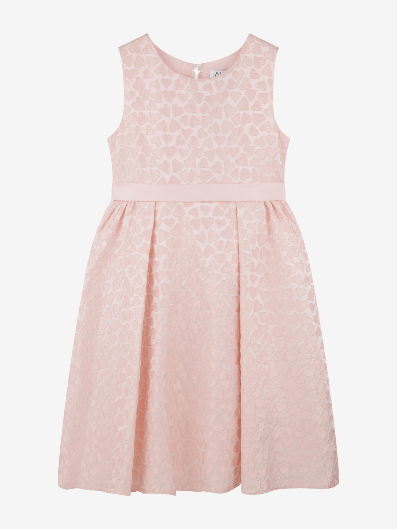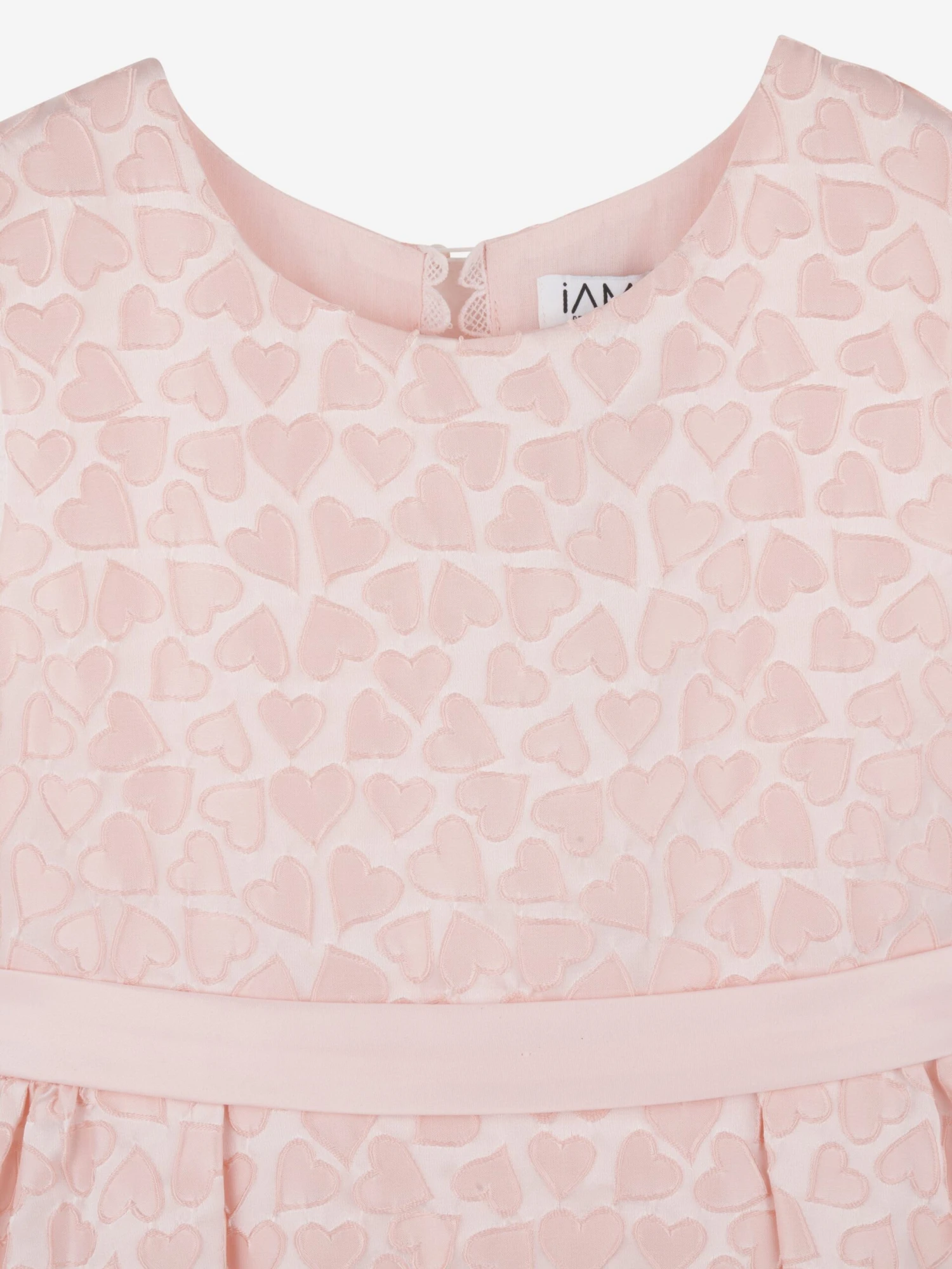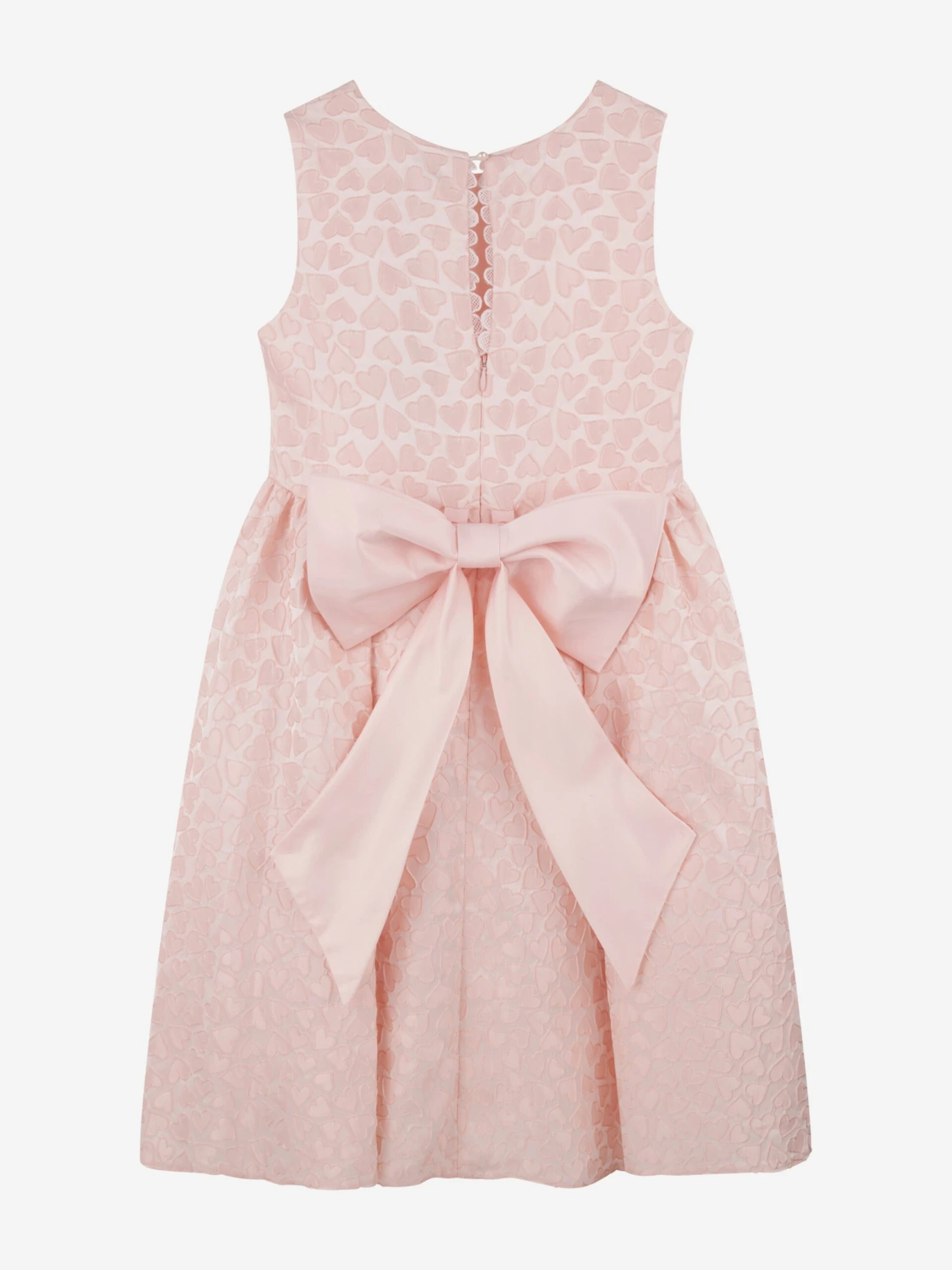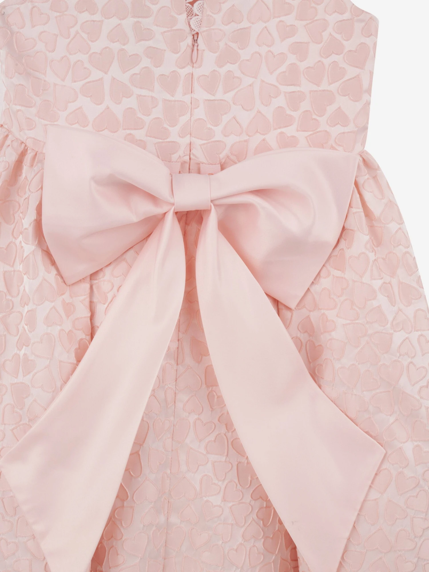 British designer label iAMe amplify Victorian styles into mesmerising innovative pieces. This girls pink hearts embossed dress utilises a captivating aesthetic both charming and sweet. Crafted in heart patterning on a satin base with a large pink satin tie-up bow on the back and intricate netted lining. It’s sophisticated construction is complete with a back pearl fastening and lace trim.