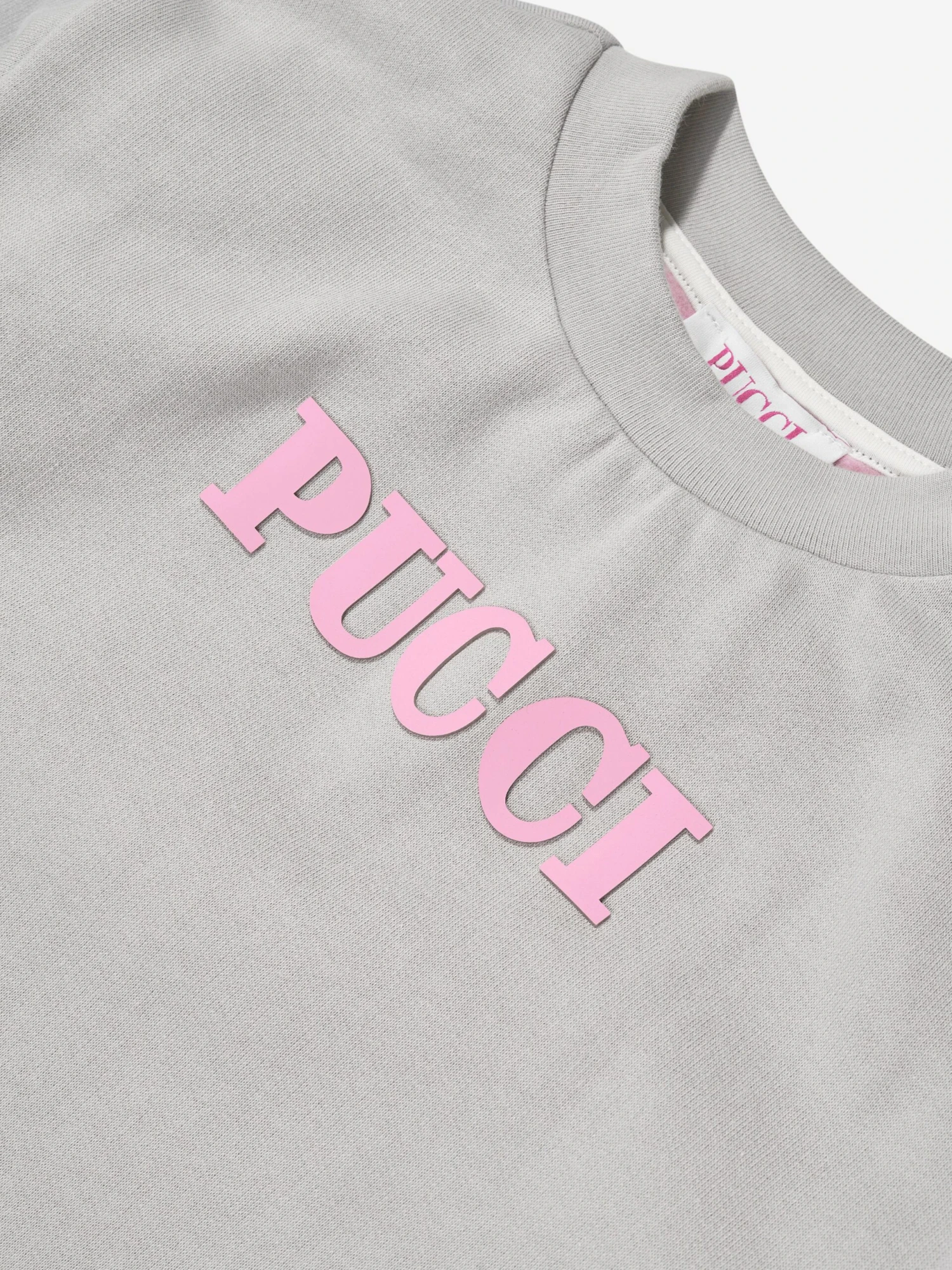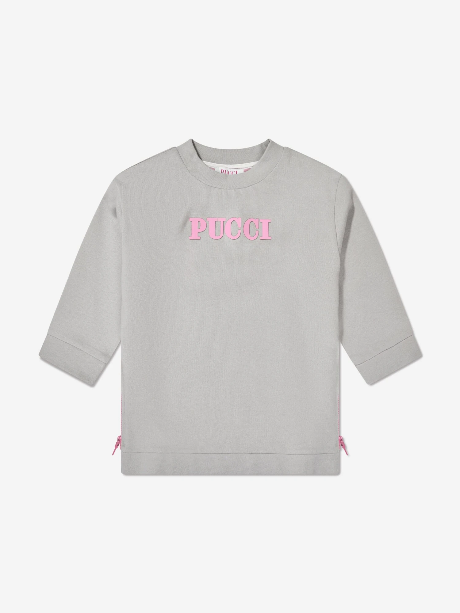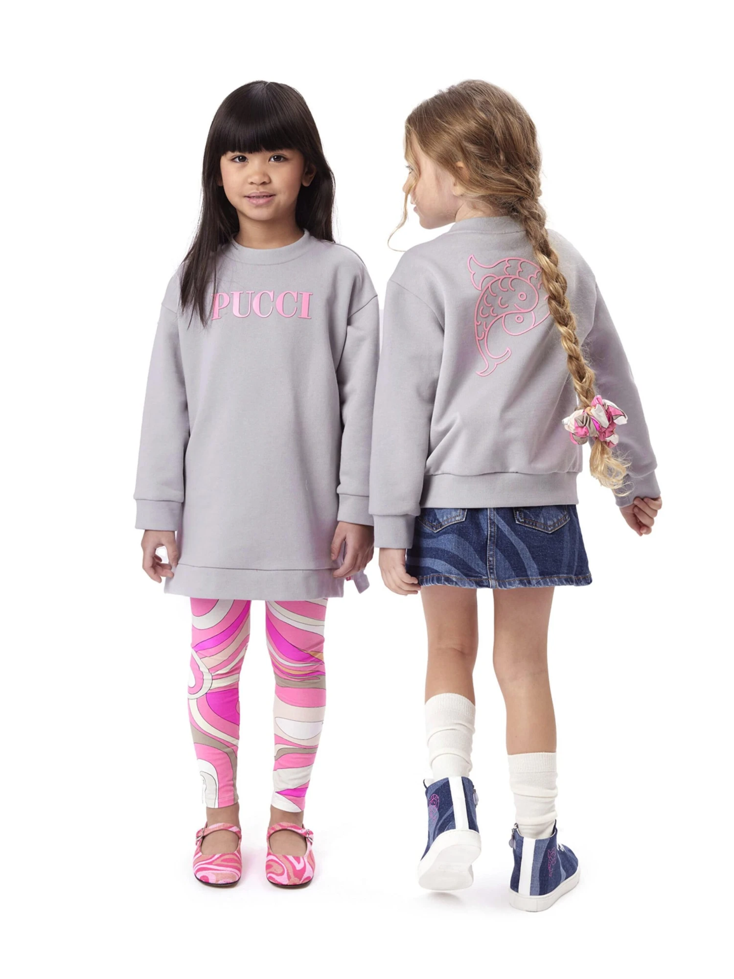 This girls grey sweater-dress from Pucci offers a contemporary silhouette from the famous Italian label. Crafted from a soft and comfy cotton, the cool and casual piece features a fuchsia logo print on the front, whilst the iconic fish motif appears on the back. The stylish sweat is completed with zip fastenings on the side seams for an eccentric touch.