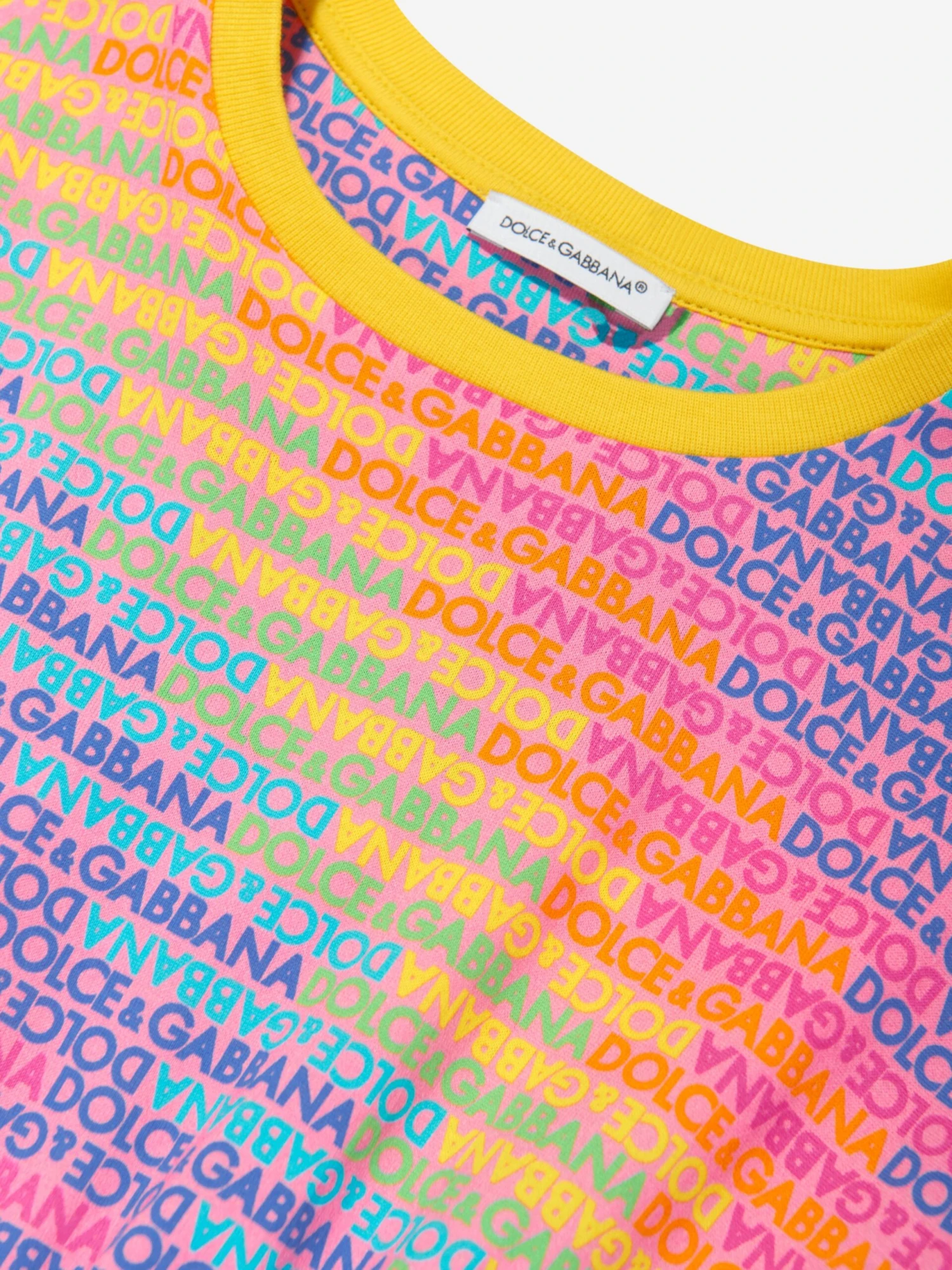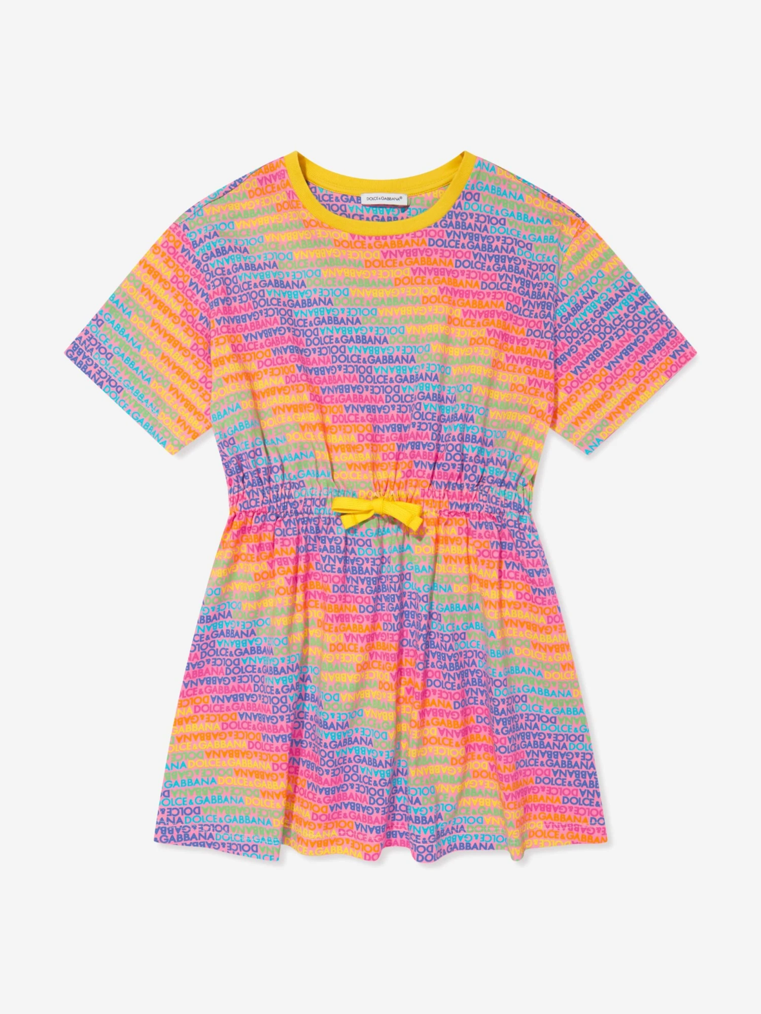 Dolce & Gabbana incorporate innovative materials with vintage abstracts into coexisting spaces. This girls t-shirt dress captures the Italian label’s mesmeric craftsmanship and purity of design. As part of the Italian Holiday collection inspired by the Aeolian islands and the magic of Mediterranean imagery. Crafted in cotton jersey with all-over logo print in stunning multicolour via an oversize fit and stretch drawstring waistband. She will look and fee divine.