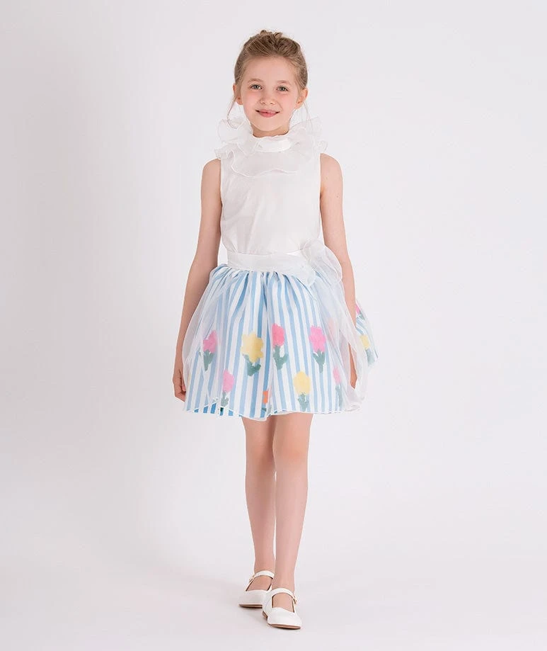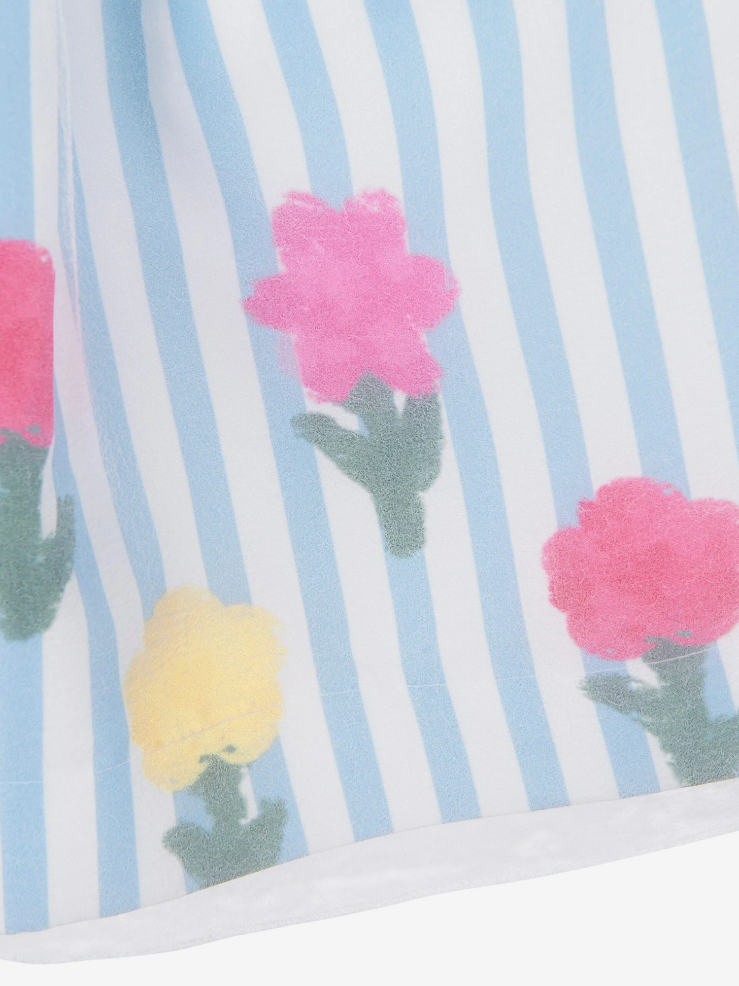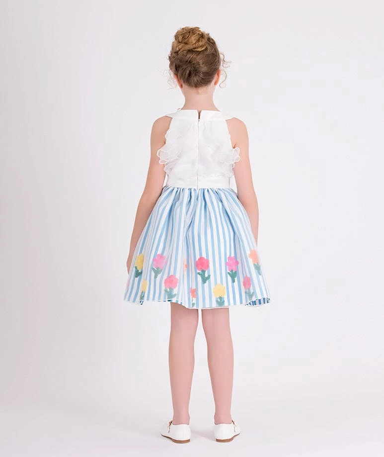 Californian label Mama Luma depict beautiful designs via their ethically sourced fabrics. This girls floral print dress is reflective of the label’s fine detailing and handmade construction. Crafted with exaggerated frills on the front bodice with a large bow and stripes on the hem with pink and yellow flower prints.