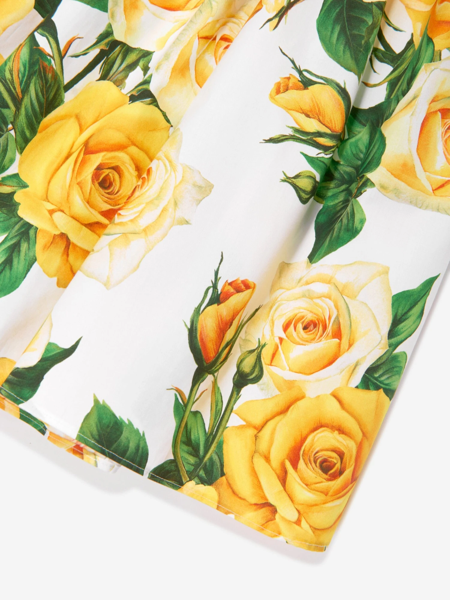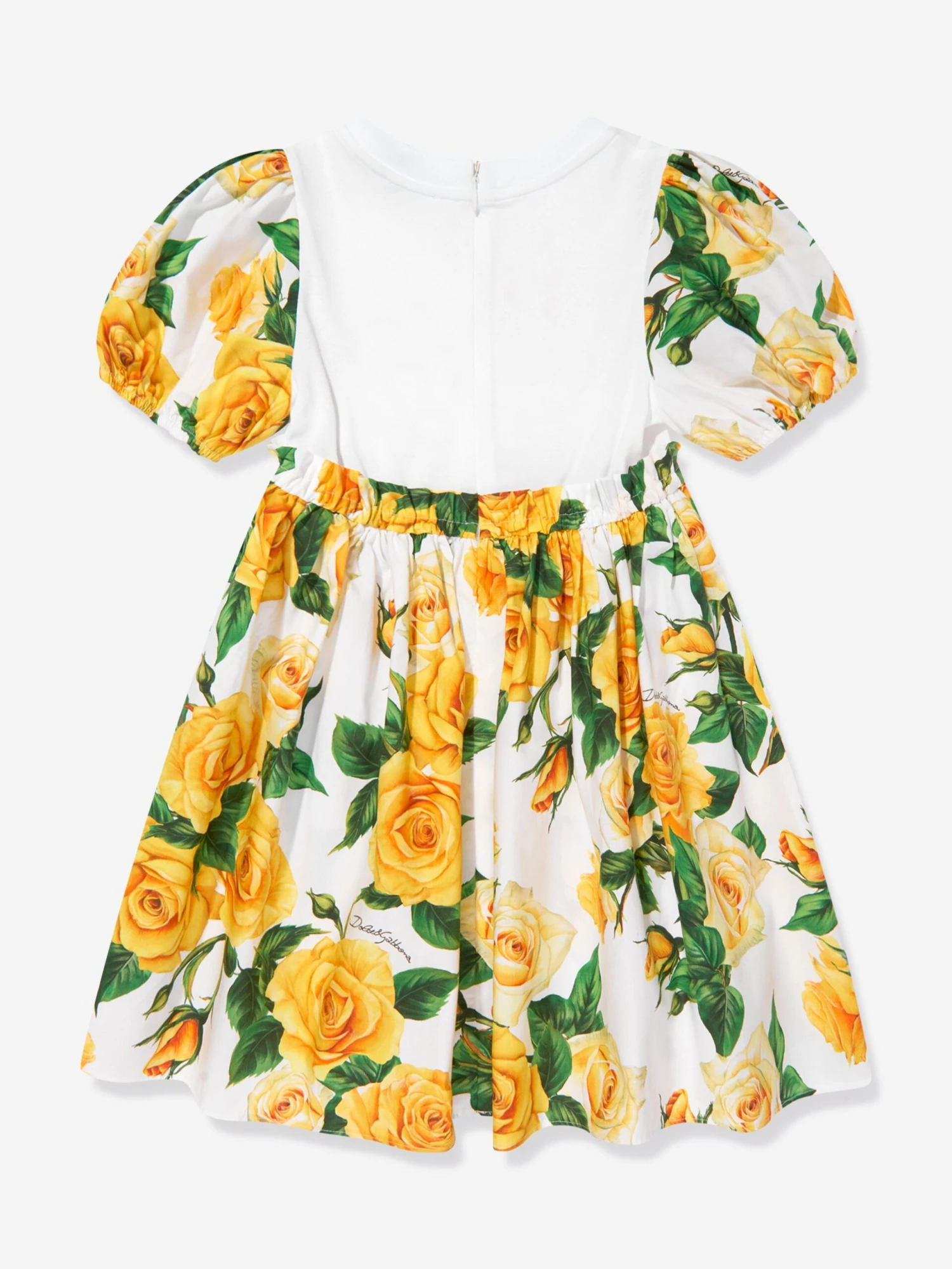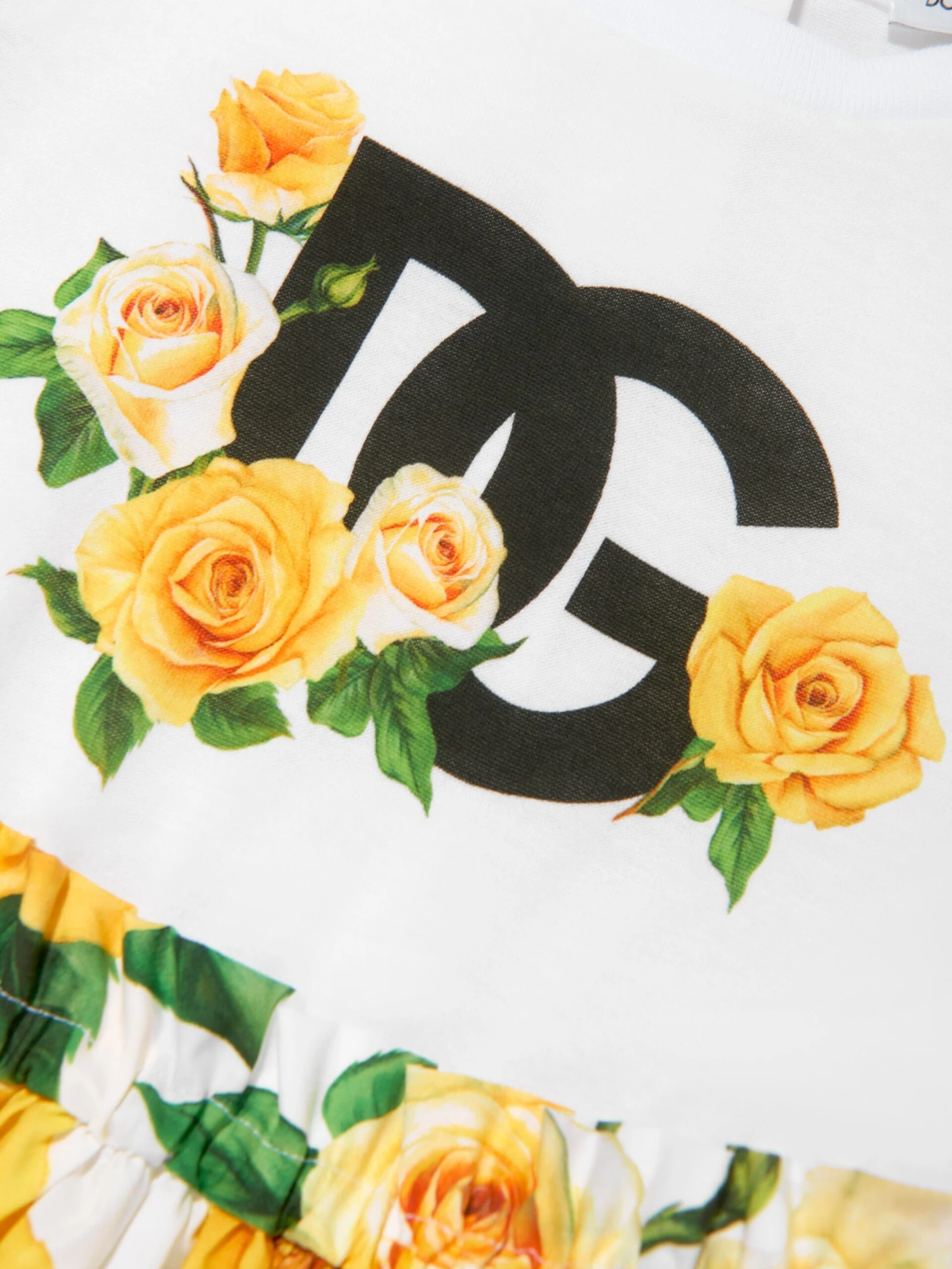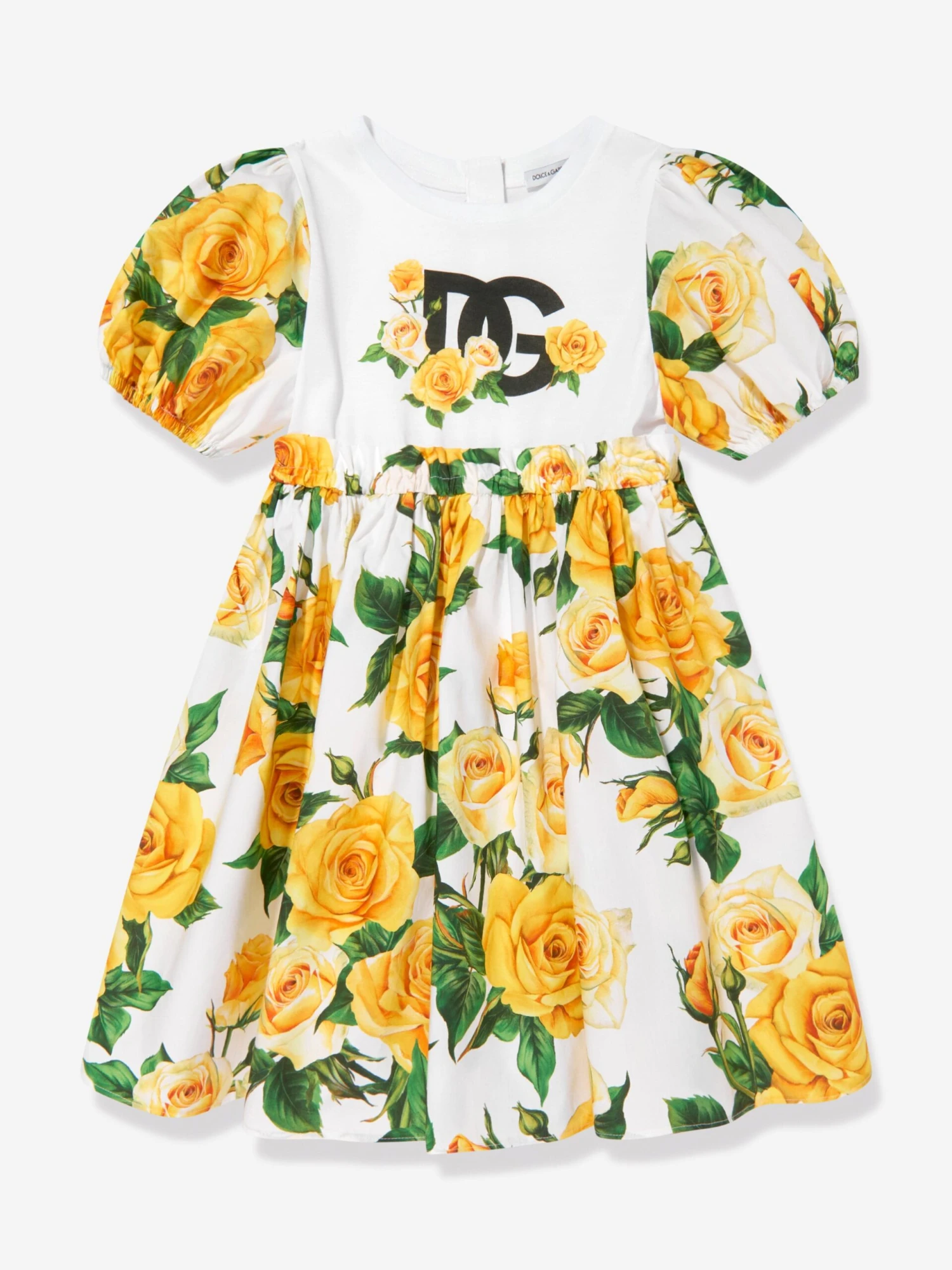 Dolce & Gabbana incorporate innovative materials with vintage abstracts into coexisting spaces. This girls dress captures the Italian label’s mesmeric craftsmanship and purity of design. As part of the girl’s Flowering collection, each piece is depicted in a veritable riot of yellow roses. Crafted in white elegant cotton with short balloon sleeves and an adjustable waist. It is decorated with an explosion of yellow roses on the flounced skirt and a black logo.