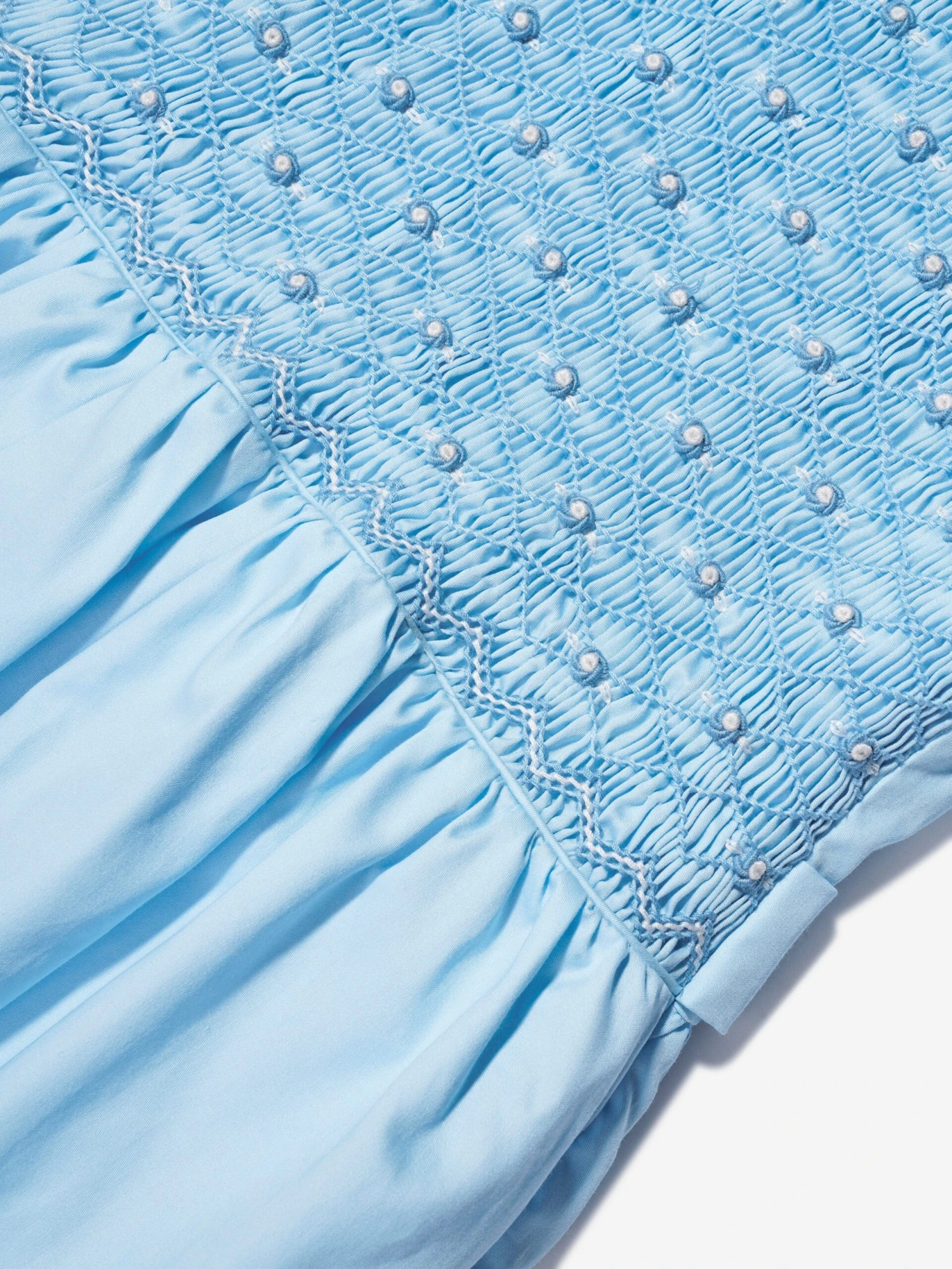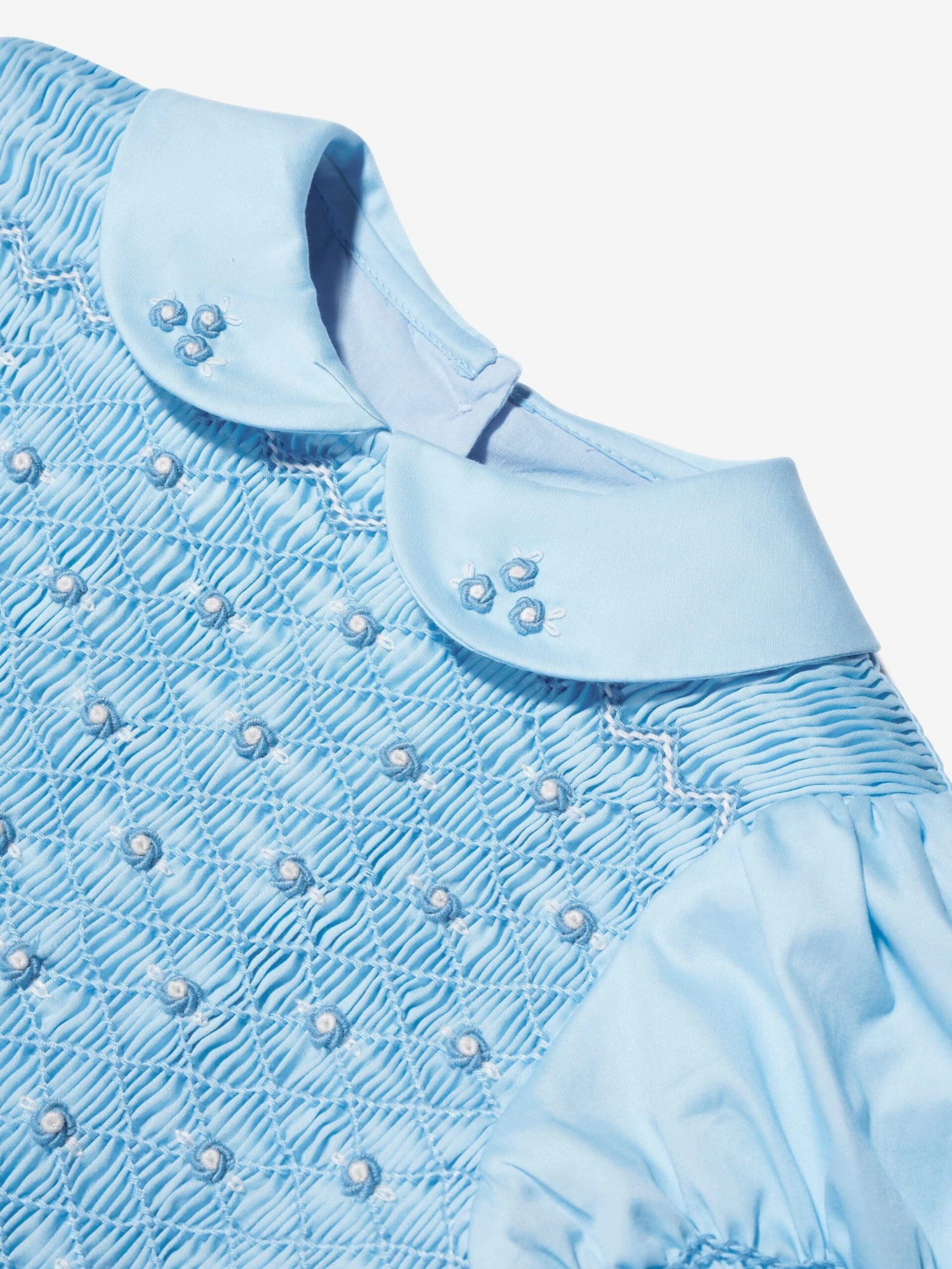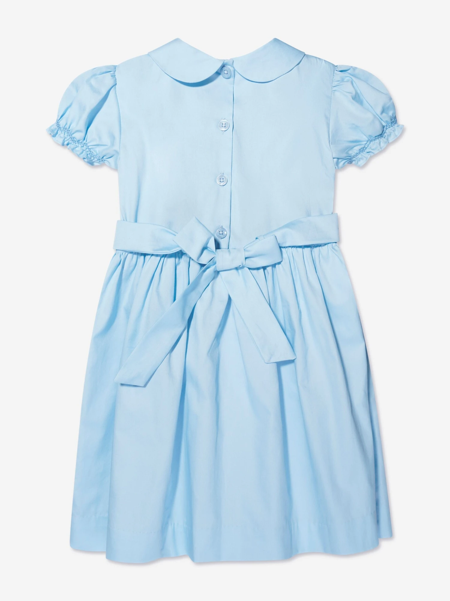 Rachel Riley’s traditional craftsmanship is embodied in this girls rose smocked dress in blue. As part of the heritage collection and nod to King Charles’ III coronation, it has been made with the finest construction and imperial care. Depicted in a forget-me-not blue, it features an intricately detailed rose stitching on a gathered bodice with a Peter Pan collar, back tie-up bow and button fastening. The exquisite craftsmanship is complete with elasticated puffy sleeves and layered lining.