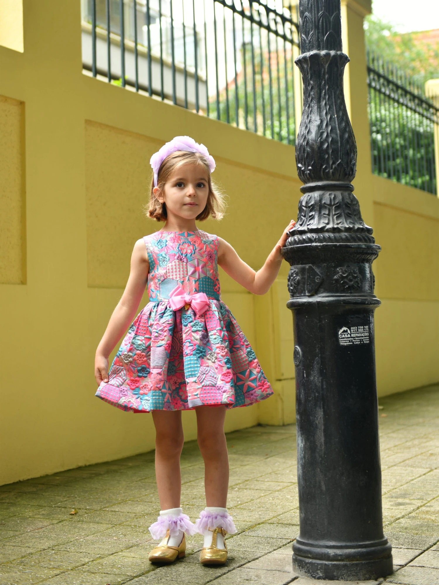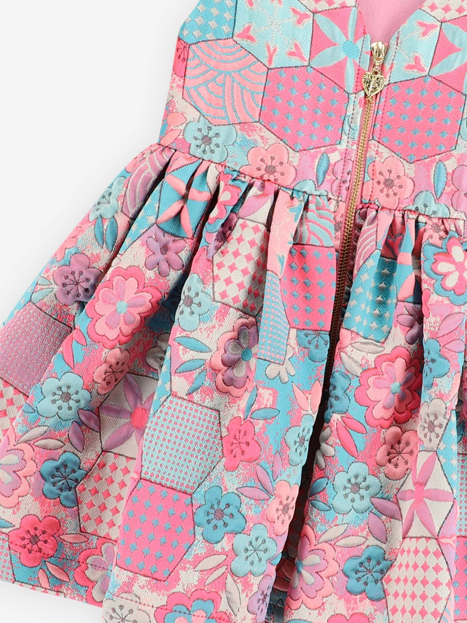 Angel’s Face incorporate beautiful material into their refined aesthetics. This girls orange Ruby circle pinafore dress captures the label’s passion for sleek, enigmatic detailing. Crafted with hexagon flowers via a jacquard design, a gathered skirt and the brand’s signature bow and gold heart charm on the waist.