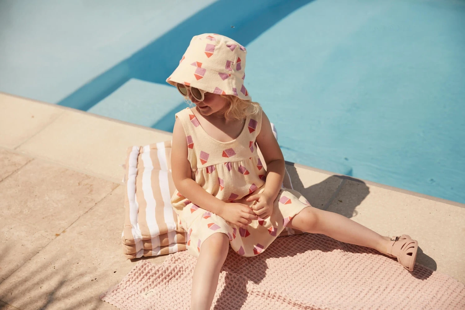Introducing the Girls Silky Terry Beach Hut Sun Dress in Ivory by The Bonnie Mob – an epitome of style, comfort, and elegance, perfect for holiday adventures. The salient features include: