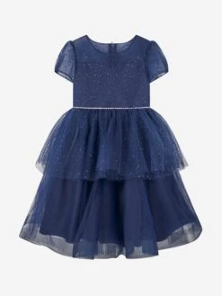iAMe amplify Victorian styles into exquisite dresses. This girls navy sparkle dress embodies the label’s passion for a bygone era. It is depicted in a satin, shimmering glittered effect with exaggerated mesh tulle layering, short puffy mesh sleeves and silver diamanté detail on the waist. To complete this beautiful look, a satin bow is showcased on the back.