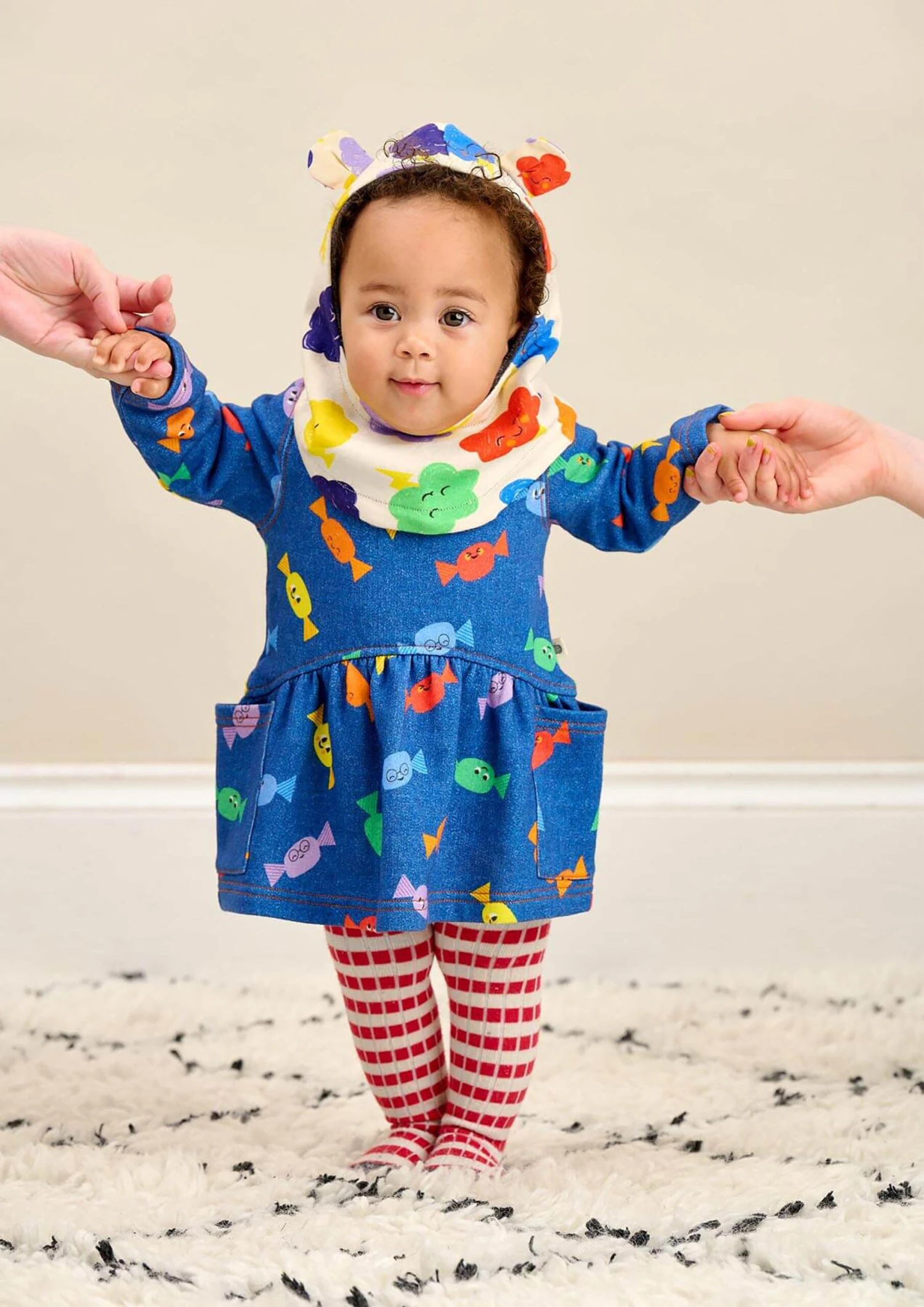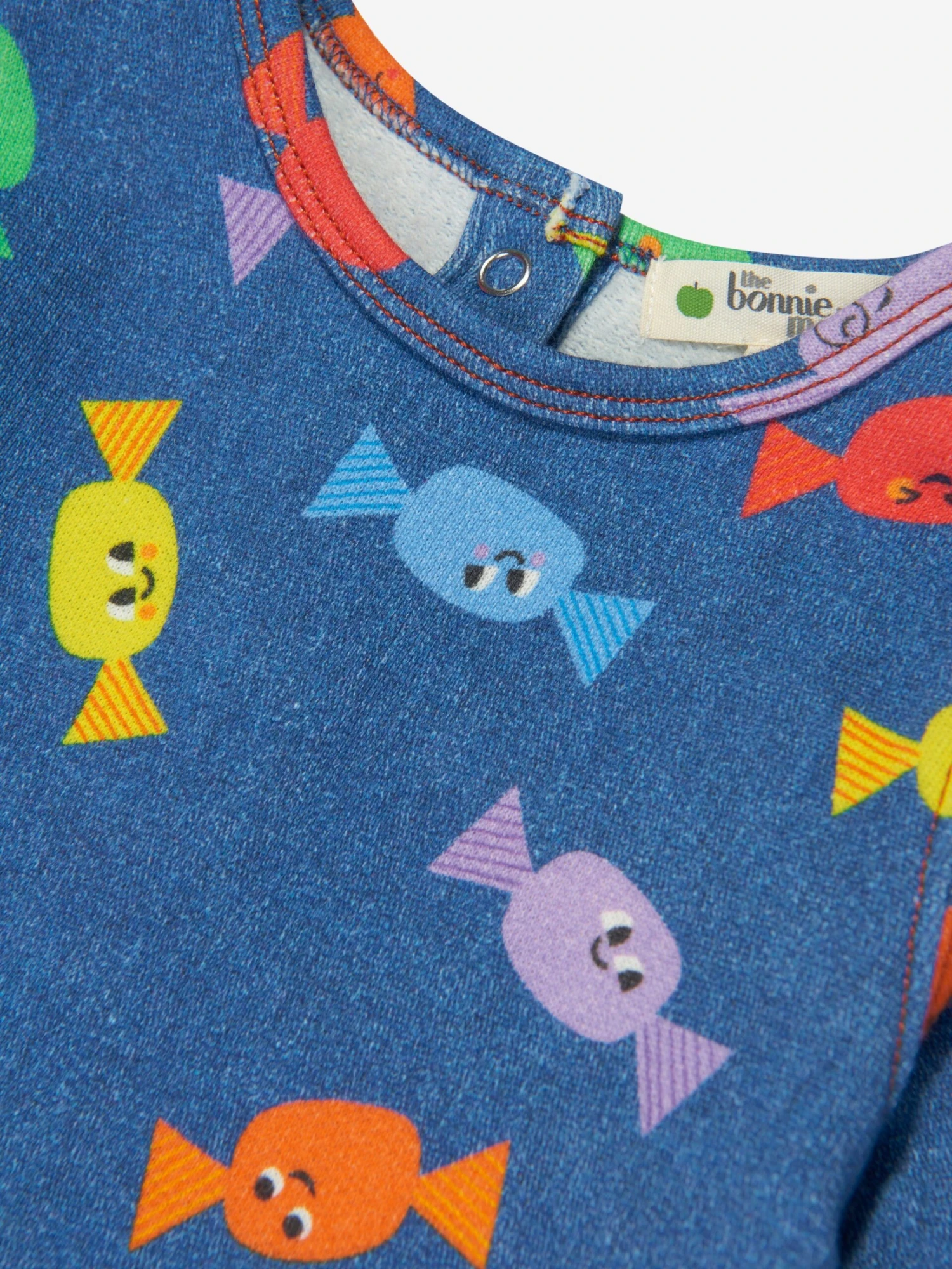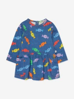 The Bonnie Mob depict passion and colour into their eco-friendly, sustainable abstracts. This baby girls blue sweater dress is reflective of the label’s passion for beautiful aesthetics with an innovative twist. Made with multicoloured smiling sweet wrapper patterning via a zip fastening and peplum hem.