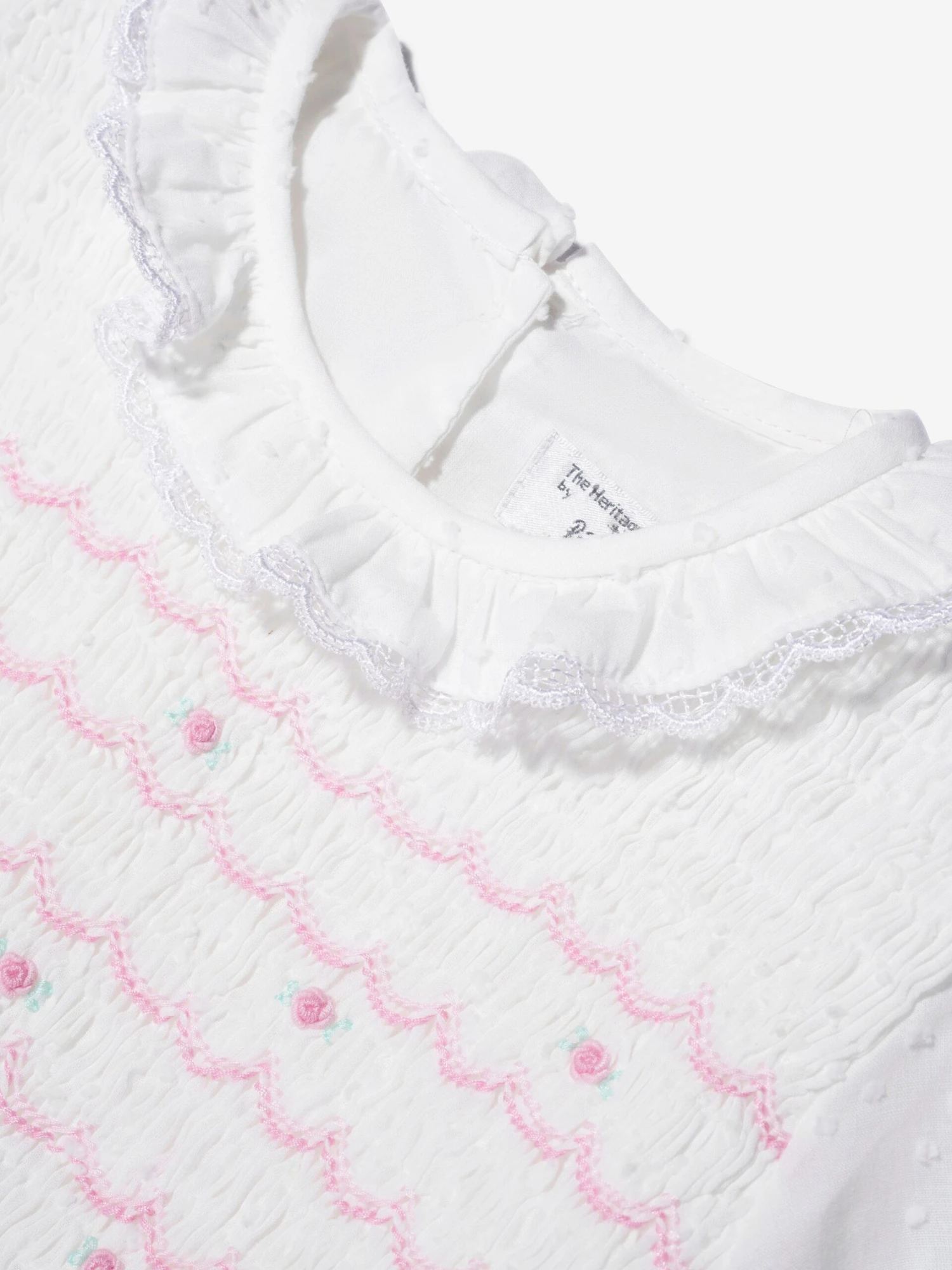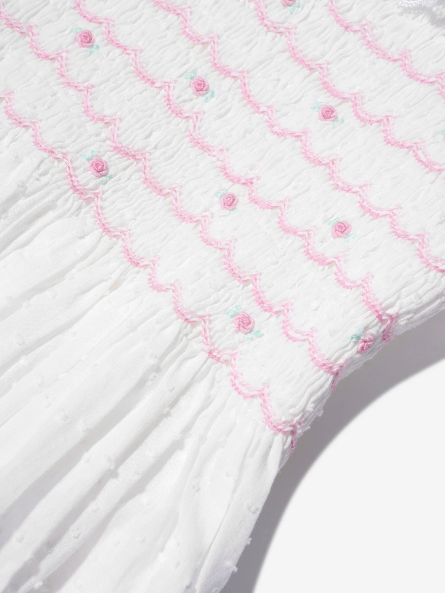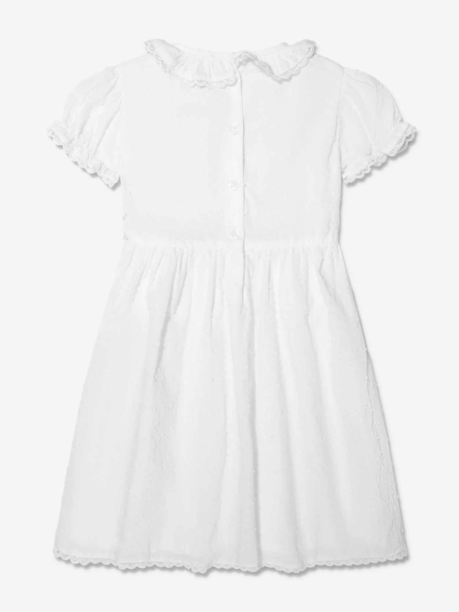 Rachel Riley contemplate 50s and 60s vintage archives into fresh perspectives. This girls Swiss dot smocked dress and bloomers in ivory are reflective of the British label’s sleek majestic craftsmanship. Made with a floral embroidered bodice and layered dotted cotton lining, it features lace trims, a flounced collar, pink stitching and a back button fastening.