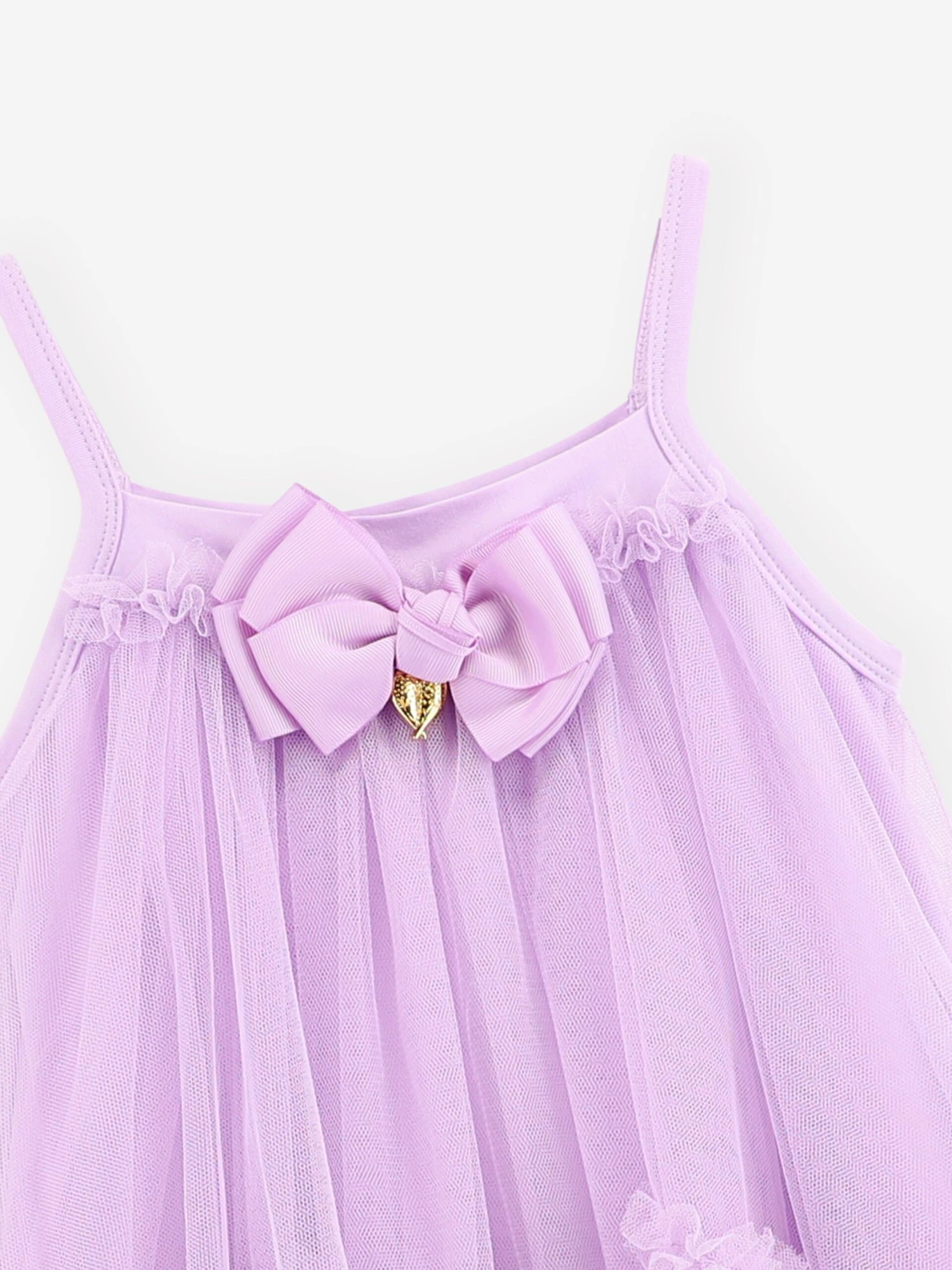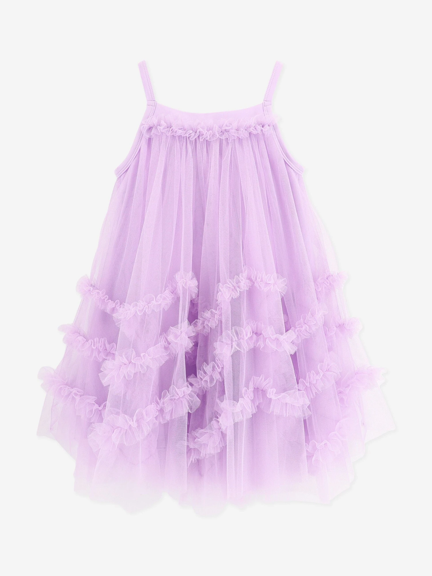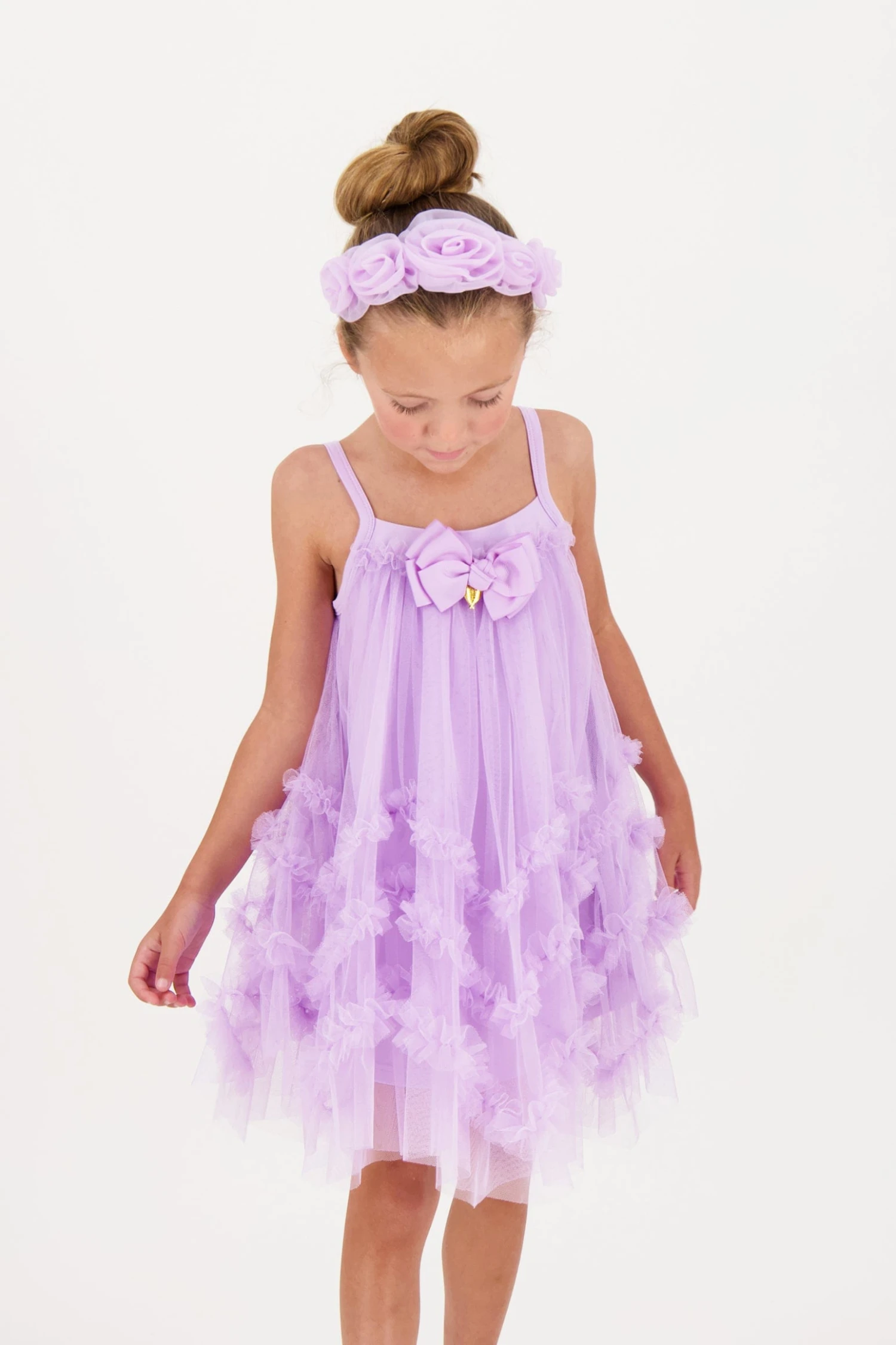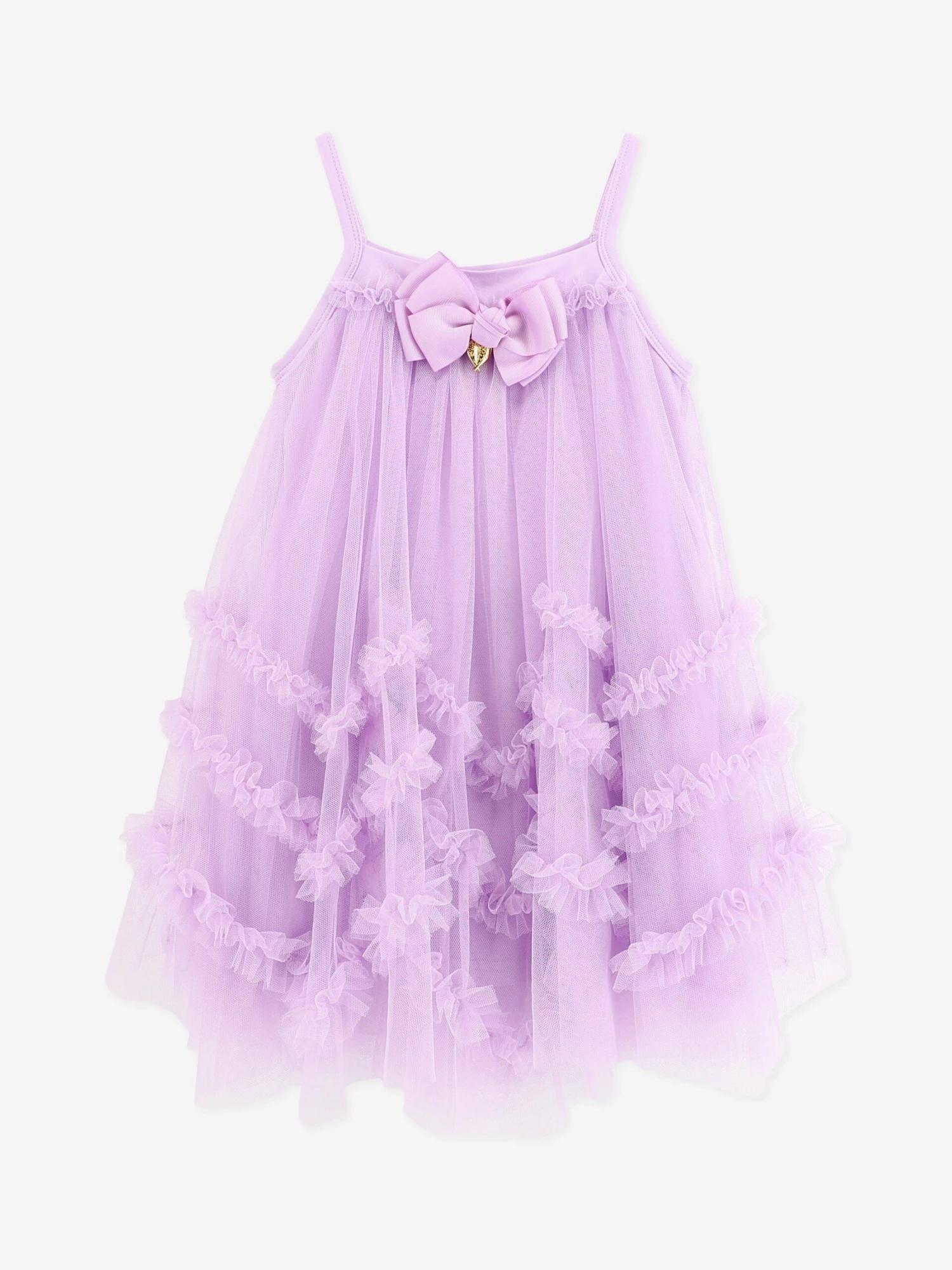 Angel’s Face depict beautiful properties into their flawless abstracts. This lilac zigzag pinafore dress amplifies passion and high quality detailing. Envisioned in layers of tulle. It features a voluminous skirt with a zig zag hem ruffle detail for extra flair. This exquisite piece is complete with the signature bow and gold heart charm.