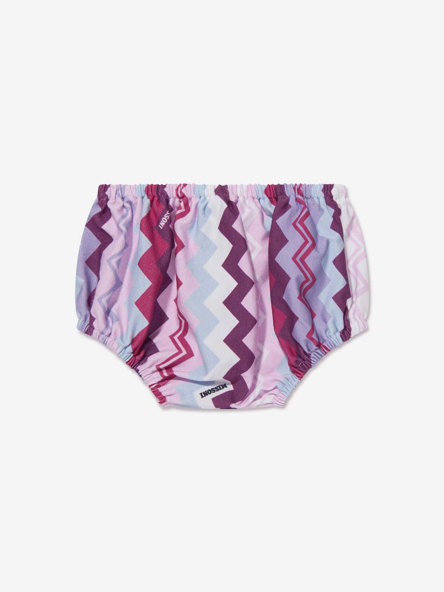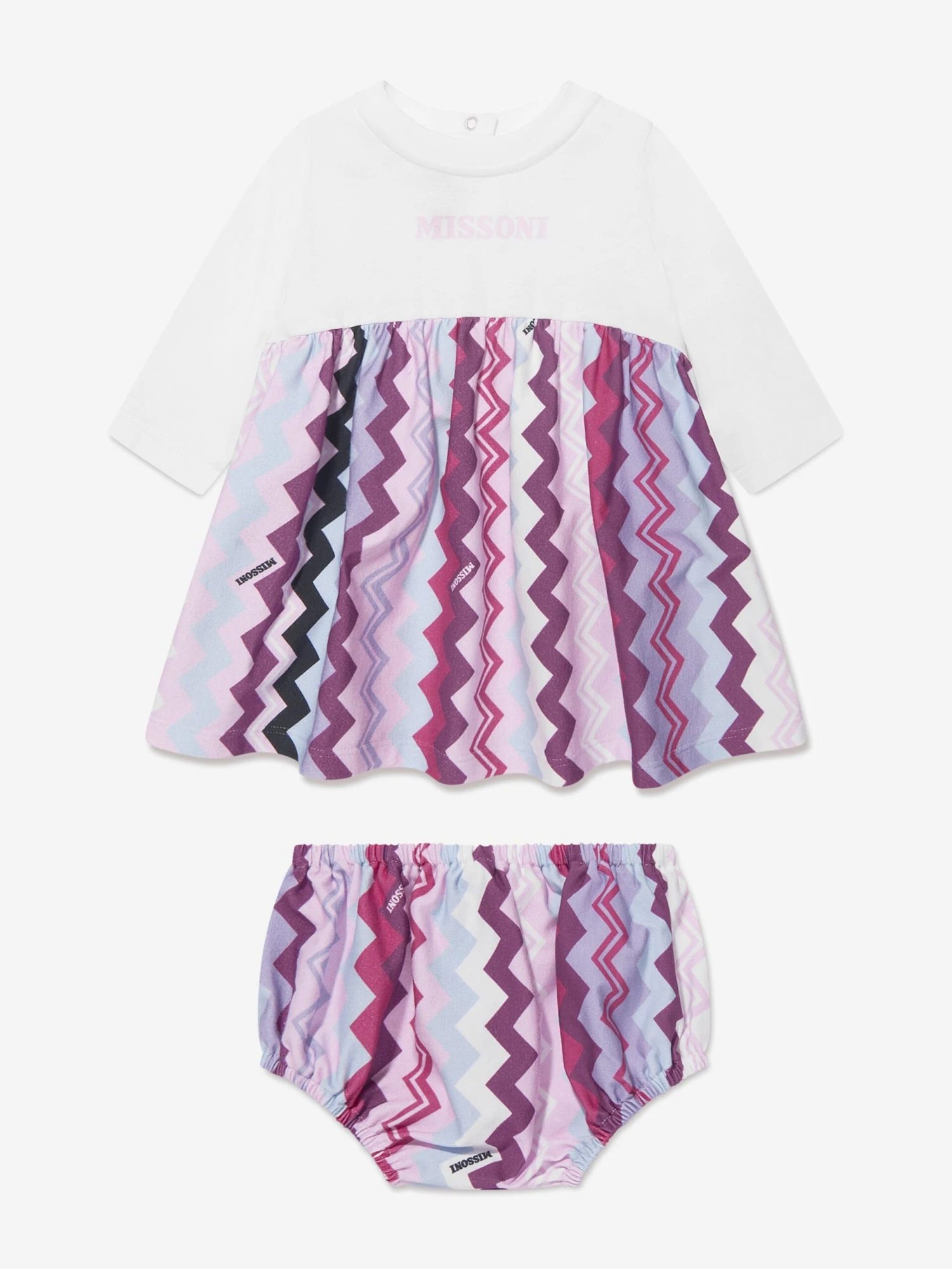 Missoni’s history of family values and Italian craftmanship are evident in this 2-piece dress set for baby. The label’s iconic zig-zag pattern is worked across a gathered skirt and matching bloomers in a shades of pastel pink, magenta and burgundy. Crafted from a soft and cosy cotton jersey long sleeve tee is finished with a logo print on the chest.