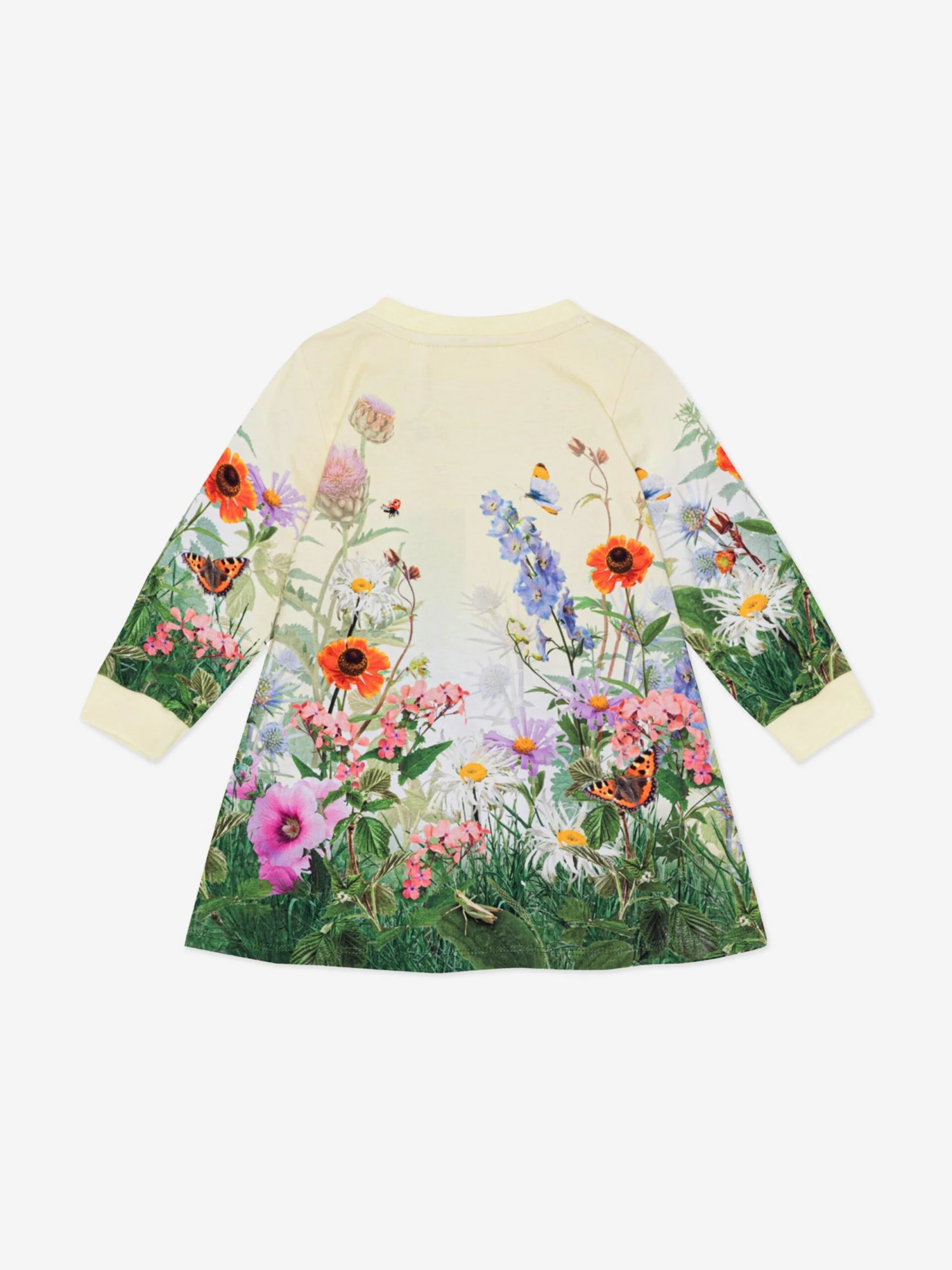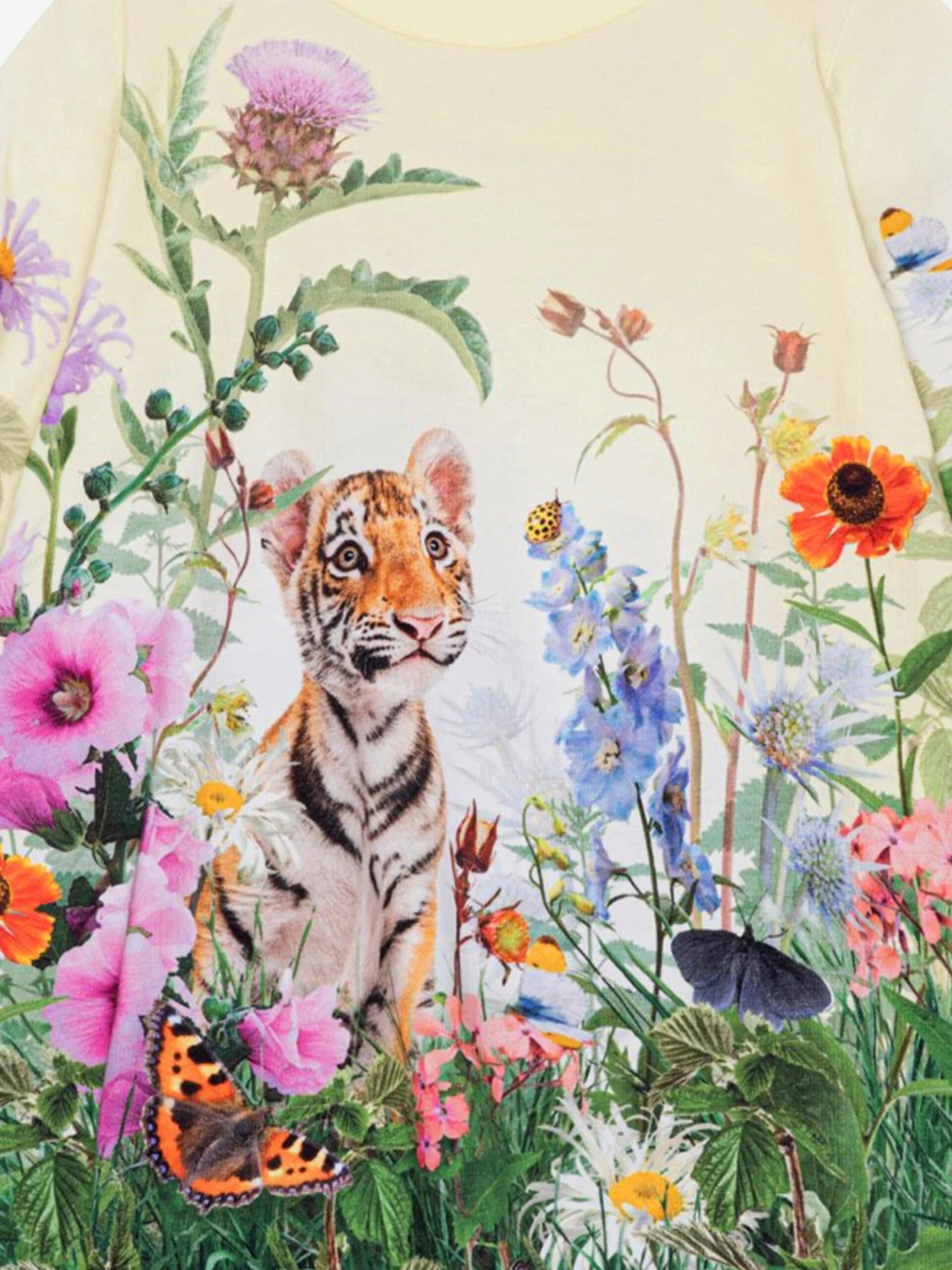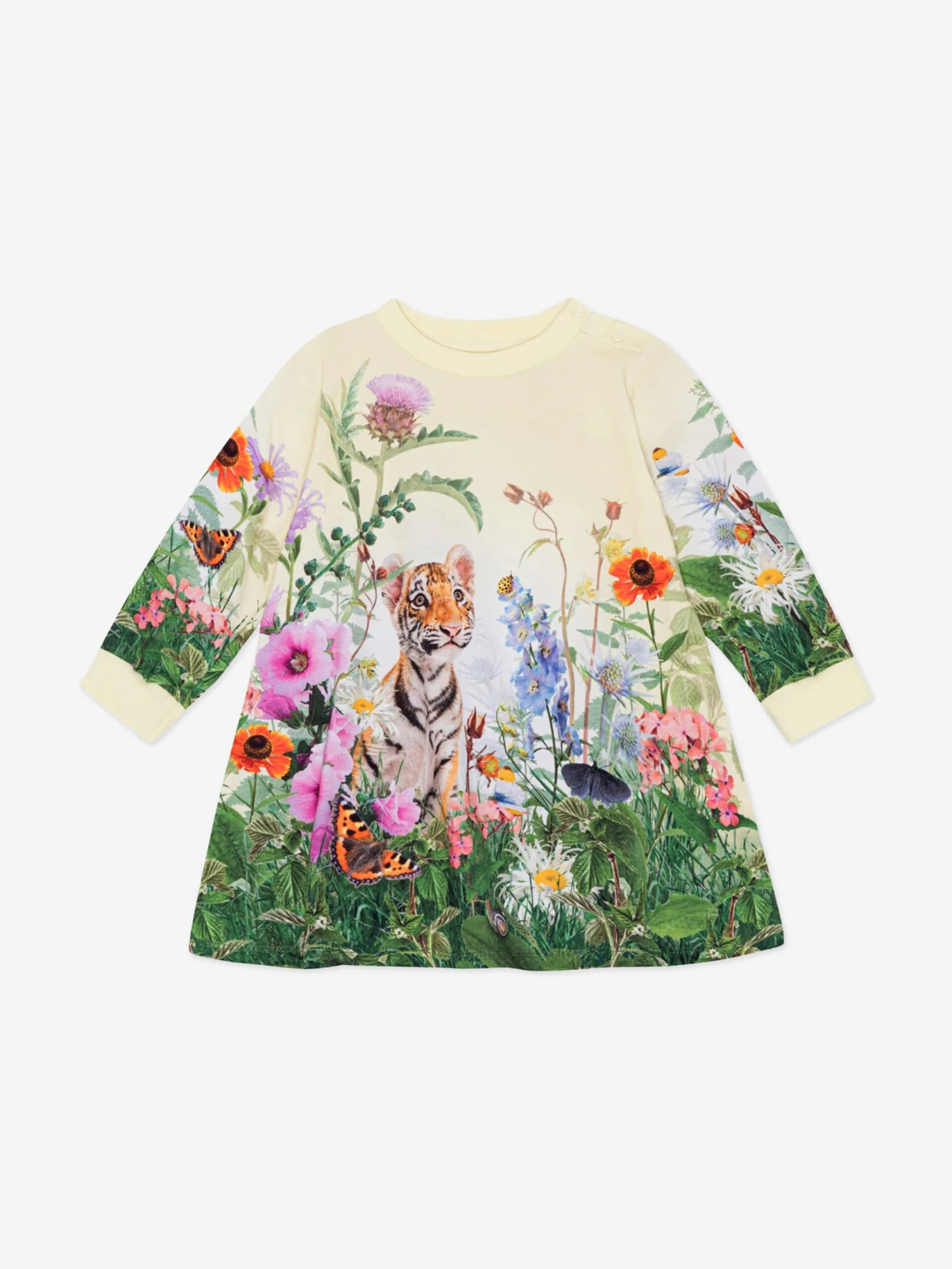 Molo inject passion and an eccentric outlook into their aesthetics. This baby girls sweater dress is both adorable and sophisticated. Crafted from beautiful organic material. It showcases a curious tiger cub in a colourful field of flowers via yellow and green imagery. She will be obsessed.