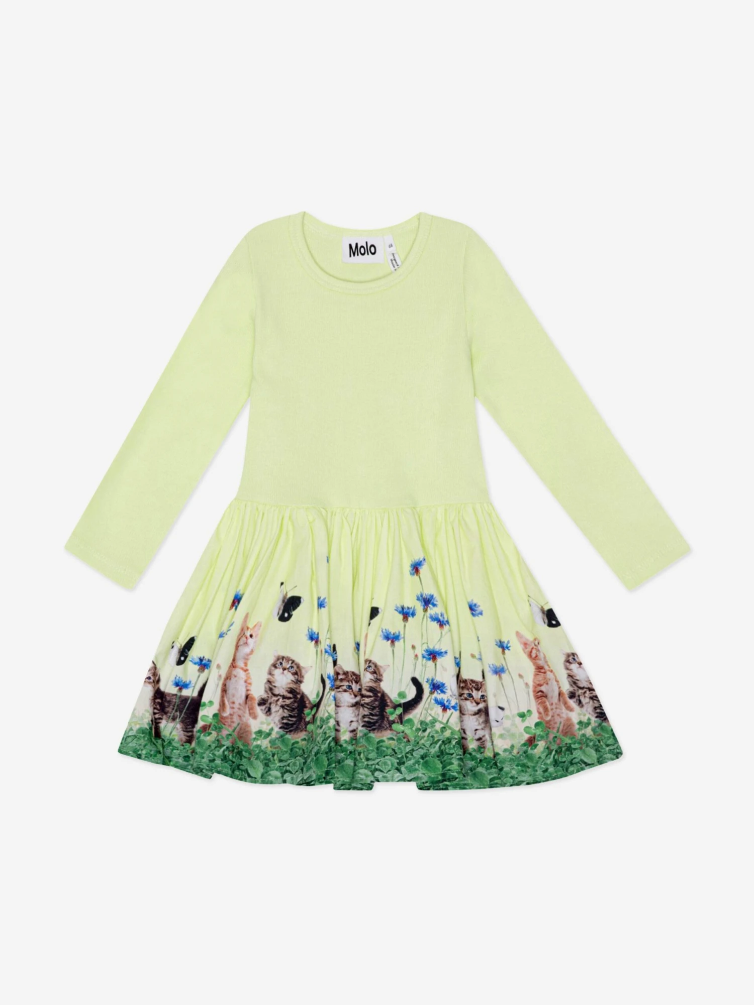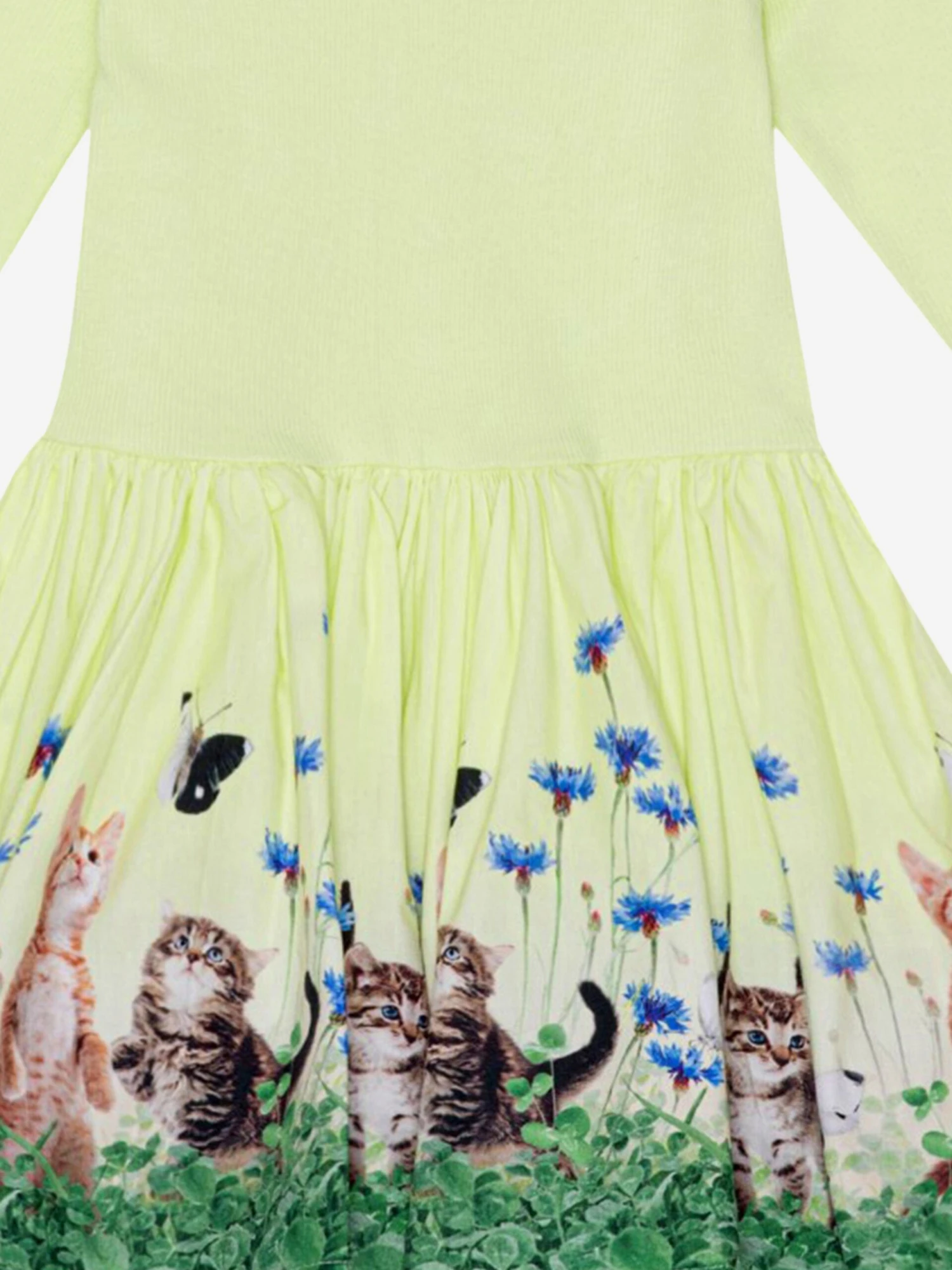 Molo inject passion and an eccentric outlook into their aesthetics. This baby girls sweater dress is both adorable and sophisticated. Crafted from beautiful organic cotton in yellow pastel. It showcases a colourful print of Ying & Yang playful kittens. The top is in a solid coloured rib to ensure extra comfort.
