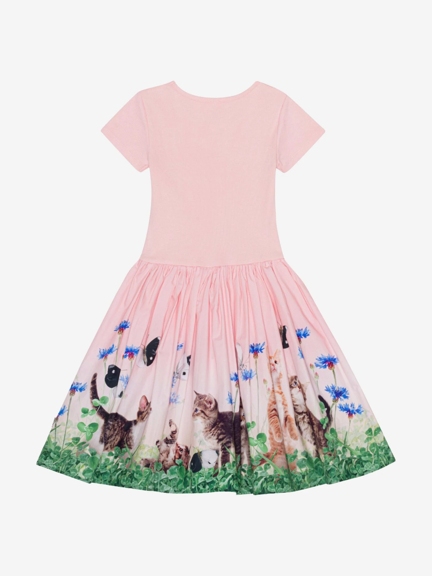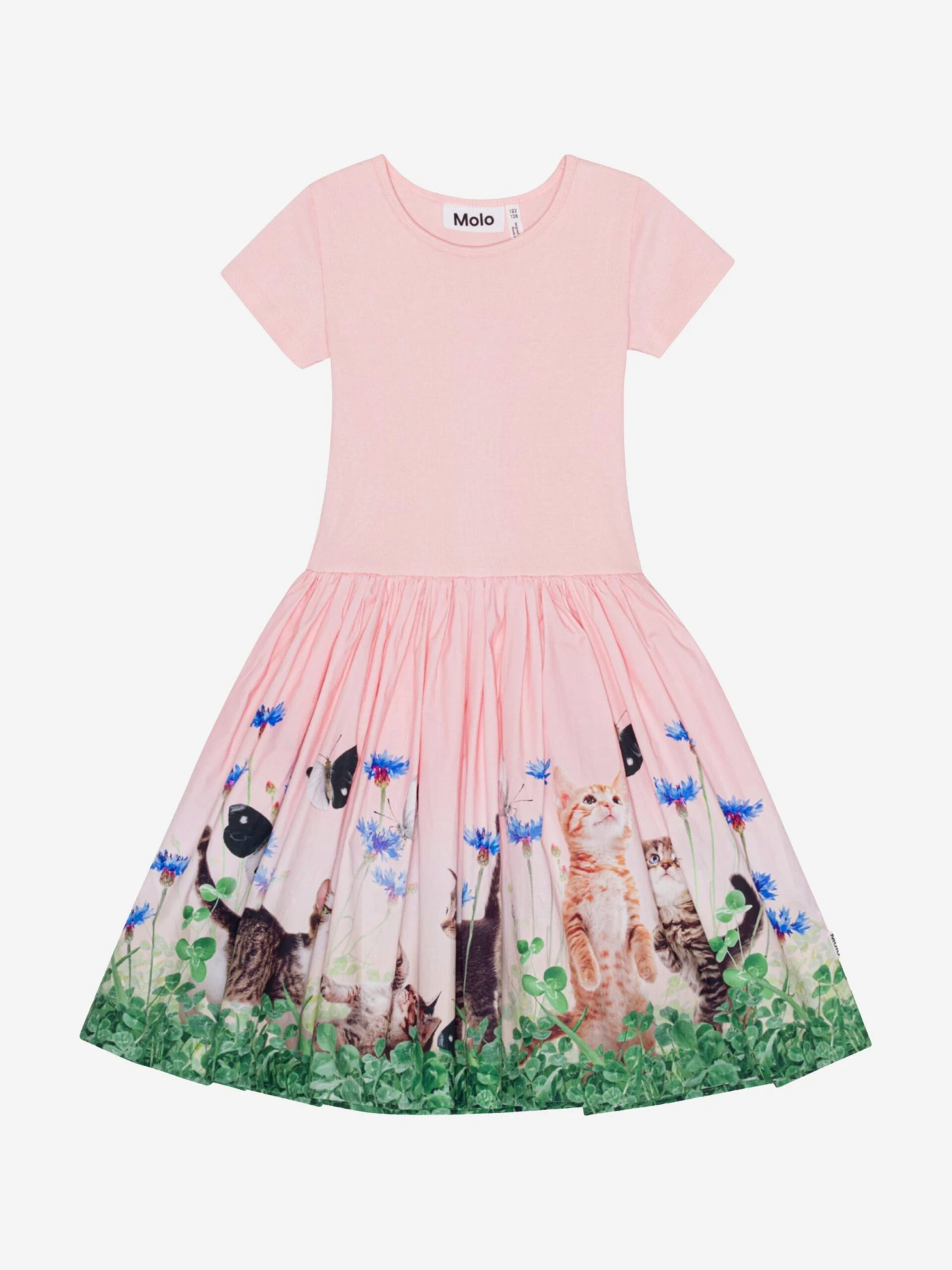 Molo inject passion and an eccentric outlook into their aesthetics. This girls Yin & Yang dress is reflective of the label’s ostentatious technological properties. Crafted in beautiful organic cotton with a hybrid combination of rib jersey and a cotton poplin circular skirt, showcasing adorable graphic imagery of kittens and flowers.