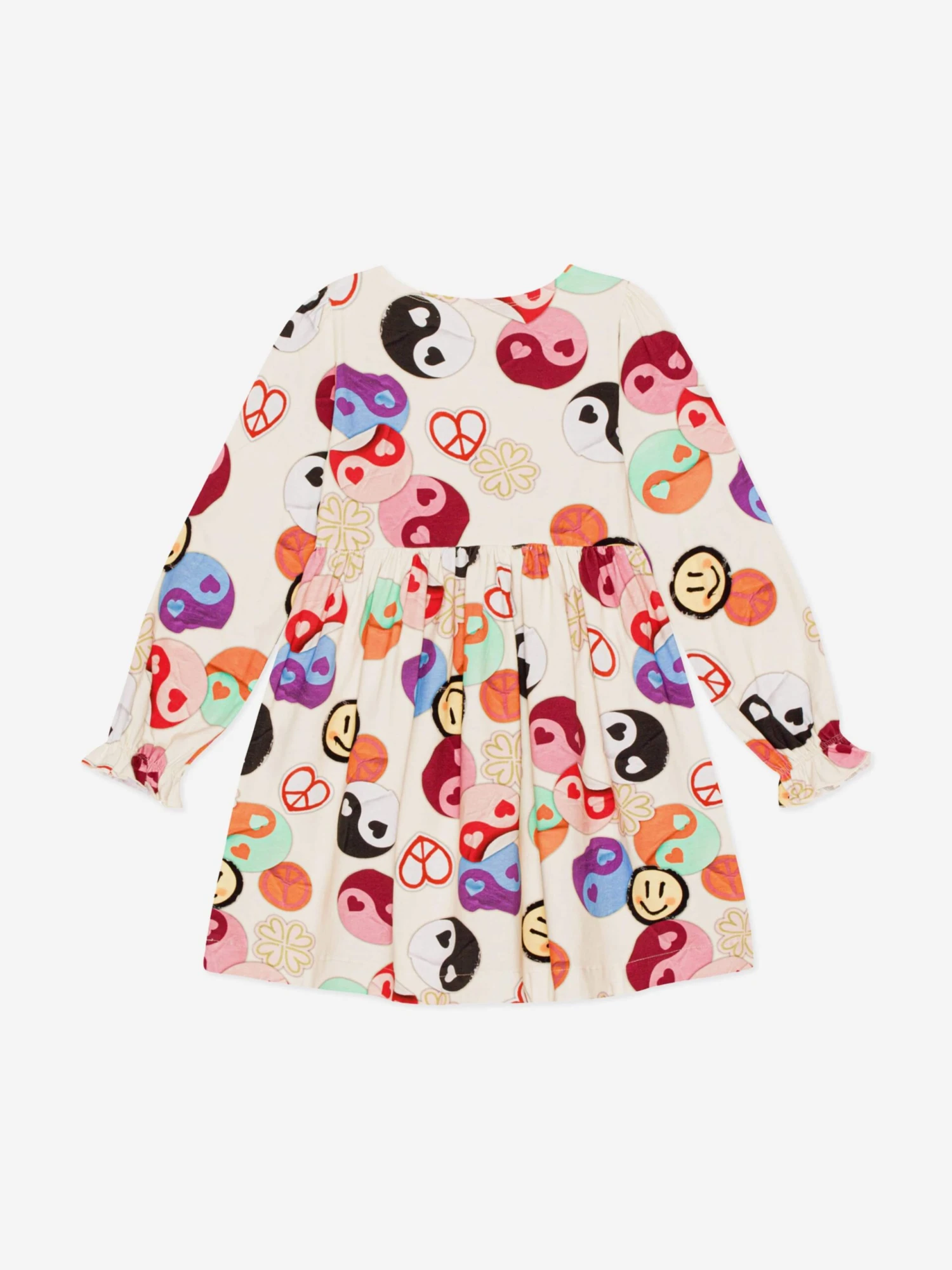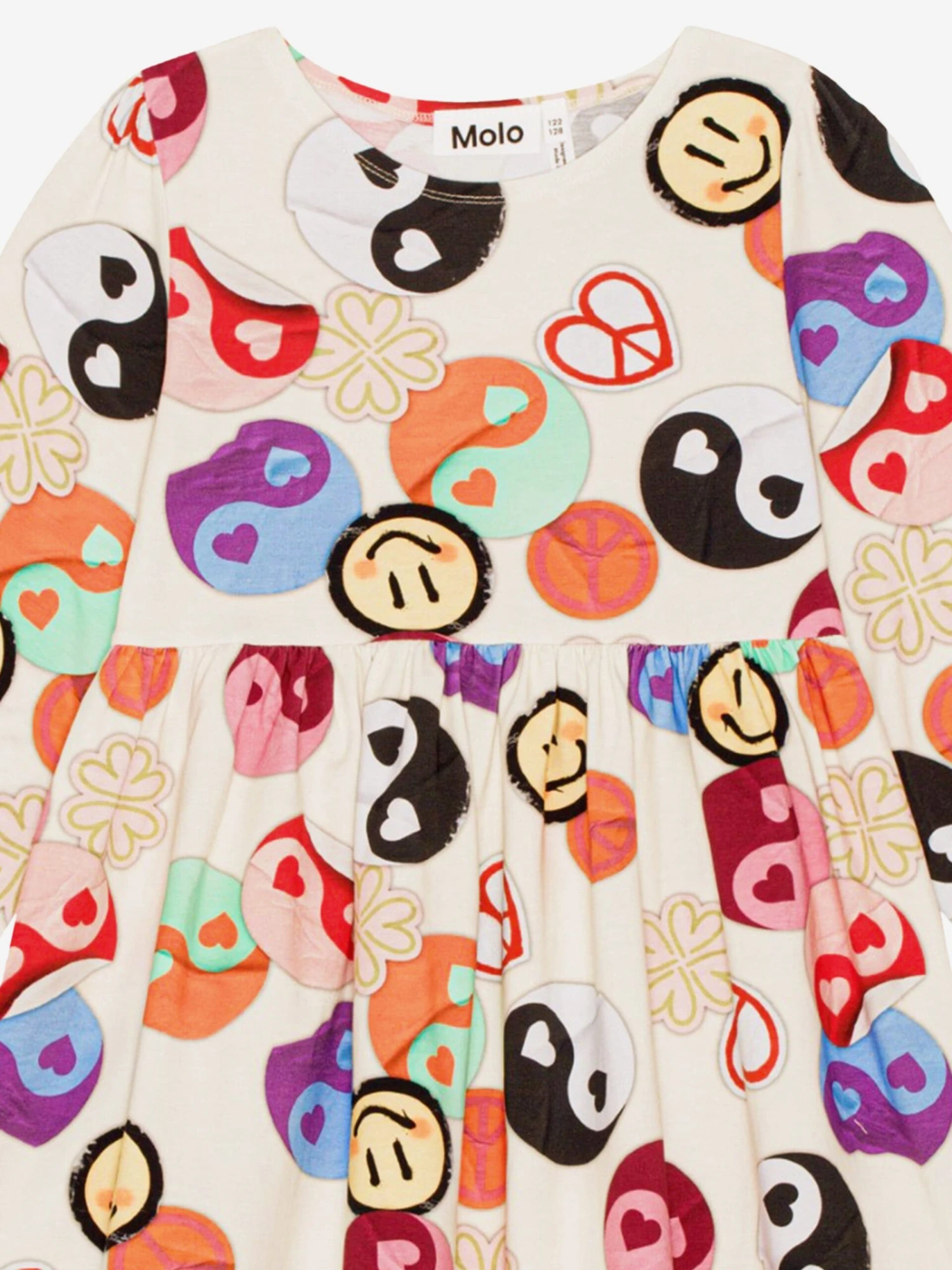 Molo inject passion and an eccentric outlook into their aesthetics. This girls Ying & Yang dress is reflective of the label’s ostentatious technological properties. Inspired by the hippy culture of the 60s. It is crafted in organic cotton with a round neck and long sleeves with a small ruffle edge. The skirt of the dress is full and has a beautiful, weighty drape. The print is of multi-coloured Yin & Yang stickers.