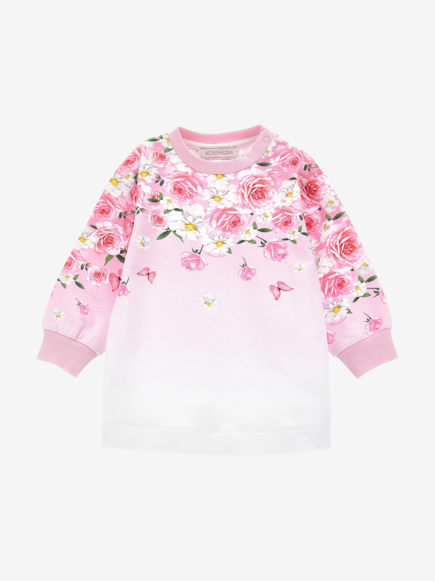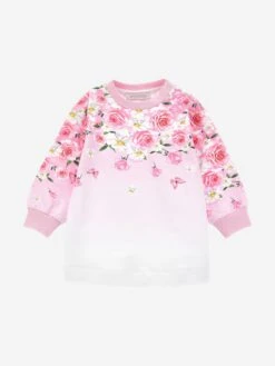 Monnalisa’s passion for dreamy, otherworldly abstracts is embodied in this baby girls sweater dress. Envisioned in beautiful cotton fleece via a shaded fabric with placed romantic floral and butterfly imagery showcasing the front. She will look and feel divine.
