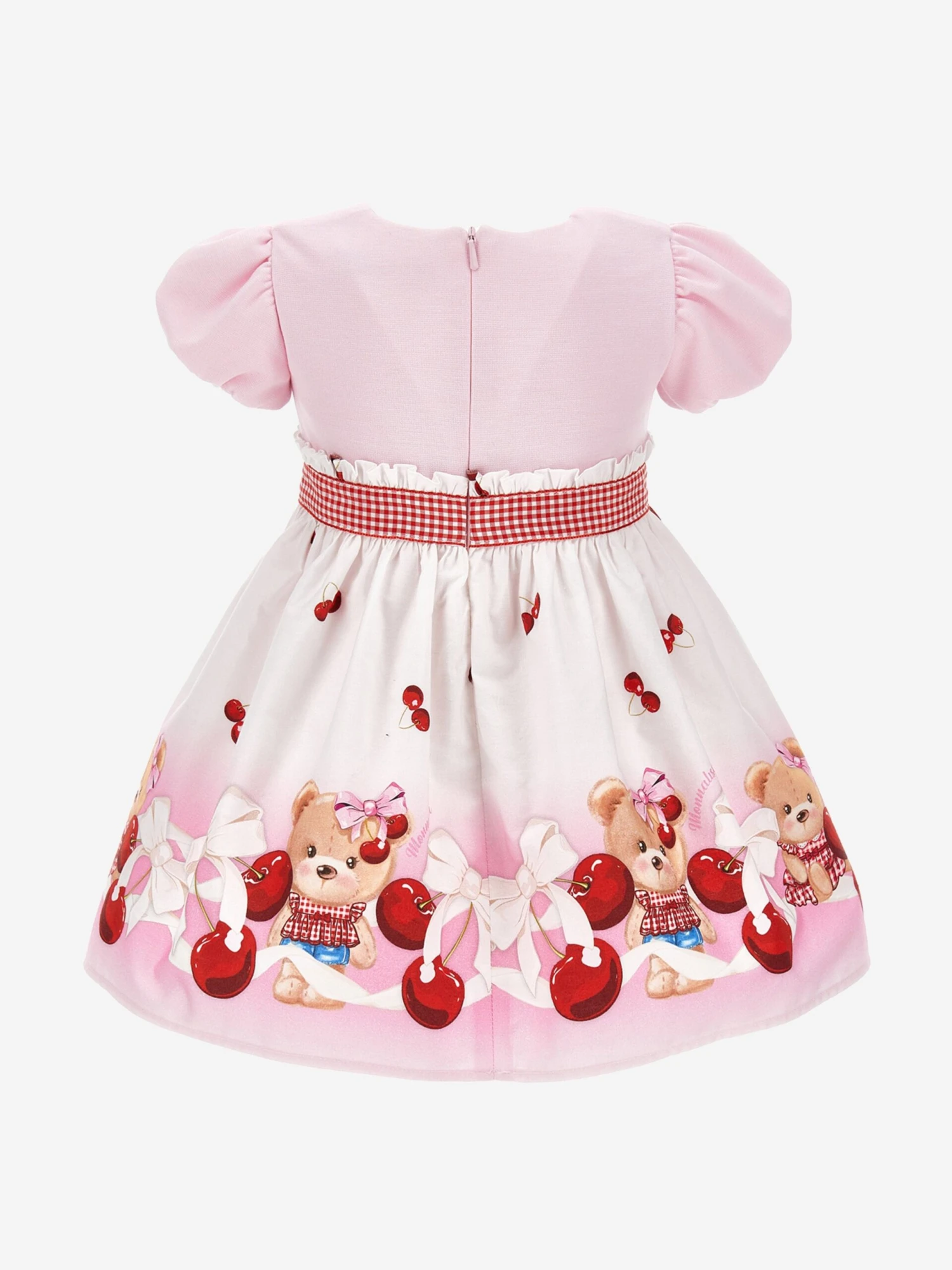 Monnalisa incorporate passion and innovation in their beautifully crafted designs. This girls bear poplin dress is reflective of the Italian label’s passion for charming, ethereal abstracts. Crafted with a Milano stitch top and poplin skirt. It showcases a graduated garland-effect print with teddy bear, bows and cherries. She will be obsessed.