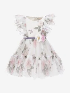 rose print dress captures the label’s passion for traditional abstracts. Crafted in a spellbinding tulle design with all over rose print, the cap sleeves are decorated with a trim and a belt with a rose appliqué at the waist. She will look and feel divine.