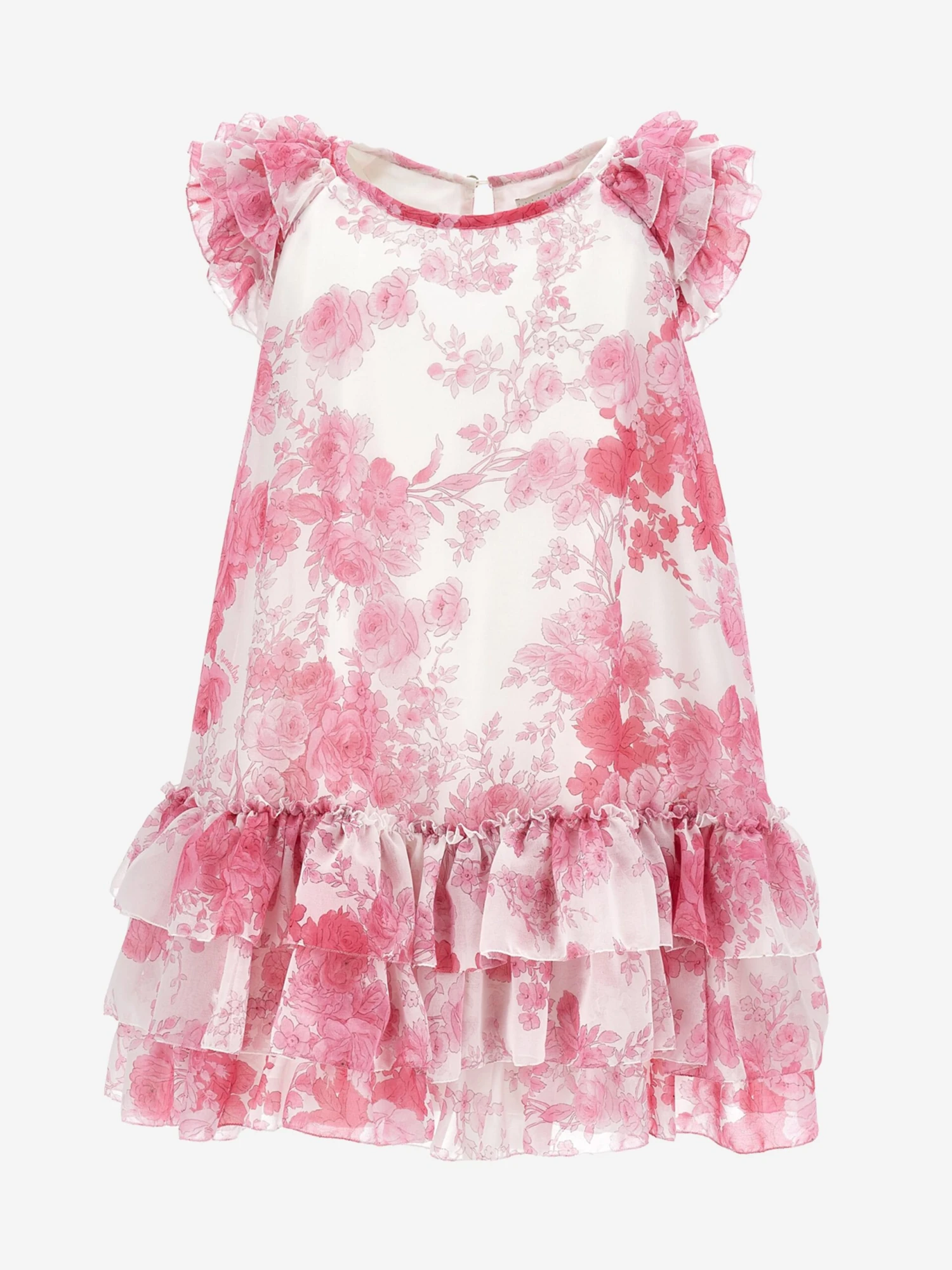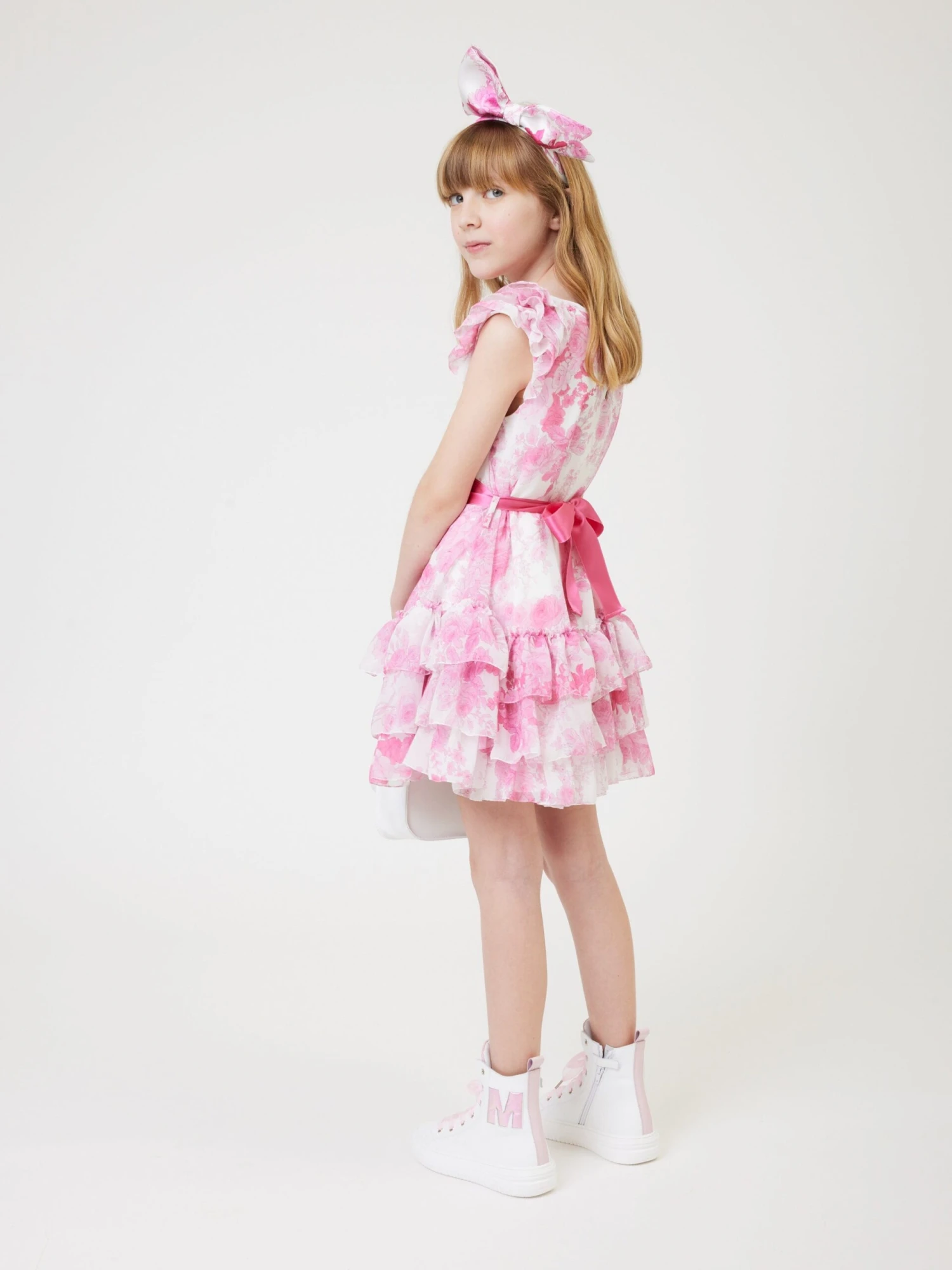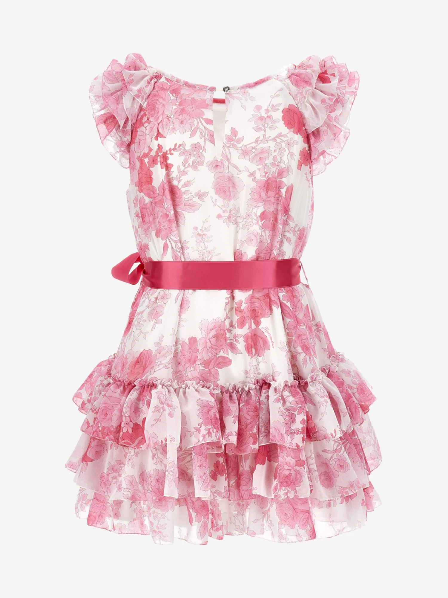 Monnalisa’s passion for dreamy, otherworldly abstracts is embodied in this girls low-waisted tulle dress. Inspired by romantic imagery and Renaissance themes. It showcases a botanical print georgette, contrasting dark pink ribbon and a round neckline with ruffled sleeves. The skirt is depicted in small flounces with muslin and semi-stiff tulle flounces and lining. She will embody a mini-Juliet.