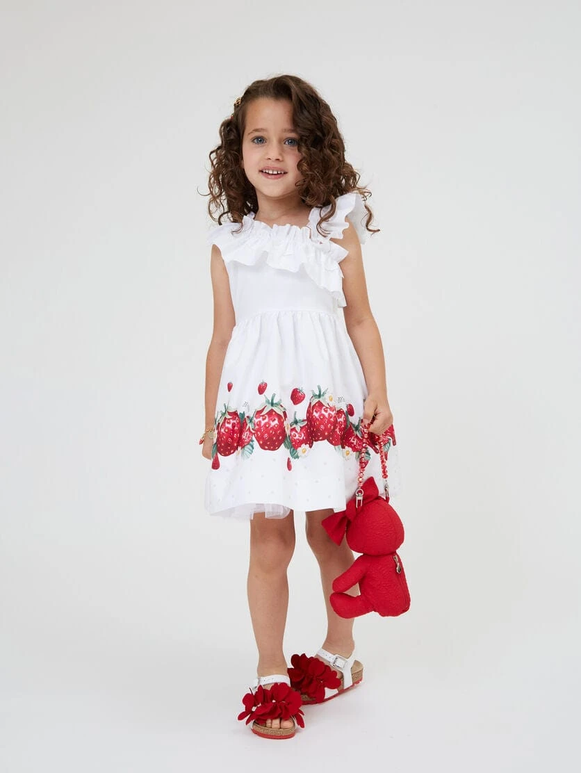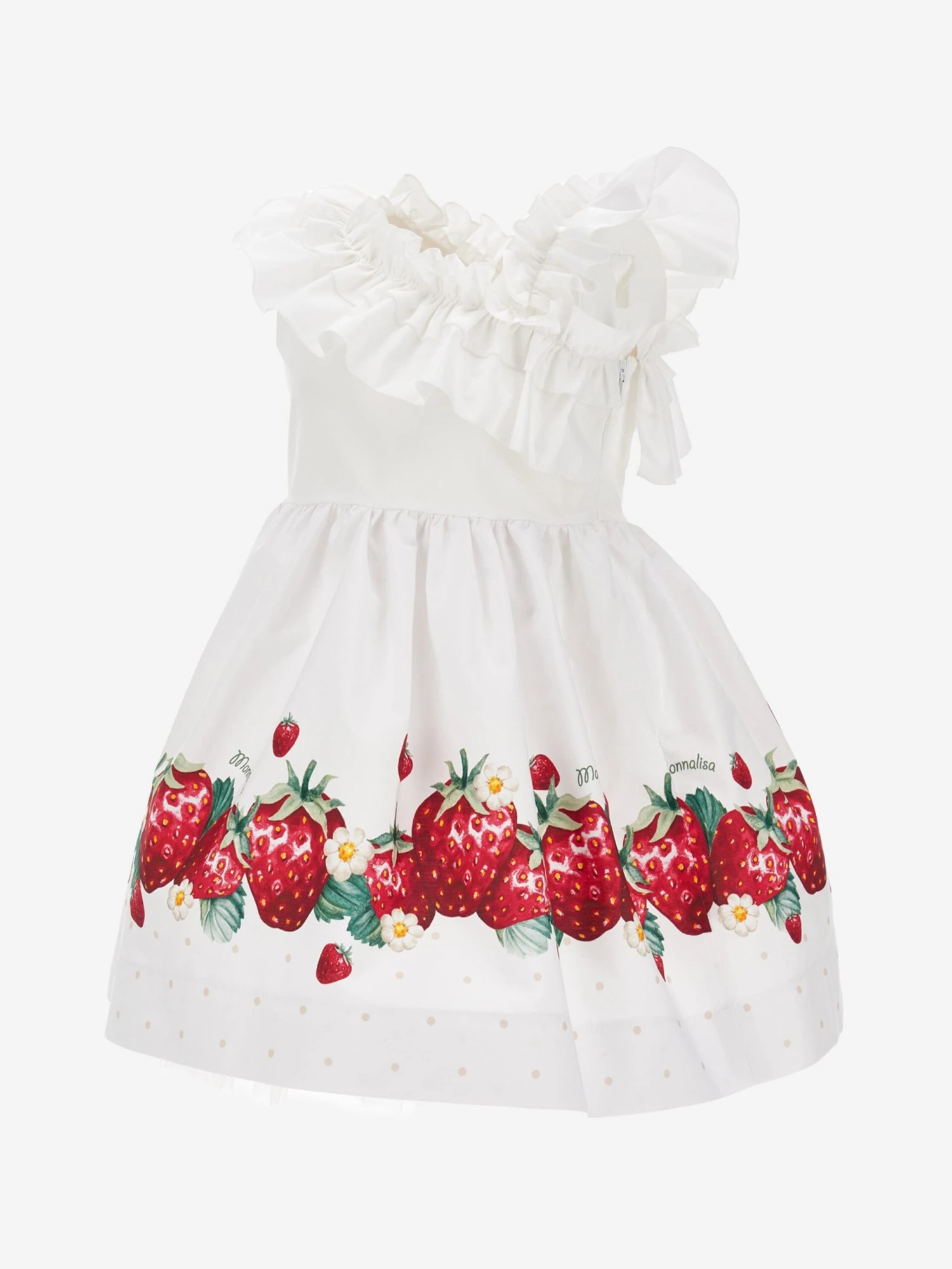 Monnalisa’s dreamy Avant-Garde aesthetics are both charming and divine. This girls one-shoulder poplin dress embodies passion and high quality detailing. Depicted in high quality cotton with ruffled detailing, an asymmetric neck and strawberry print. It is a piece fit for every girl with style.