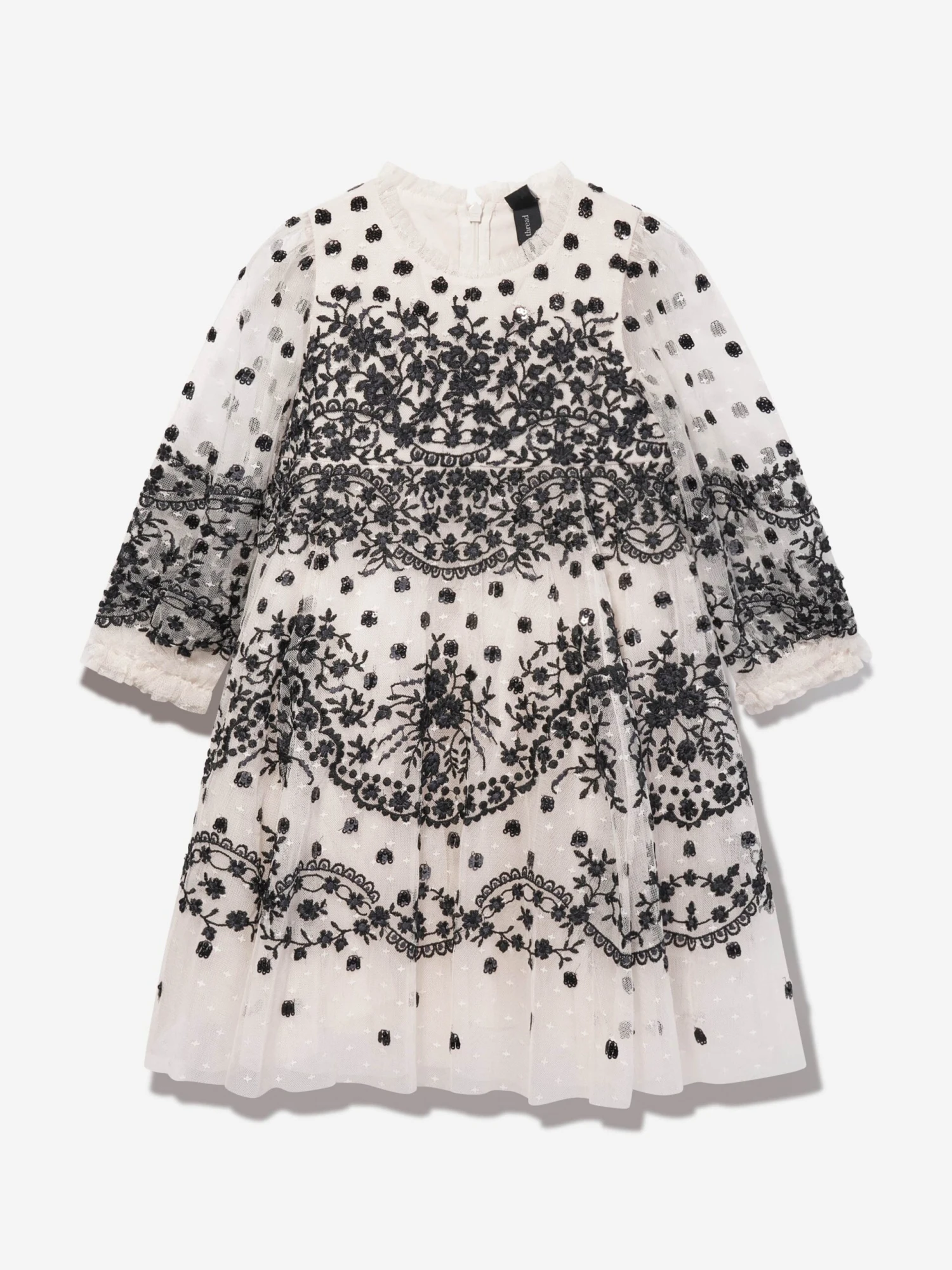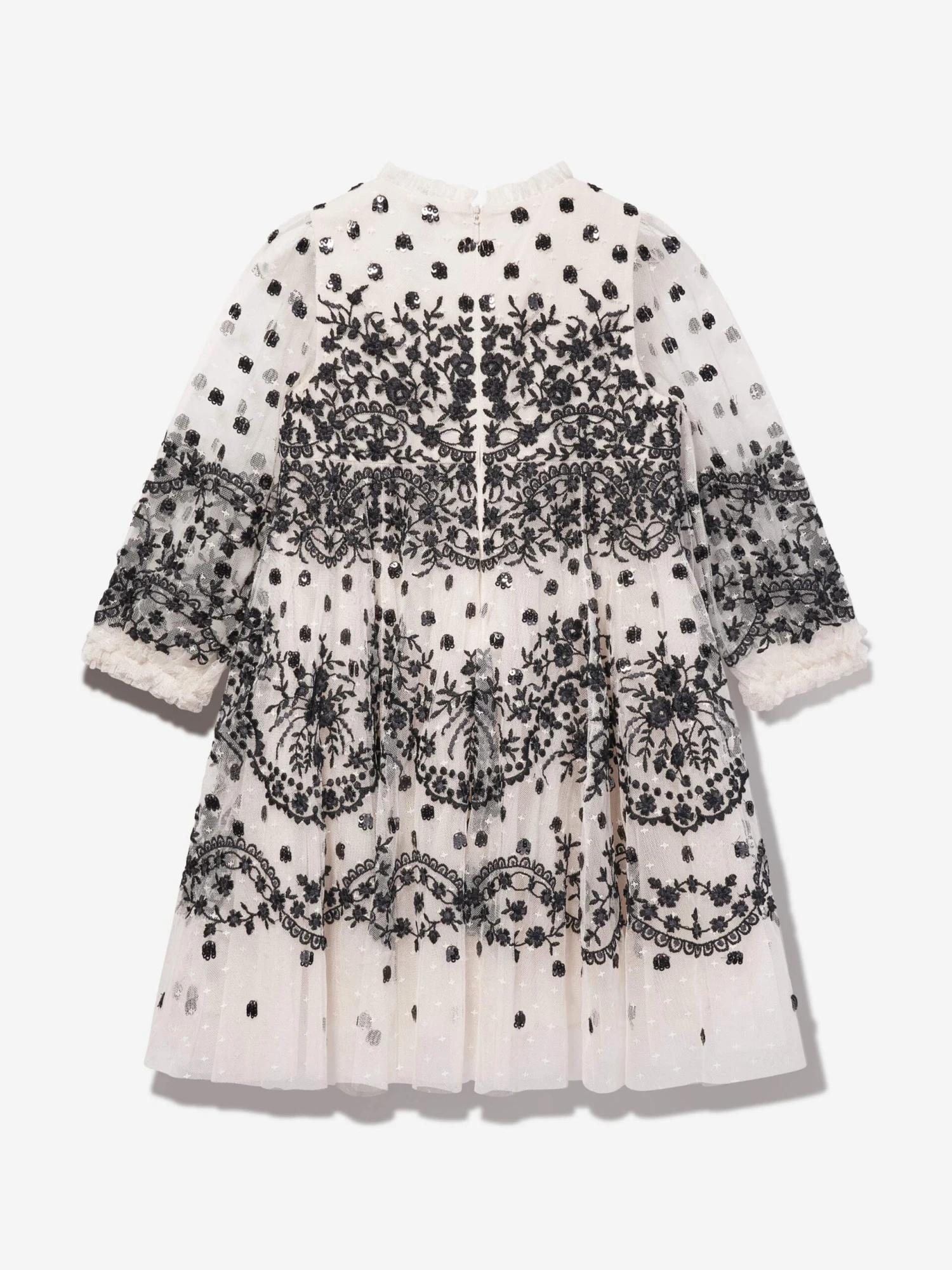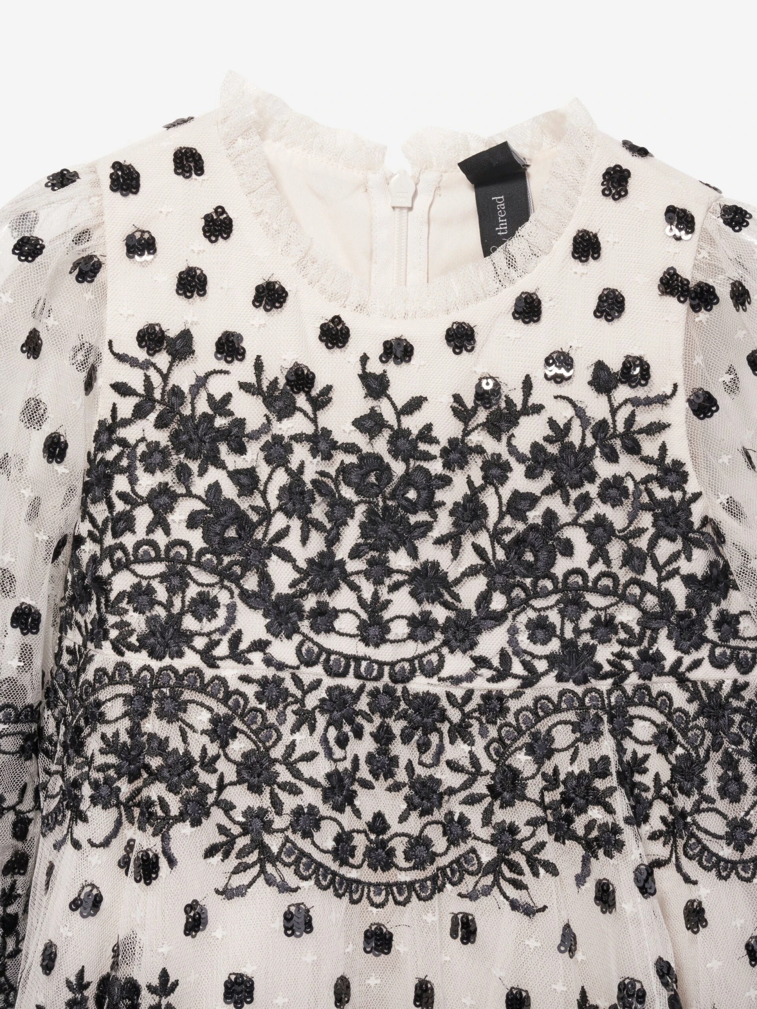 Taking inspiration from early 1900s fabric styles. This Beatrice kids dress by Needle & Thread is a combination of tradition and innovation. Made in a netted tulle material with mesmeric black polka dot patterning, tiered layering and long elasticated puffy sleeves. She will emanate unparalleled sophistication.