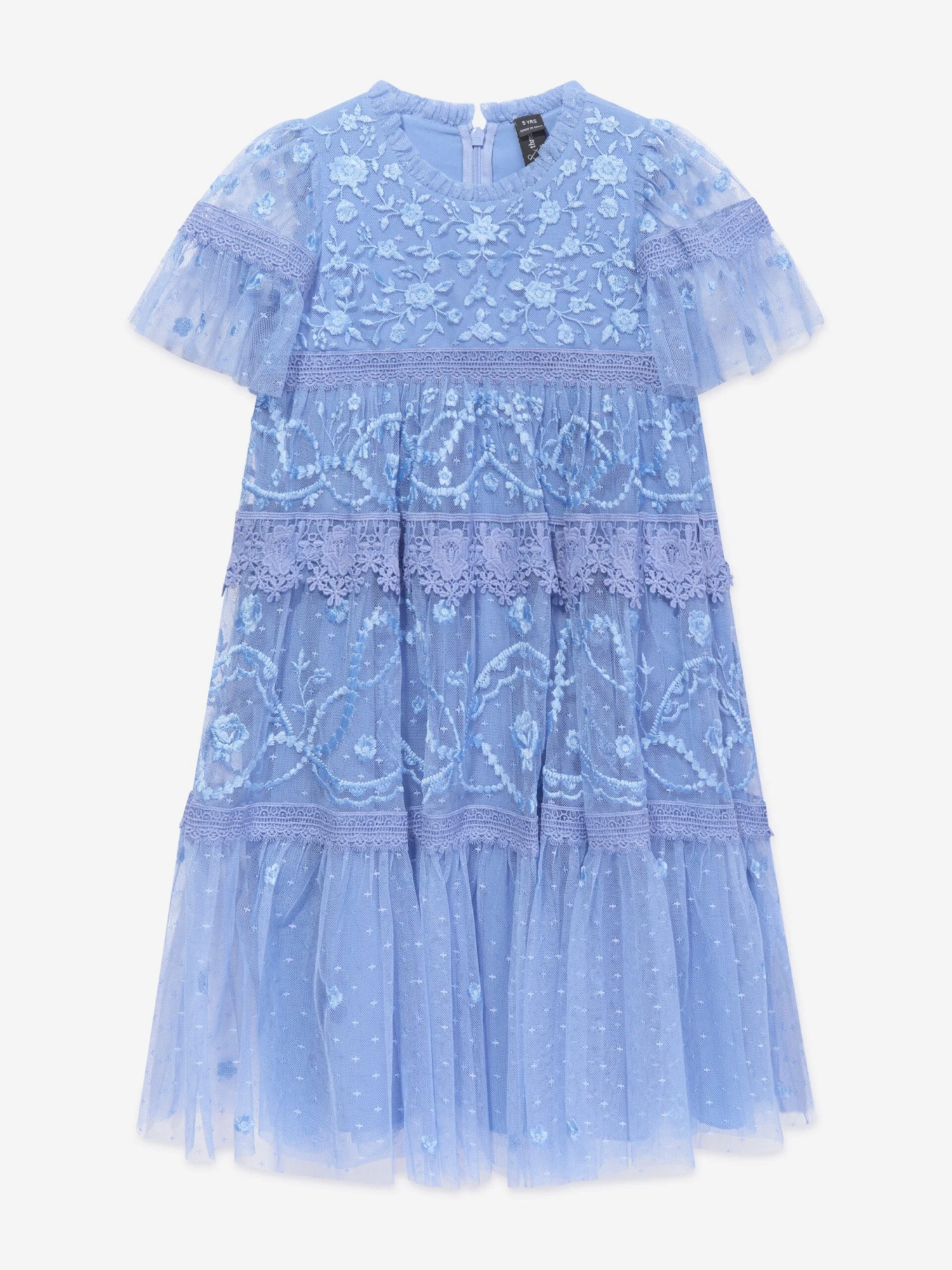 Introducing the Girls Midsummer Lace Dress in Blue by Needle And Thread, crafted specifically for weddings, adding a soothing tone to your girl’s wardrobe. Detailed key features: