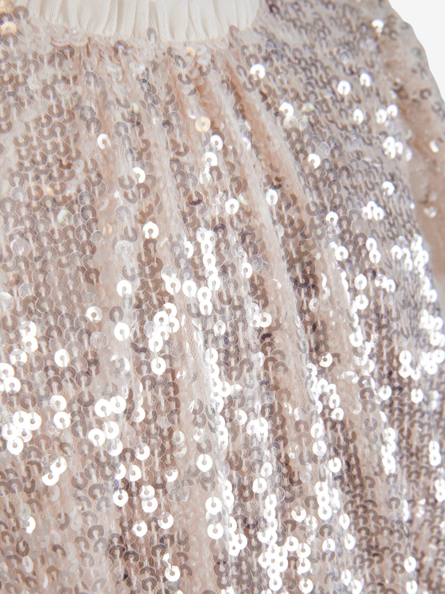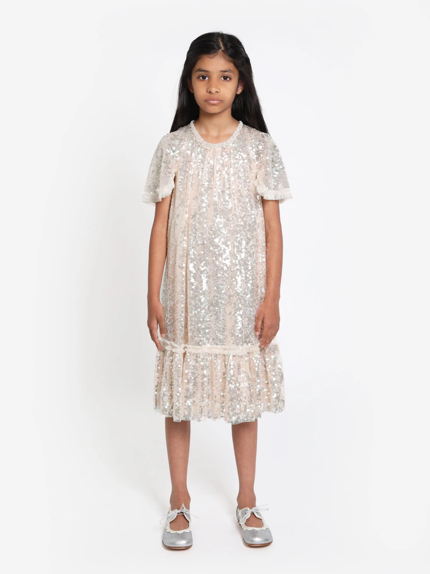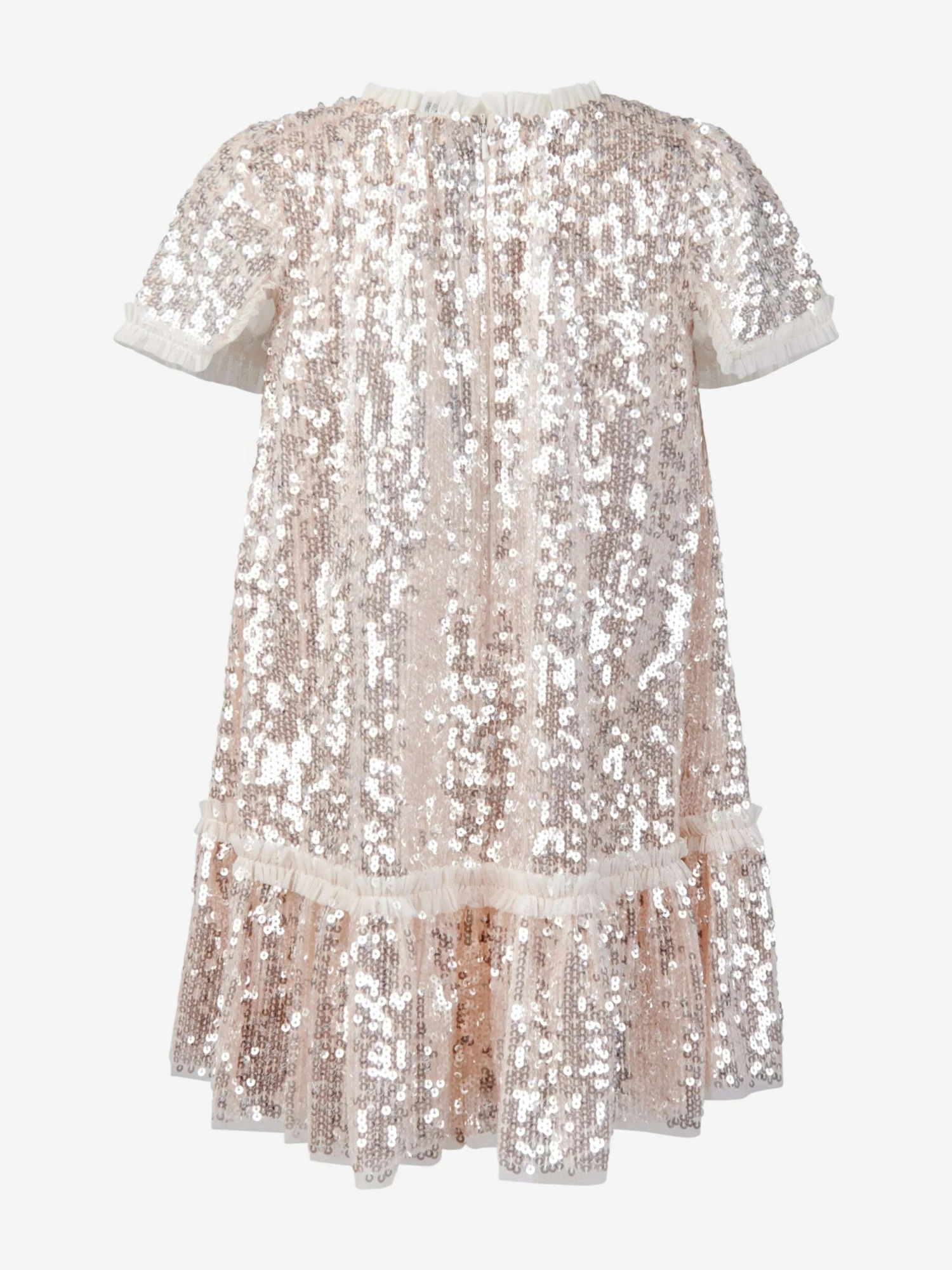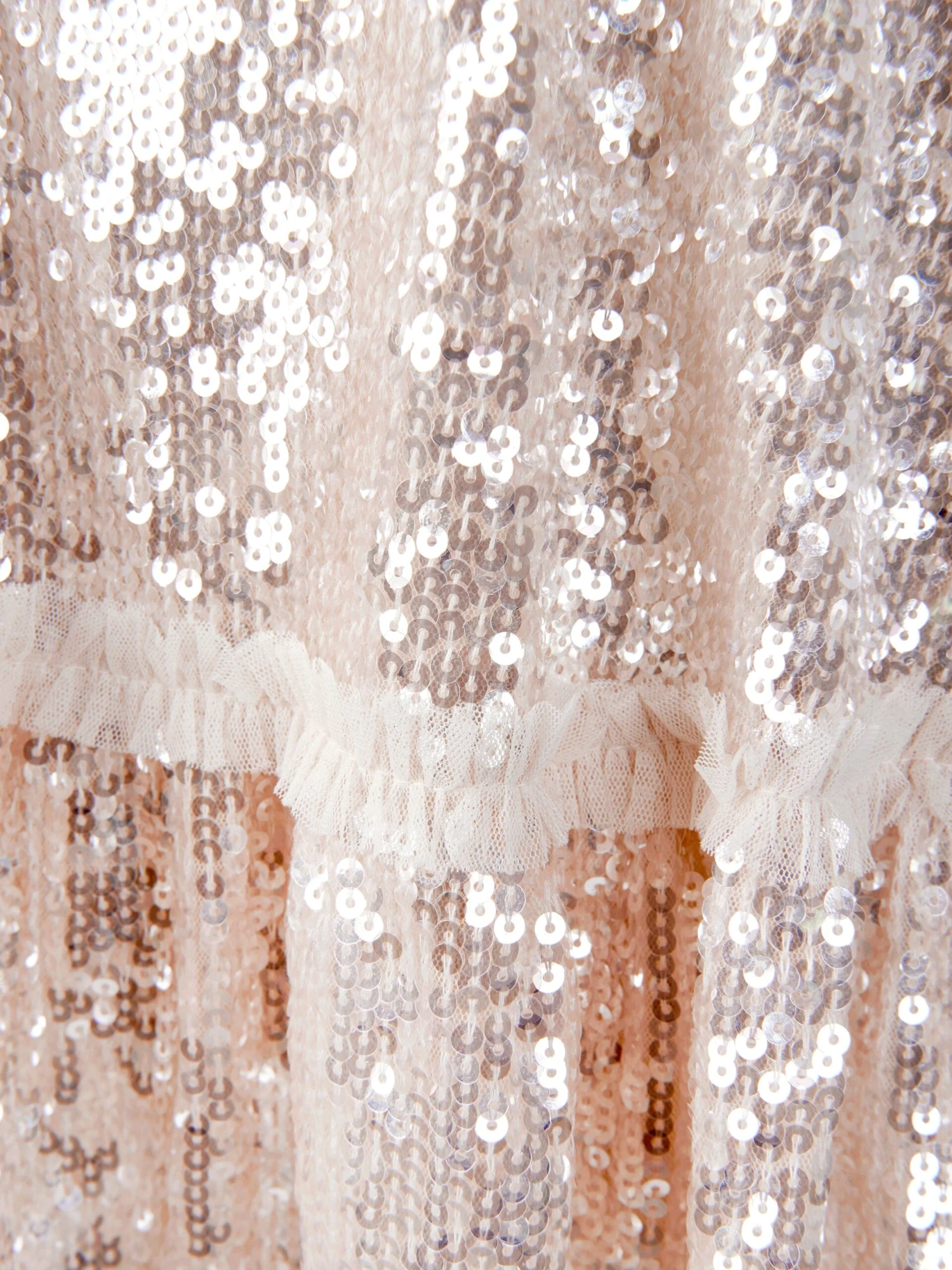Needle & Thread incorporate exquisite detailing and pearlescent settings into their refined abstracts. This girls Mila gloss dress in cream captures the label’s preference for a bygone era. Made in an allover sequin detail with a tiered structure, short sleeves and netted material. She will be obsessed.