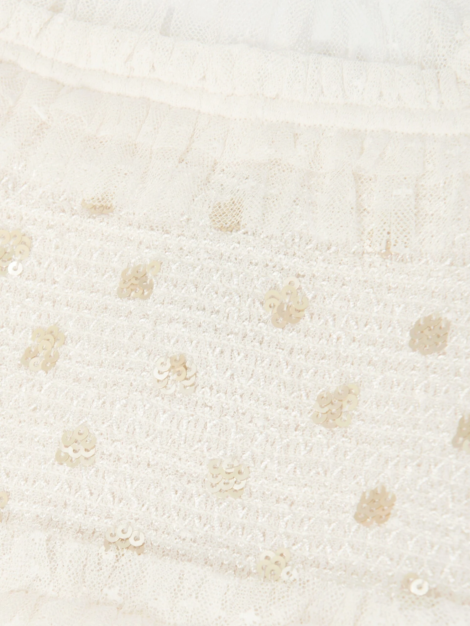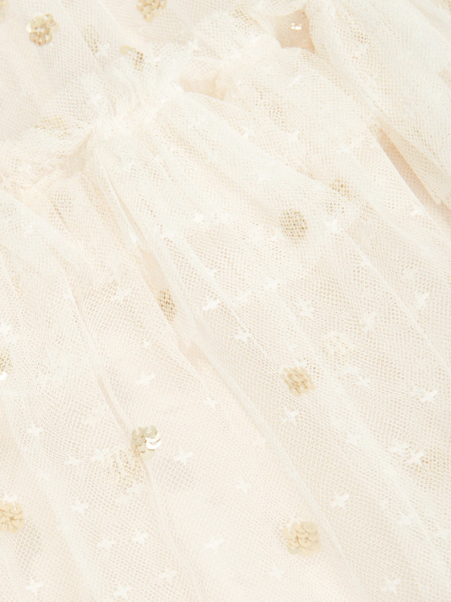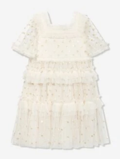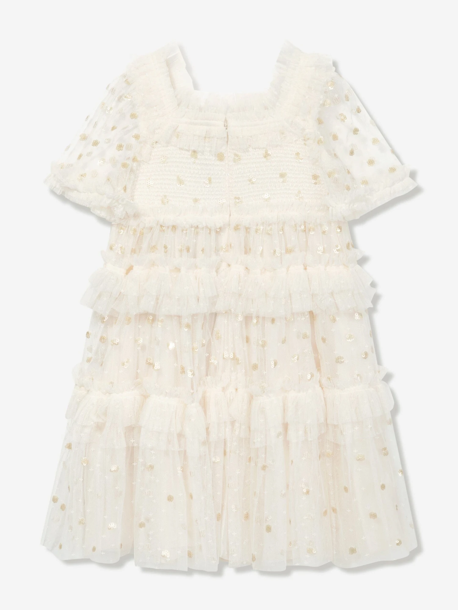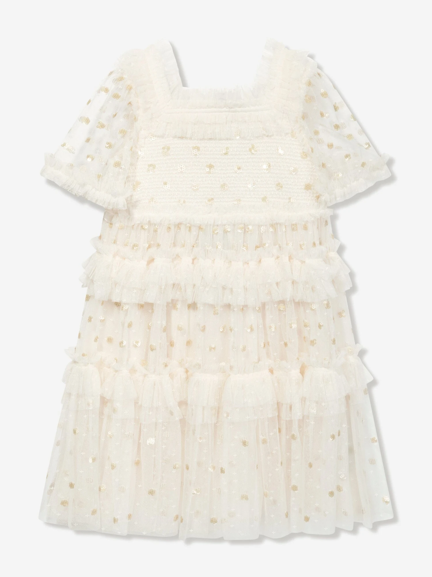 Introducing the Girls Polka Dot Smocked Dress in Ivory by Needle And Thread, a sublime addition to your little girl’s fashion collection. Its key highlights include: