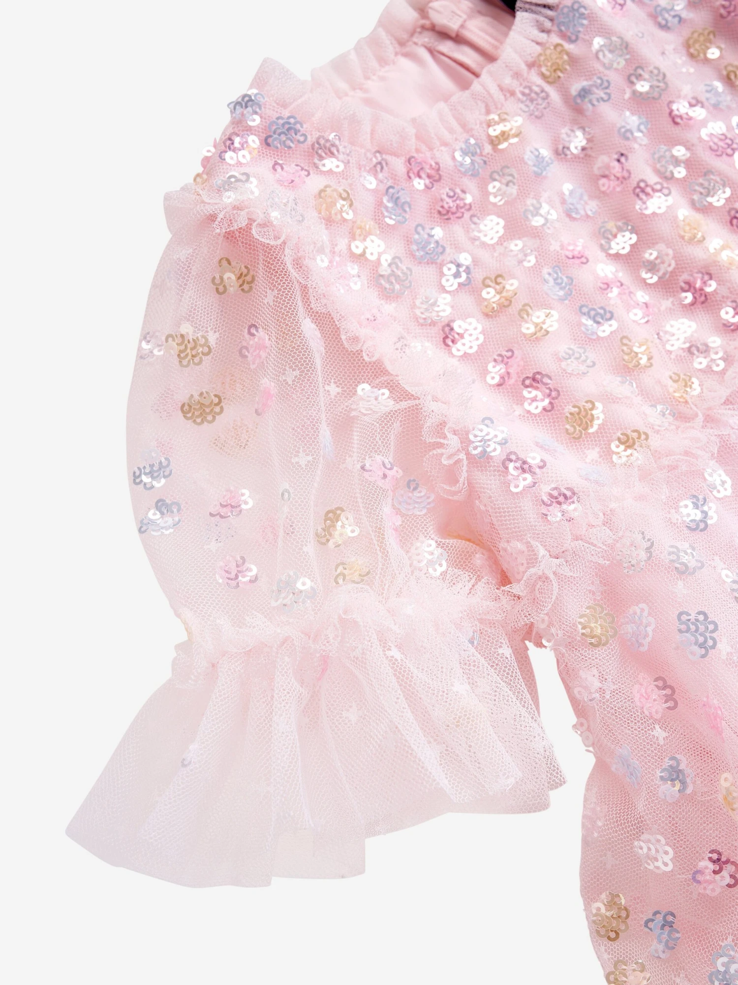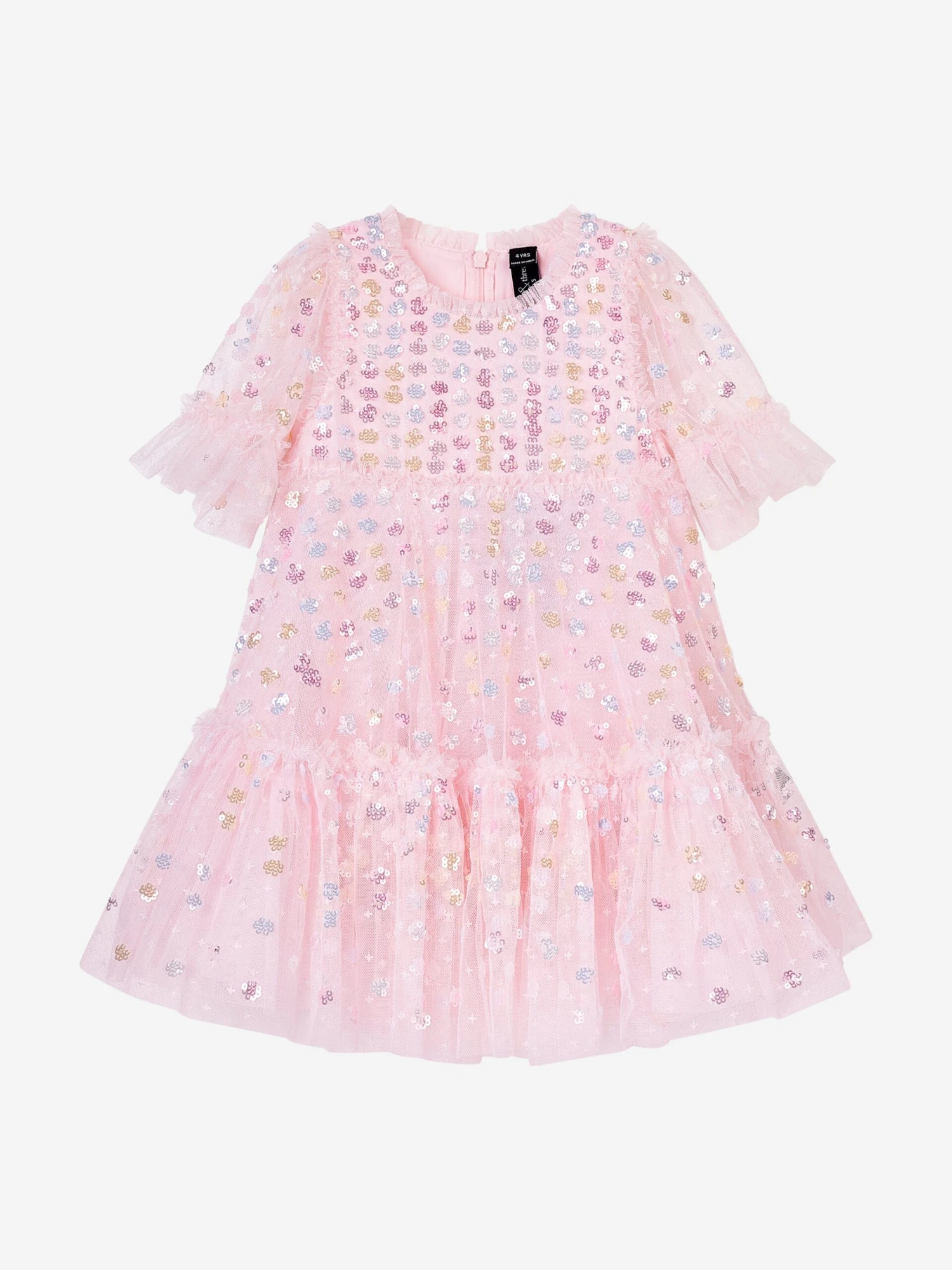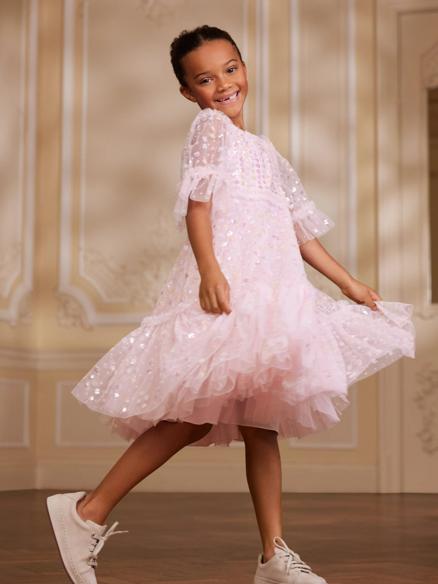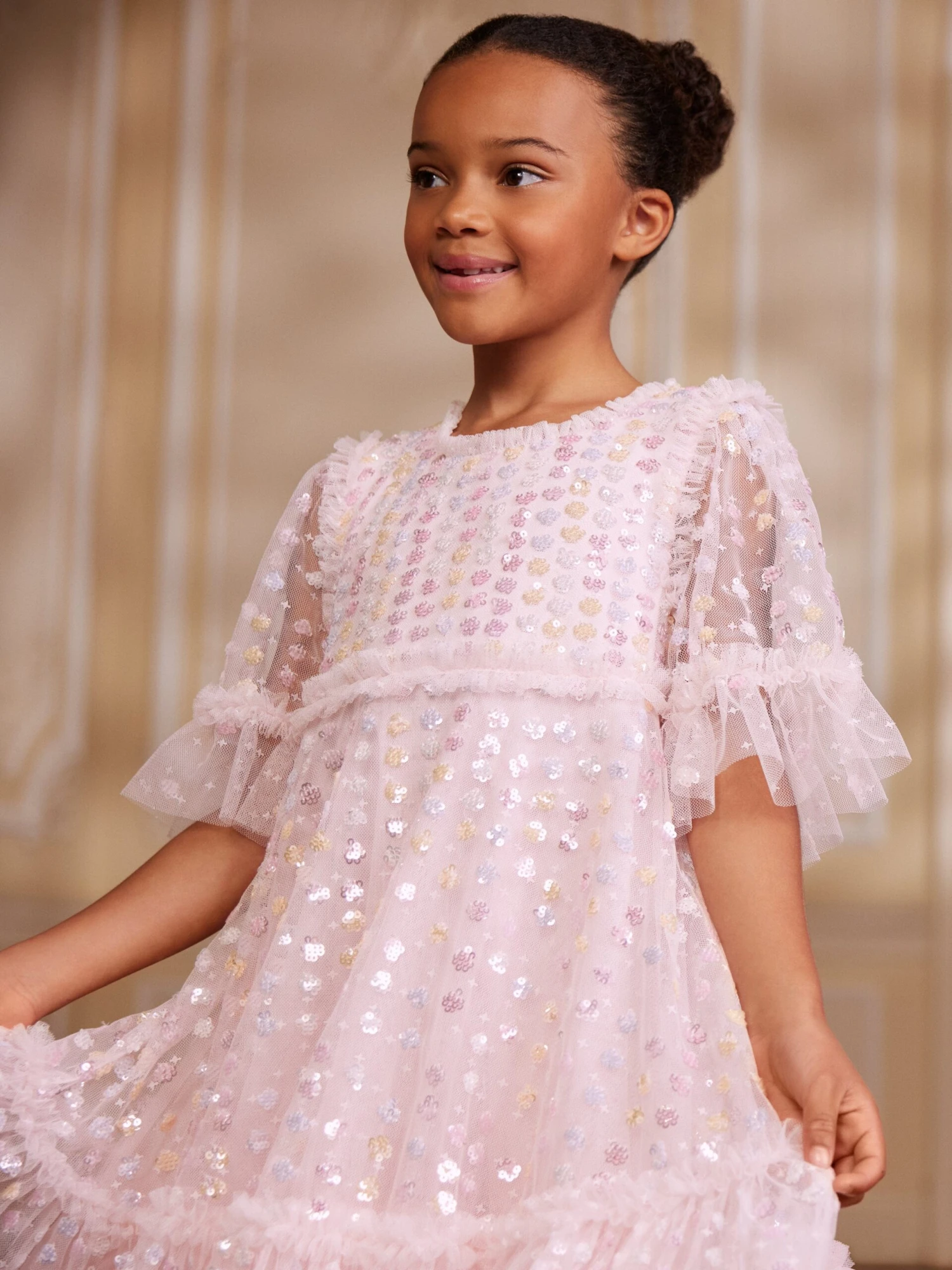 Needle & Thread envision fairy tale aesthetics in their vintage-inspired silhouettes. This girls raindrop sequin dress in peony pastel captures the British label’s whimsical, romantic outlook. Crafted in delicate tulle material with multicolour iridescent sequins, a tiered base and complex structuring. It is complete with short netted sleeves.