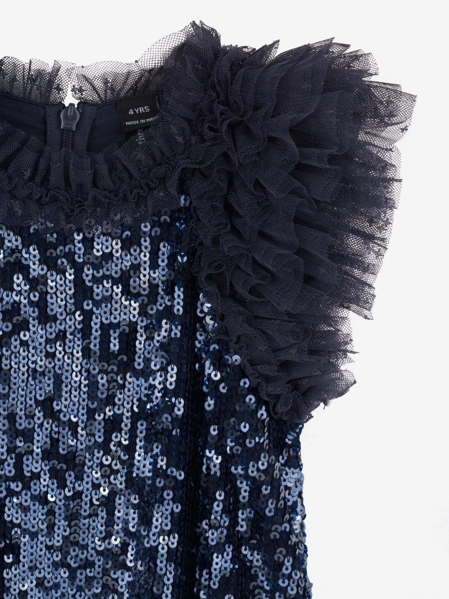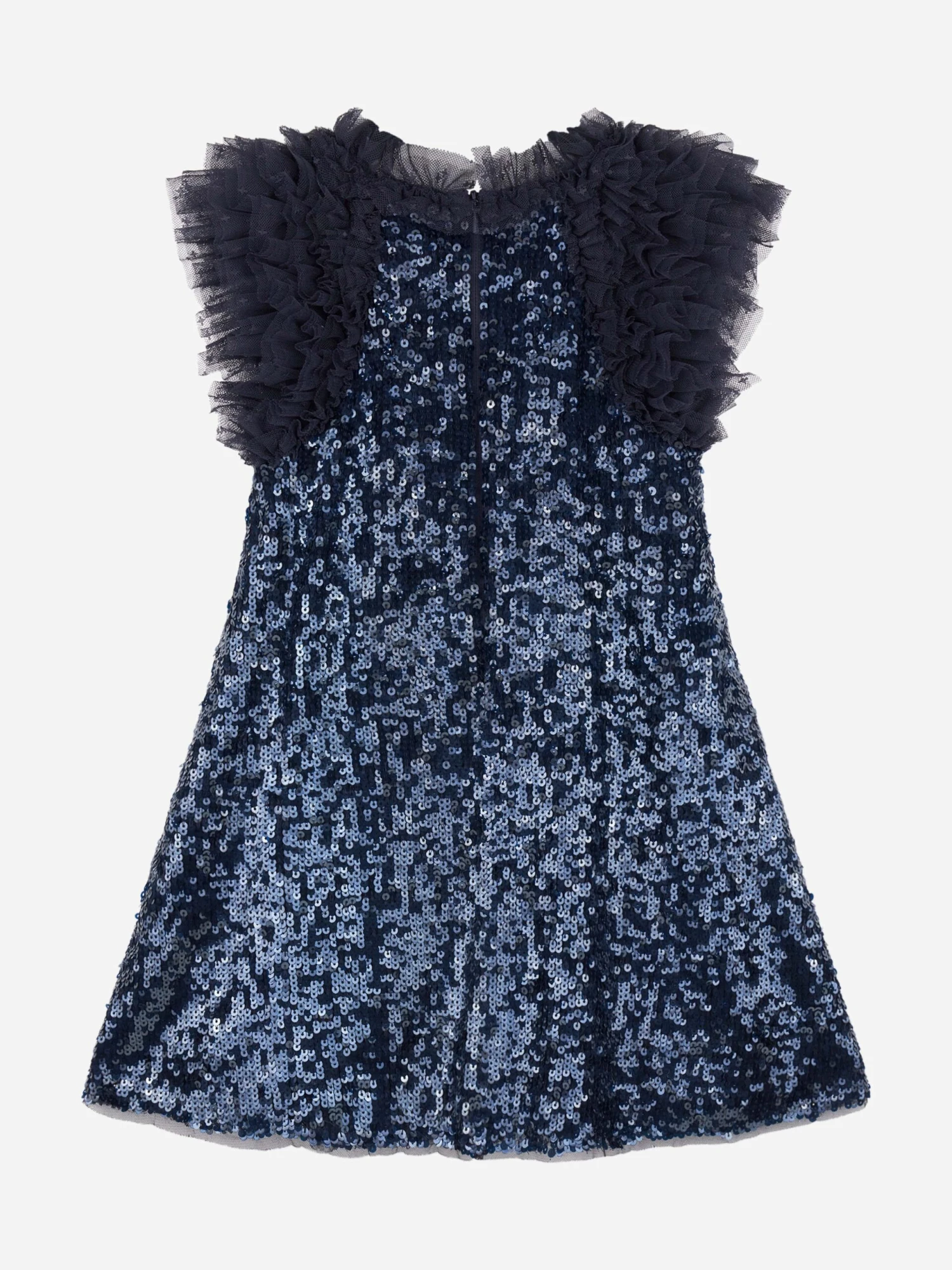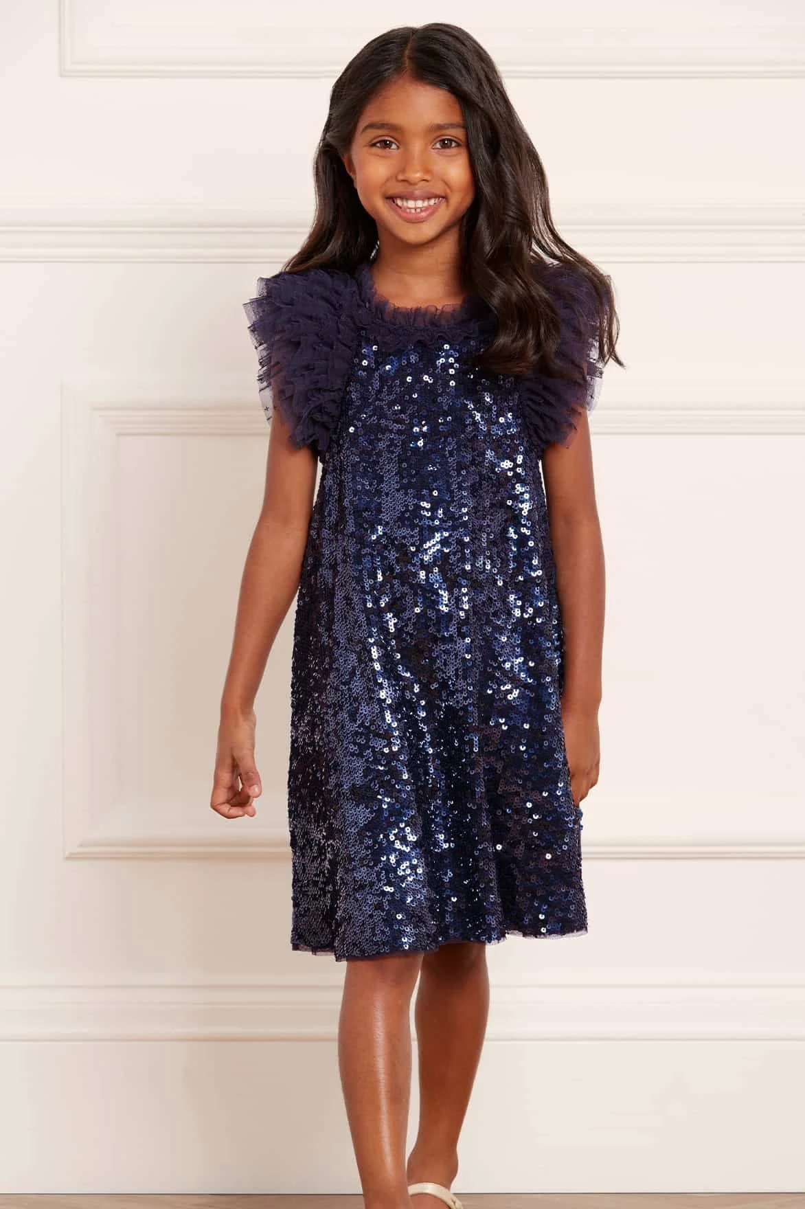 Needle & Thread sew beautiful properties into their exquisite handmade designs. This girls Stephanie navy dress captures the British label’s impeccable craftsmanship and attention to detail. Made in fine delicate cloth with allover sequins and tiered tulle ruffle sleeves/trims. She will embody unparalleled elegance.