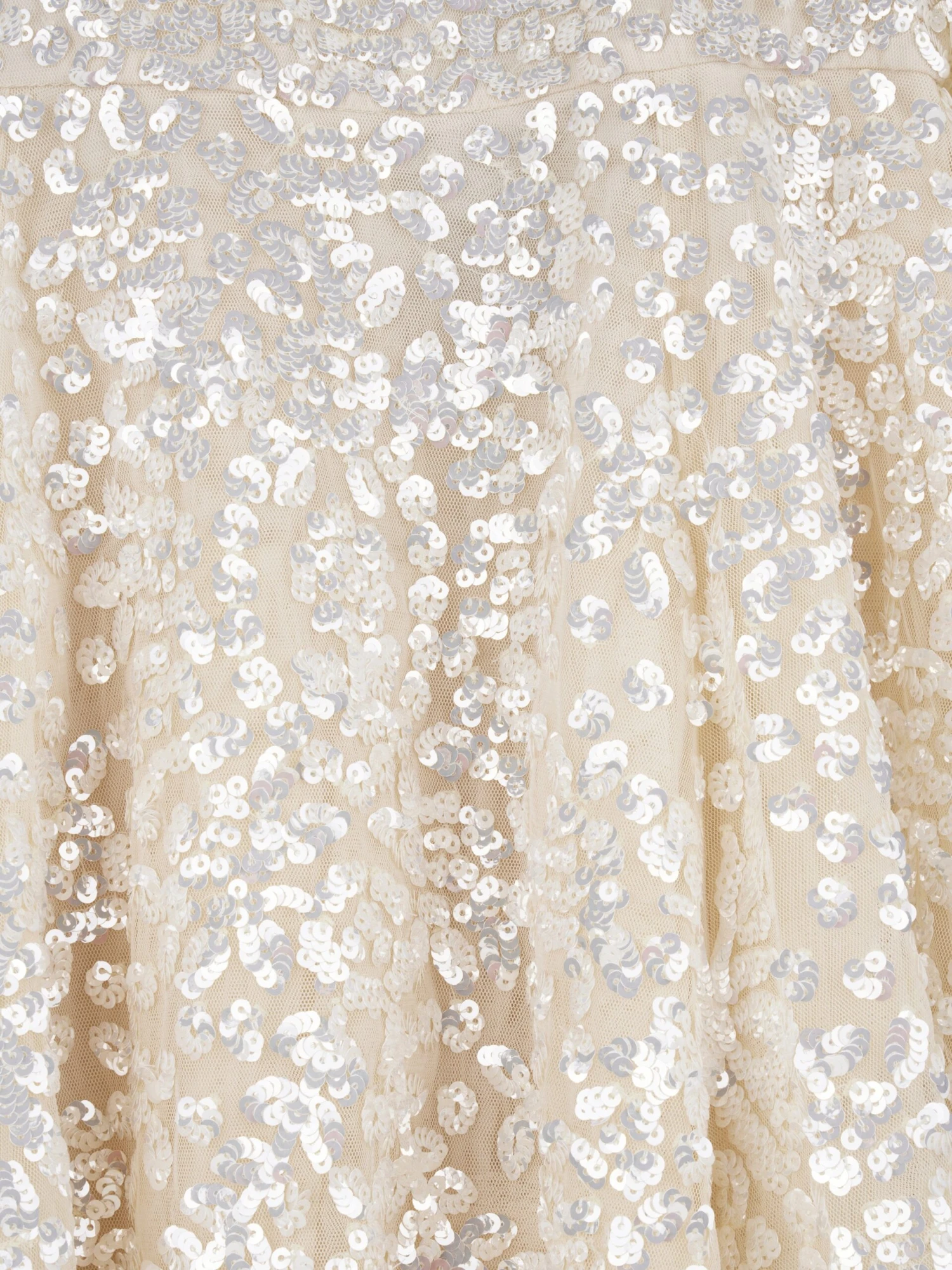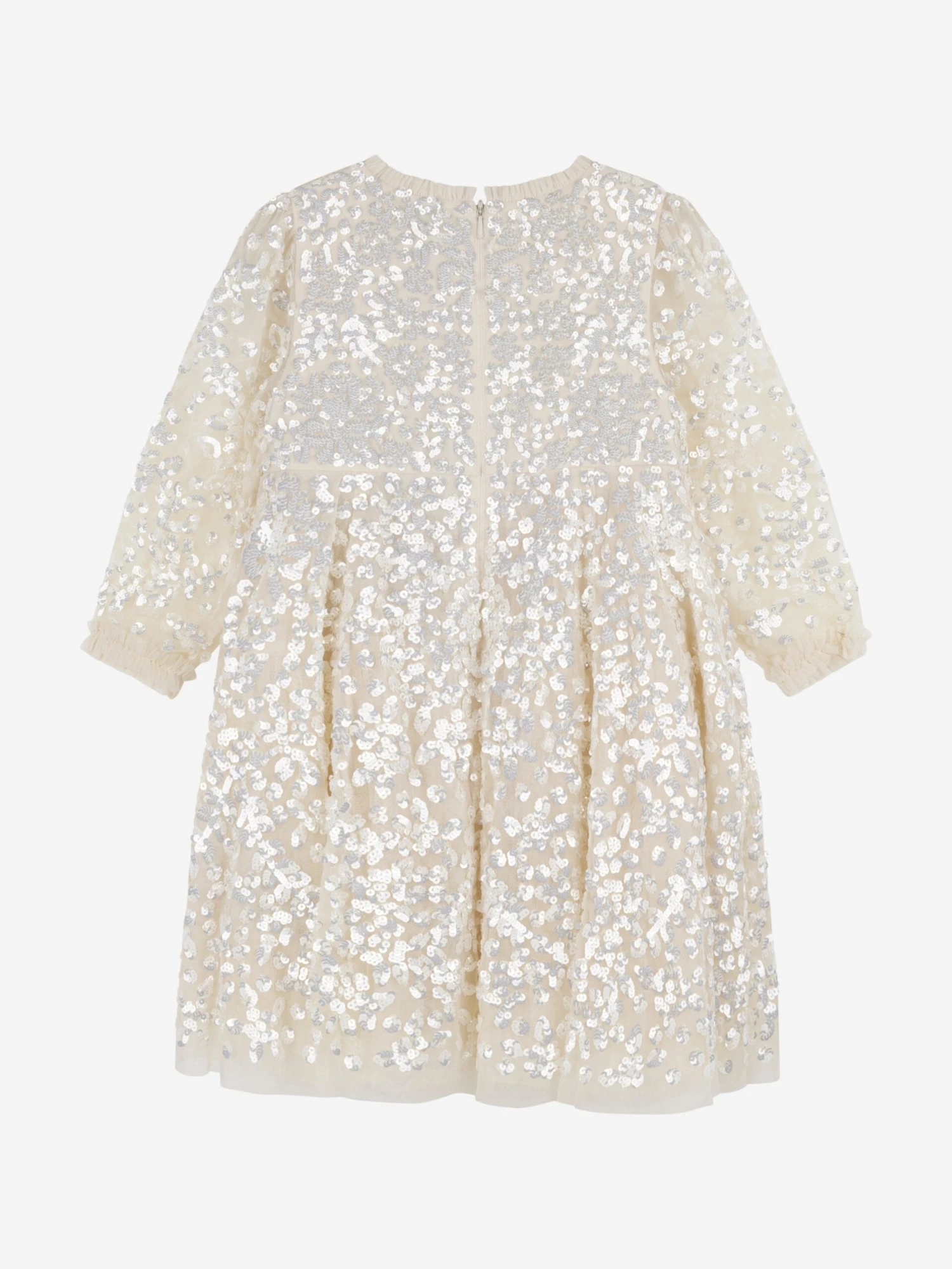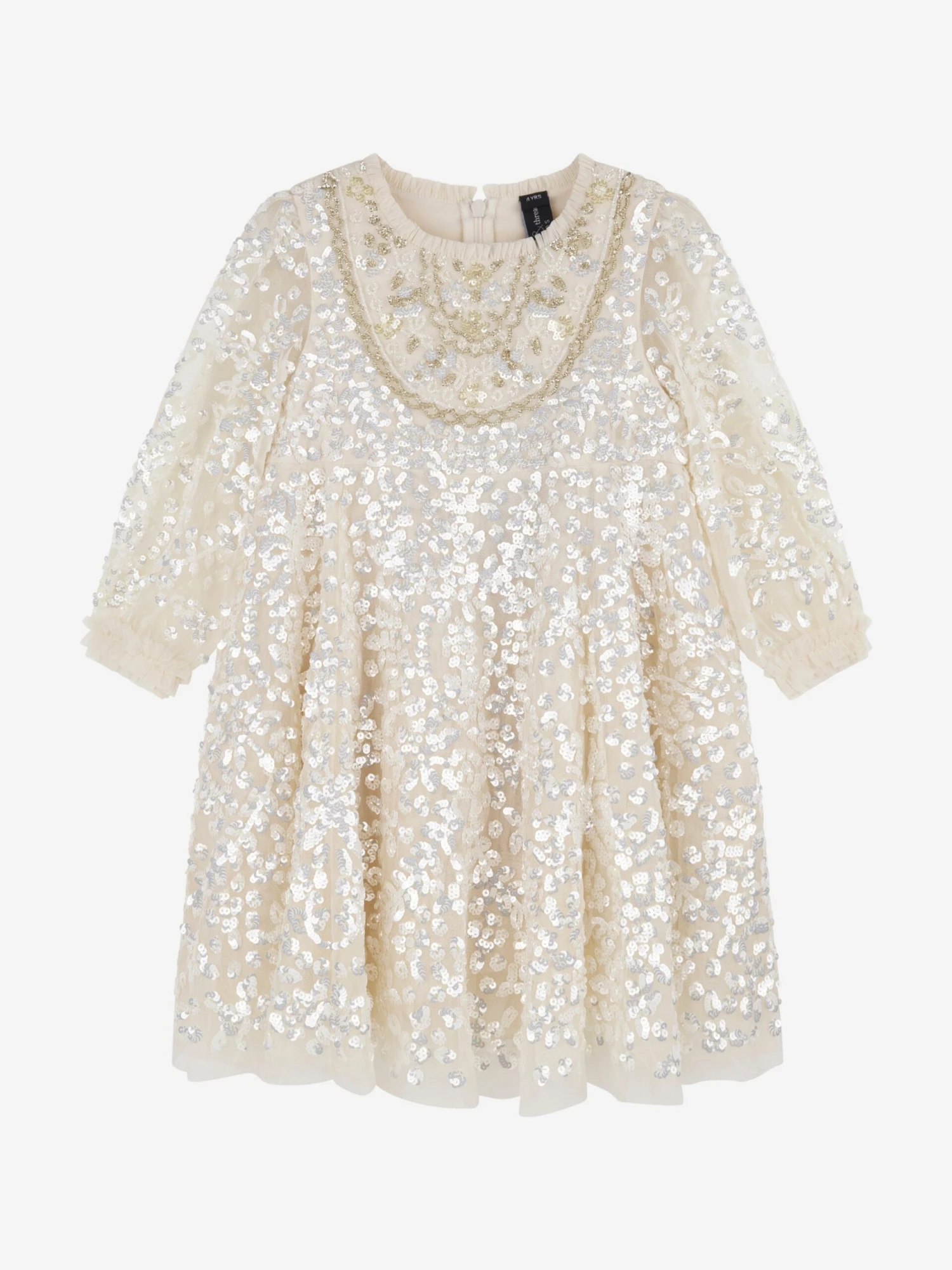 Needle & Thread envision fairytale aesthetics in their vintage-inspired silhouettes. This girls Victorian wreath gloss cream dress captures the beautiful precision and charm of the British label. Crafted with sparkling iridescent sequins on a netted tulle base via a golden effect patterned bodice, complex layering and elasticated cuffs with trims.