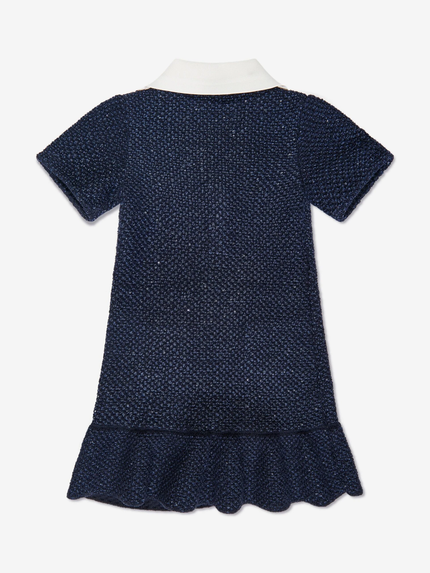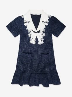 Self-Portrait envision timeless elegance and innovative into traditional designs. This girls blue sequin knit bow dress is presented in a V-neck construction with a bow and beautifully coordinated floral embroidery in white. Made in an intricate knitted material with two front pockets and a tiered dainty curved hem.