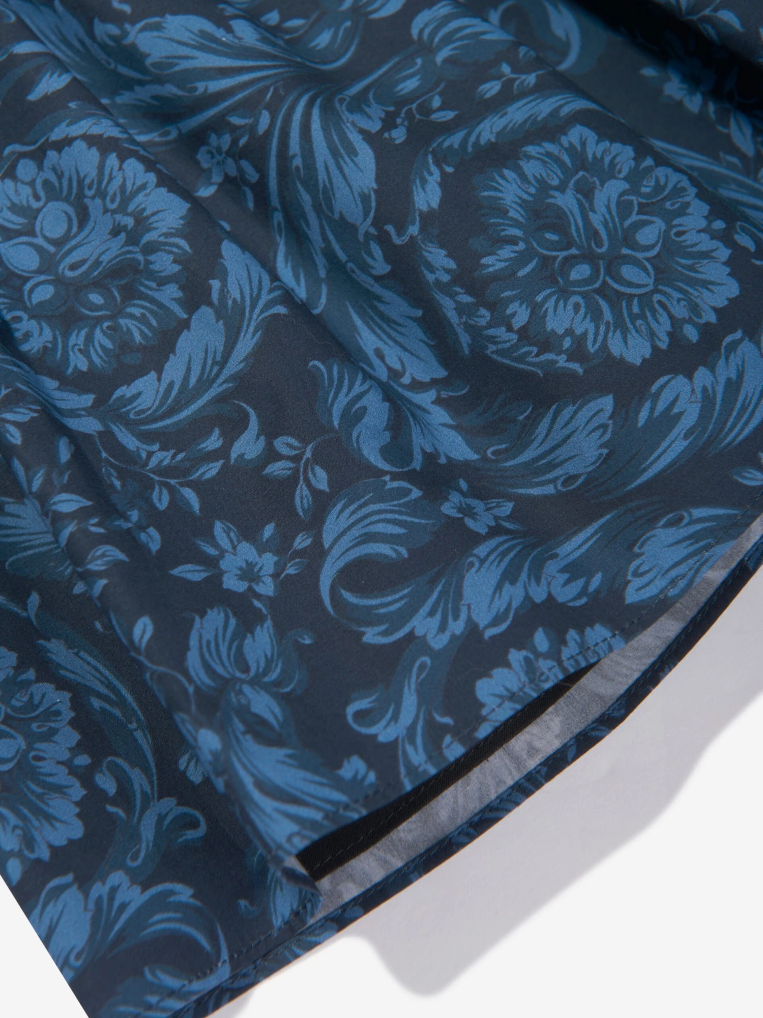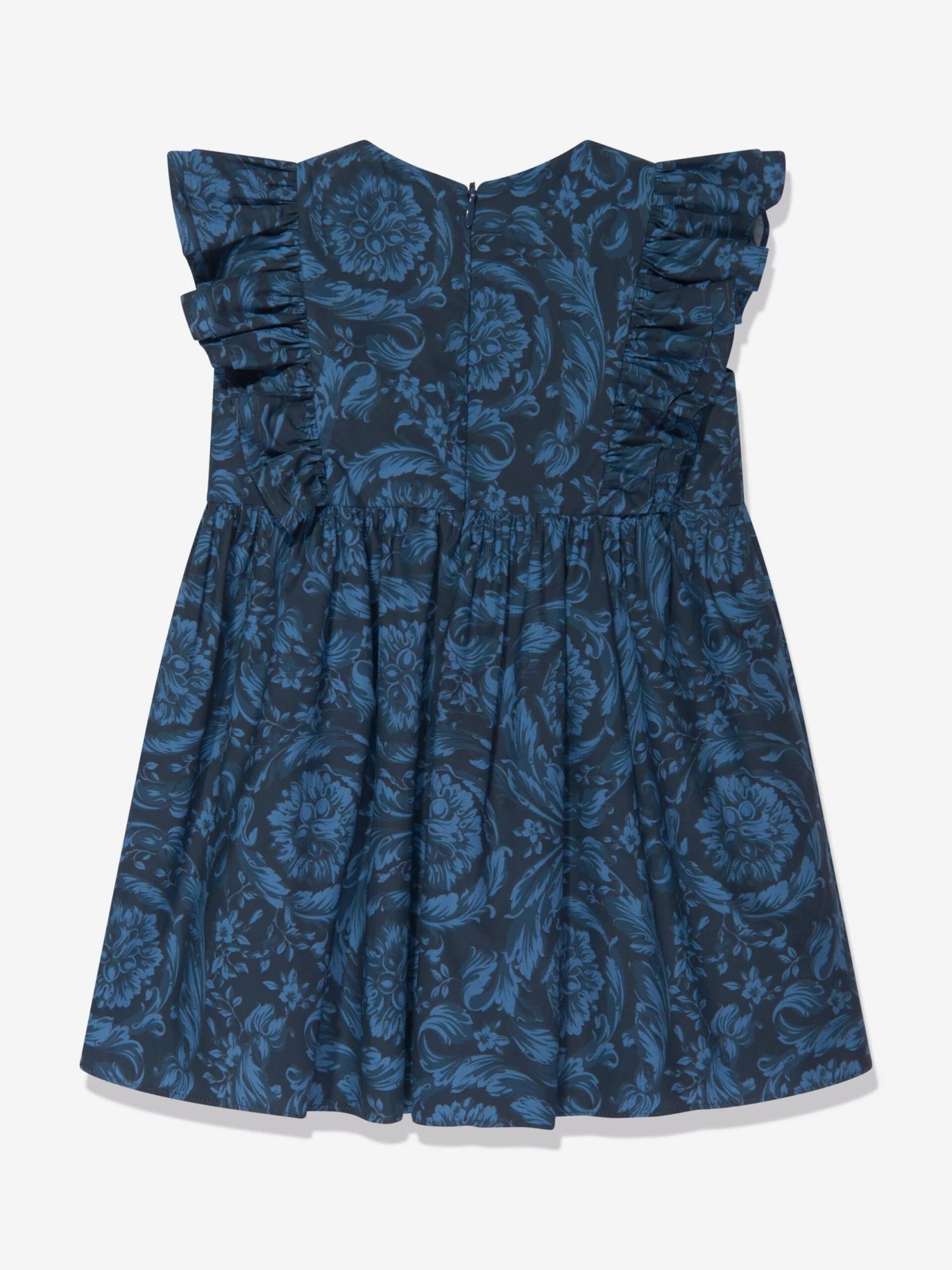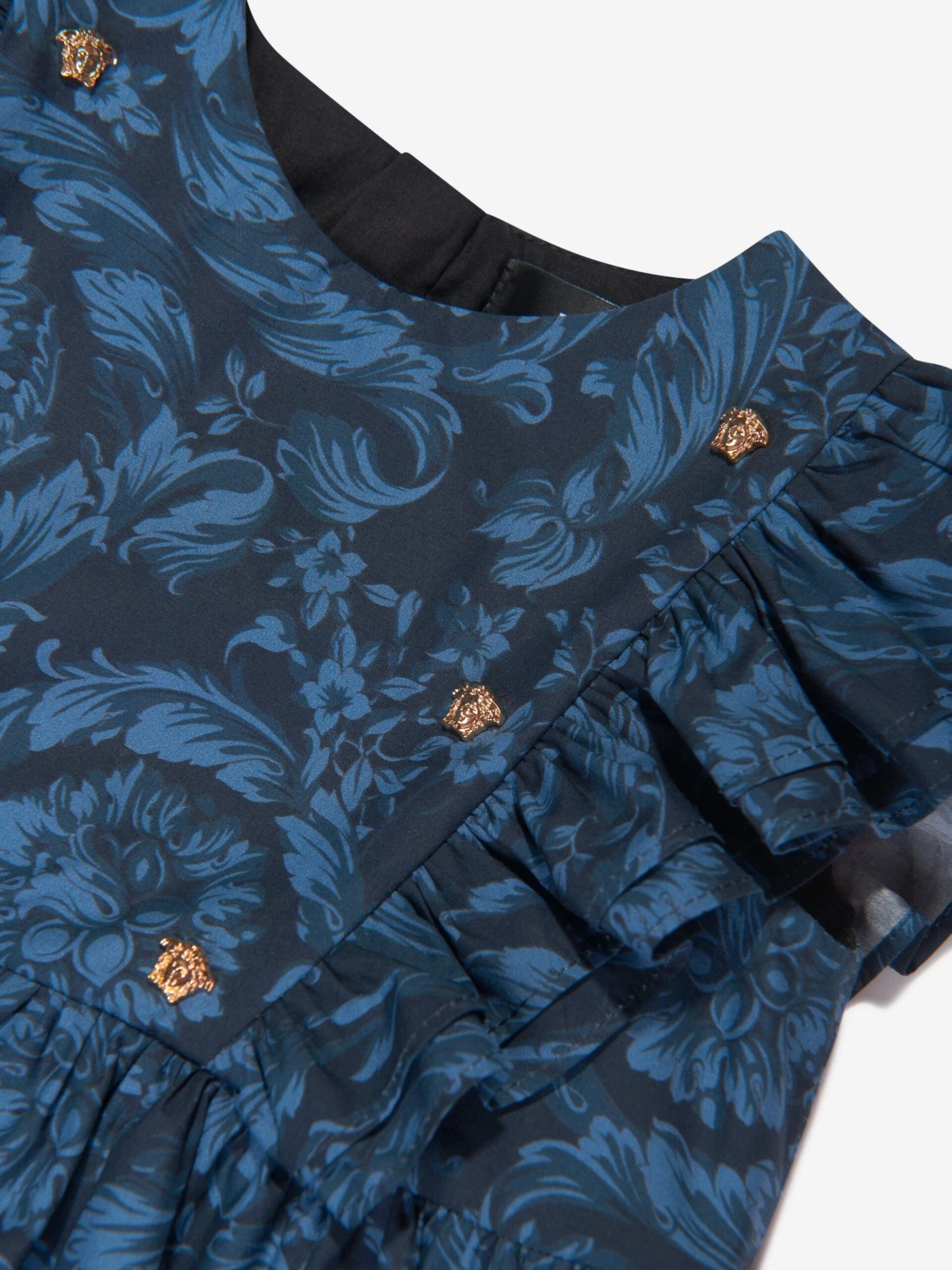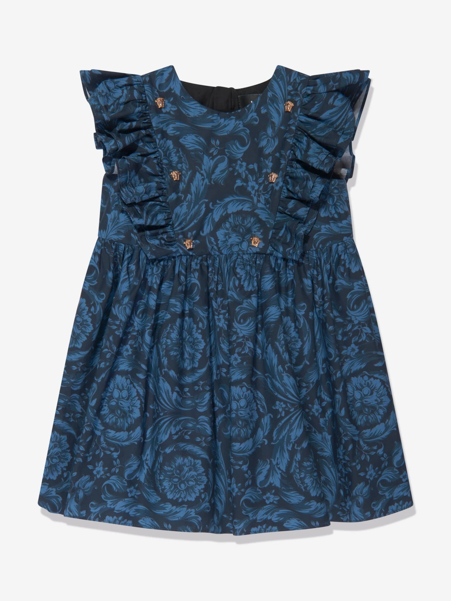 Versace depict extraordinary precision in their immaculate designs. This baby girls navy blue dress is reflective of the Italian label’s passion for Greek mythological abstracts reimagined into opulent designs. Crafted in a beautiful sleeveless design showcasing an all-over Barocco Kids print which is accented by Medusa studs at the front and complete with ruffle trims.