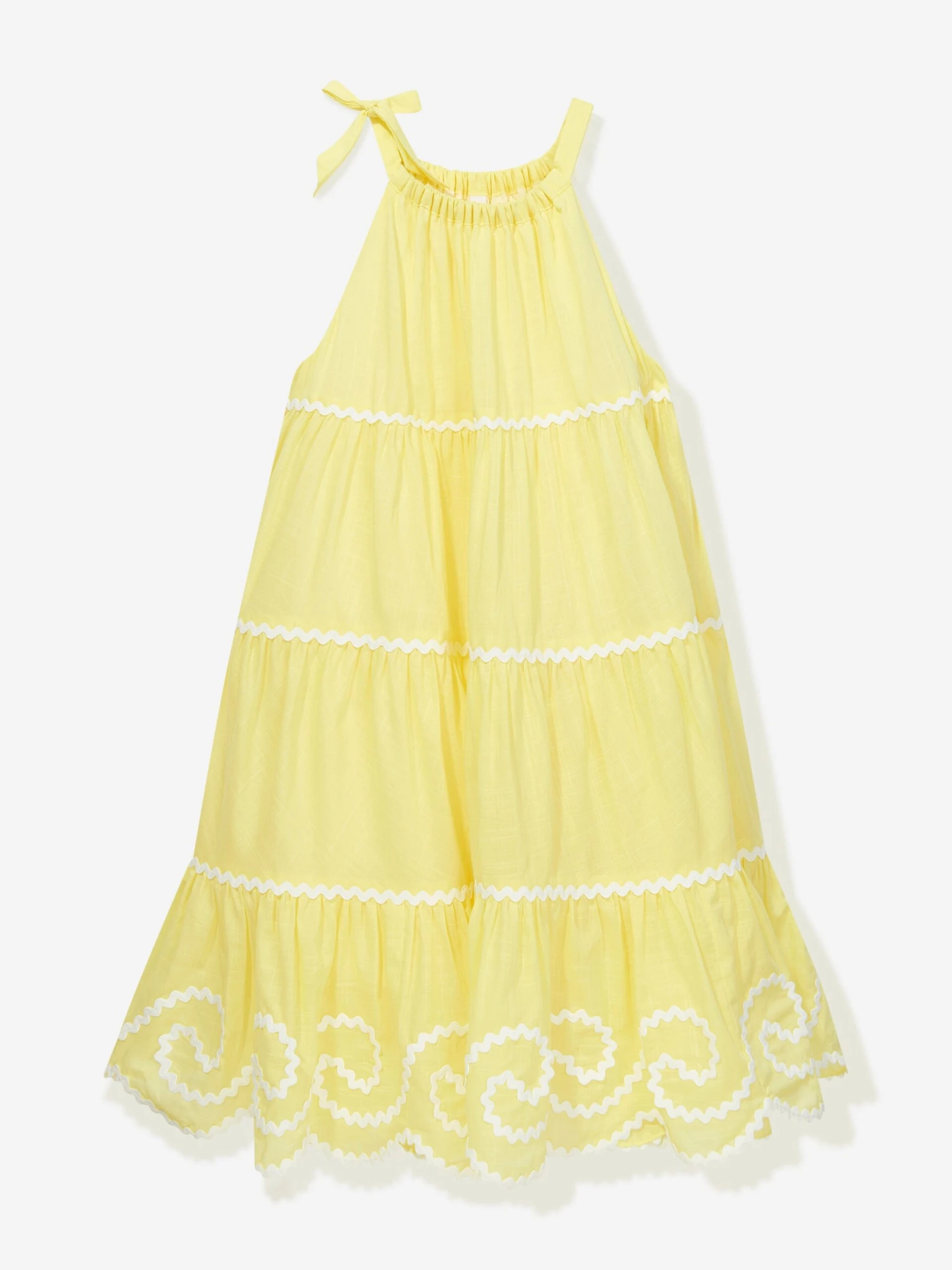 Australian label Zimmermann deconstruct the trend principle by exploring distinctive avenues of colour and craftsmanship. This yellow halter dress is depicted in a tiered sleeveless design with a scalloped hem and crochet frill embellishments. Both sweet and reminiscent of sunlight, she will be the muse of the evening.